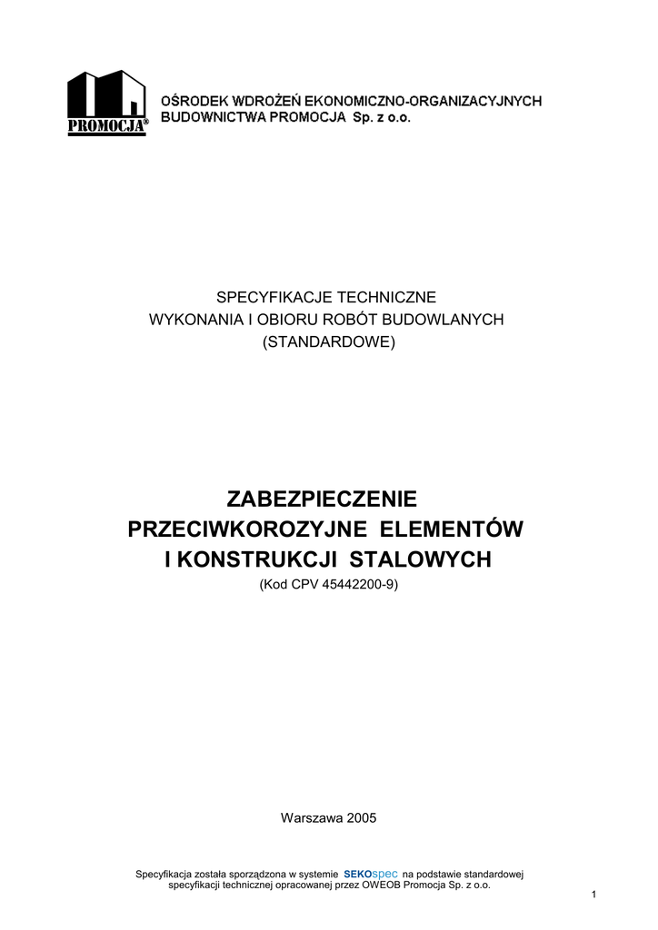 SPECYFIKACJE TECHNICZNE WYKONANIA I OBIORU ROBÓT BUDOWLANYCH (STANDARDOWE) ZABEZPIECZENIE PRZECIWKOROZYJNE ELEMENTÓW I KONSTRUKCJI STALOWYCH (Kod CPV 45442200-9) Warszawa 2005 Specyfikacja została sporządzona w systemie SEKOspec SEKOspec na podstawie standardowej specyfikacji technicznej OWEOB opracowanej Promocjaprzez Sp. zOWEOB o.o. 2005Promocja Sp. z o.o. 1 SPIS TREŚCI 1. CZĘŚĆ OGÓLNA ............................................................................................ 3 1.1. Nazwa nadana zamówieniu przez zamawiającego ................................. 3 1.2. Przedmiot ST ......................................................................................... 3 1.3. Zakres stosowania ST ........................................................................... 3 1.4. Przedmiot i zakres robót objętych ST .................................................... 3 1.5. Określenia podstawowe, definicje .......................................................... 3 1.6.Ogólne wymagania dotyczące robót ....................................................... 4 1.7. Dokumentacja robót malarskich ............................................................. 4 1.8. Nazwy i kody ........................................................................................... 6 2. WYMAGANIA DOTYCZĄCE WŁAŚCIWOŚCI MATERIAŁÓW ...................... 6 3. WYMAGANIA DOTYCZĄCE SPRZĘTU, MASZYN I NARZĘDZI ................. 14 4. WYMAGANIA DOTYCZĄCE TRANSPORTU ............................................... 14 5. WYMAGANIA DOTYCZĄCE WYKONANIA ROBÓT .................................... 15 6. KONTROLA JAKOŚCI ROBÓT ..................................................................... 23 7. WYMAGANIA DOTYCZĄCE PRZEDMIARU I OBMIARU ROBÓT ............... 27 8. SPOSÓB ODBIORU ROBÓT ........................................................................ 28 9. PODSTAWA ROZLICZENIA ROBÓT ........................................................... 31 10. DOKUMENTY ODNIESIENIA ..................................................................... 32 Najważniejsze oznaczenia i skróty: ST – Specyfikacja Techniczna SST – Szczegółowa Specyfikacja Techniczna ITB – Instytut Techniki Budowlanej PZJ – Program Zabezpieczenia Jakości Jednostka autorska, opracowanie edytorskie i rozpowszechnianie: Ośrodek Wdrożeń Ekonomiczno-Organizacyjnych Budownictwa „Promocja” Sp. z o.o. 02-548 Warszawa, ul. Grażyny 15, tel. (22) 440-84-00, fax (22) 440-84-01 www.sekocenbud.pl e-mail: [email protected] ISBN 83-89756-22-6 Copyright by OWEOB PROMOCJA Sp. z o.o. Warszawa, 2005 Wszelkie prawa zastrzeżone! Wykorzystanie treści niniejszej specyfikacji technicznej dozwolone jest wyłącznie do przygotowania dokumentacji budowlanej. Kopiowanie, przedrukowywanie i rozpowszechnianie całości lub fragmentów niniejszej publikacji w celach komercyjnych bez pisemnej zgody wydawcy zabronione. Specyfikacja została sporządzona w systemie SEKOspec SEKOspec na podstawie standardowej specyfikacji technicznej OWEOB opracowanej Promocjaprzez Sp. zOWEOB o.o. 2005Promocja Sp. z o.o. 2 1. CZĘŚĆ OGÓLNA 1.1. Nazwa nadana zamówieniu przez zamawiającego Budowa tarasu zewnętrznego przy basenie krytym OSiR w Zawierciu działka nr. ew 96/3, 96/4 (k.m.54 obręb Zawiercie); ul. Pomorska 61 42 - 400 Zawiercie, inwestor_ Ośrodek Sportu i Rekreacji - Zawiercie, ul. Moniuszki 10, 42-400 Zawiercie 1.2. Przedmiot ST Przedmiotem niniejszej standardowej specyfikacji technicznej (ST) są wymagania dotyczące wykonania i odbioru robót przeciwkorozyjnych elementów i konstrukcji stalowych. 1.3. Zakres stosowania ST Standardowa specyfikacja techniczna (ST) stanowi podstawę opracowania szczegółowej specyfikacji technicznej (SST) stosowanej jako dokument przetargowy i kontraktowy przy zlecaniu i realizacji robót wymienionych w pkt. 1.2. Projektant sporządzający dokumentację projektową i odpowiednie szczegółowe specyfikacje techniczne wykonania i odbioru robót budowlanych może wprowadzać do niniejszej standardowej specyfikacji zmiany, uzupełnienia lub uściślenia, odpowiednie dla przewidzianych projektem robót, uwzględniające wymagania Zamawiającego oraz konkretne warunki realizacji robót, niezbędne do uzyskania wymaganego standardu i jakości tych robót. Odstępstwa od wymagań podanych w niniejszej specyfikacji mogą mieć miejsce tylko w przypadkach prostych robót o niewielkim znaczeniu, dla których istnieje pewność, że podstawowe wymagania będą spełnione przy zastosowaniu metod wykonania wynikających z doświadczenia oraz uznanych reguł i zasad sztuki budowlanej. 1.4. Przedmiot i zakres robót objętych ST Specyfikacja dotyczy wszystkich robót wykonywanych na budowie mających na celu zabezpieczenie antykorozyjne elementów i konstrukcji stalowych, nie dotyczy natomiast czynności wykonywanych w wytwórni. Przedmiotem opracowania jest określenie wymagań odnośnie właściwości materiałów, wymagań w zakresie przygotowania powierzchni i sposobów oceny podłoży, wymagań dotyczących wykonania powłok przeciwkorozyjnych oraz ich odbiorów. Wymagania te podano dla elementów i konstrukcji stalowych: – zabezpieczanych całkowicie na budowie, – zabezpieczanych powłokami gruntowymi w wytwórni i malowanych wyrobami malarskimi na budowie, – zabezpieczanych systemami malarskimi w wytwórni i ostatecznie malowanych na budowie, – zabezpieczanych powłokami metalowymi. 1.5. Określenia podstawowe, definicje Określenia podane w niniejszej Specyfikacji są zgodne z odpowiednimi normami oraz określeniami podanymi w ST „Wymagania ogólne” Kod CPV 45000000-7, pkt 1.4. Dodatkowo w Specyfikacji używane są następujące terminy: Podłoże – powierzchnia, na którą nakłada się lub już nałożono wyrób lakierowy. Specyfikacja została sporządzona w systemie SEKOspec SEKOspec na podstawie standardowej specyfikacji technicznej OWEOB opracowanej Promocjaprzez Sp. zOWEOB o.o. 2