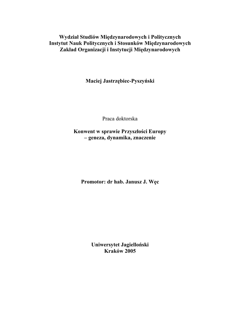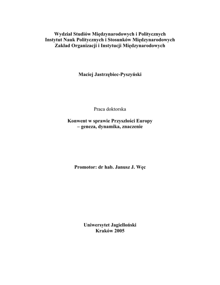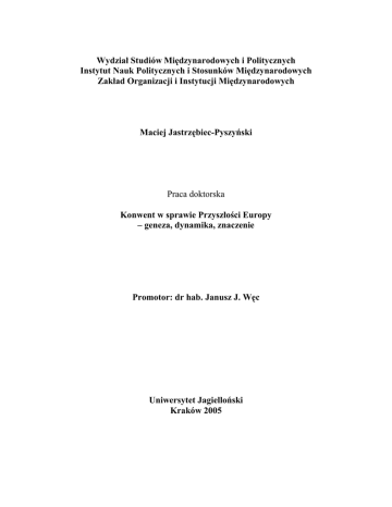Wydział Studiów Międzynarodowych i Politycznych Instytut Nauk Politycznych i Stosunków Międzynarodowych Zakład Organizacji i Instytucji Międzynarodowych Maciej Jastrzębiec-Pyszyński Praca doktorska Konwent w sprawie Przyszłości Europy – geneza, dynamika, znaczenie Promotor: dr hab. Janusz J. Węc Uniwersytet Jagielloński Kraków 2005 Spis treści Wykaz używanych skrótów....................................................................................................... 4 Wstęp........................................................................................................................................... 5 Cele badawcze i struktura pracy ................................................................................. 5 Baza źródłowa i stan badań ......................................................................................... 7 Zasadność analizy fenomenu Konwentu w sprawie Przyszłości Europy............... 10 Rozdział I Konwent a teoria integracji............................................................................ 12 1. Teoria federalizmu i idea państwa .................................................................... 13 2. Dylematy legitymacji .......................................................................................... 19 3. Jak opisać rzeczywistość UE? ............................................................................ 24 4. Orientacja teorii na proces. Nowy instytucjonalizm ....................................... 26 5. Koncepcje Konwentu (mapy umysłowe)........................................................... 36 6. Podsumowanie..................................................................................................... 48 Rozdział II. Organy przygotowawcze w historii integracji europejskiej. Doświadczenia pierwszego Konwentu................................................................................................. 49 1. Najważniejsze organy przygotowawcze............................................................ 50 2. Doświadczenia pierwszego Konwentu............................................................... 61 3. Podsumowanie..................................................................................................... 81 Rozdział III. Procesy poprzedzające powołanie Konwentu w sprawie Przyszłości Europy .................................................................................................................................................... 84 1. Tło polityczne deklaracji w sprawie przyszłości Unii...................................... 84 2. Przemówienie Joschki Fischera i jego reperkusje ........................................... 88 3. Deklaracja w sprawie przyszłości Unii (2000). Formuła debaty .................... 92 4. Reakcja na wyniki szczytu w Nicei.................................................................... 94 5. Przygotowanie, kształt i znaczenie deklaracji z Laeken................................ 106 6. Podsumowanie................................................................................................... 126 Rozdział IV. Obrady Konwentu w sprawie Przyszłości Europy ................................ 128 1. Problem ujęcia prac Konwentu ....................................................................... 128 2. Ukonstytuowanie się Konwentu....................................................................... 129 3. Faza słuchania ................................................................................................... 145 4. Faza studiowania............................................................................................... 154 5. Dyskusja o kształcie dokumentu końcowego Konwentu............................... 162 6. Problem instytucji............................................................................................. 168 7. Tworzenie projektu Traktatu .......................................................................... 172 8. Podsumowanie................................................................................................... 179 Rozdział V. Reakcje polityczne. Próby teoretycznego ujęcia prac Konwentu............. 182 1. Wpływ Konwentu na dalszą agendę polityki europejskiej. .......................... 184 2. Czym był Konwent?.......................................................................................... 188 3. Analiza dyskursu w obradach Konwentu....................................................... 196 4. Kto miał wpływ na decyzje Konwentu?.......................................................... 208 5. Problem legitymacji Konwentu ....................................................................... 219 6. Podsumowanie................................................................................................... 231 Wnioski ................................................................................................................................... 232 1. Sposoby interpretacji roli Konwentu .............................................................. 232 2. Konwent jako symbol ....................................................................................... 240 2 3. Dyskurs wokół Konwentu ................................................................................ 241 4. Podsumowanie................................................................................................... 245 Kalendarium........................................................................................................................... 249 Bibliografia ............................................................................................................................. 254 I. Źródła ..................................................................................................................... 254 II. Literatura ............................................................................................................