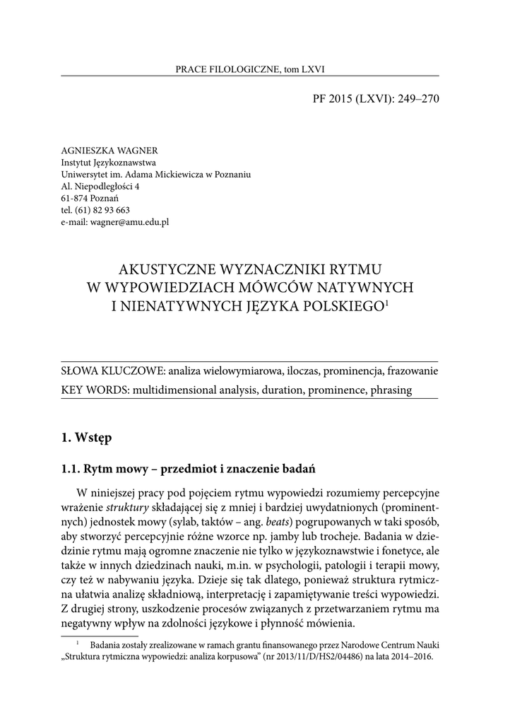 PRACE FILOLOGICZNE, tom LXVI PF 2015 (LXVI): 249–270 Agnieszka Wagner Instytut Językoznawstwa Uniwersytet im. Adama Mickiewicza w Poznaniu Al. Niepodległości 4 61-874 Poznań tel. (61) 82 93 663 e-mail: [email protected] Akustyczne wyznaczniki rytmu w wypowiedziach mówców natywnych i nienatywnych języka polskiego1 SŁOWA KLUCZOWE: analiza wielowymiarowa, iloczas, prominencja, frazowanie KEY WORDS: multidimensional analysis, duration, prominence, phrasing 1. Wstęp 1.1. Rytm mowy – przedmiot i znaczenie badań W niniejszej pracy pod pojęciem rytmu wypowiedzi rozumiemy percepcyjne wrażenie struktury składającej się z mniej i bardziej uwydatnionych (prominentnych) jednostek mowy (sylab, taktów – ang. beats) pogrupowanych w taki sposób, aby stworzyć percepcyjnie różne wzorce np. jamby lub trocheje. Badania w dziedzinie rytmu mają ogromne znaczenie nie tylko w językoznawstwie i fonetyce, ale także w innych dziedzinach nauki, m.in. w psychologii, patologii i terapii mowy, czy też w nabywaniu języka. Dzieje się tak dlatego, ponieważ struktura rytmiczna ułatwia analizę składniową, interpretację i zapamiętywanie treści wypowiedzi. Z drugiej strony, uszkodzenie procesów związanych z przetwarzaniem rytmu ma negatywny wpływ na zdolności językowe i płynność mówienia. Badania zostały zrealizowane w ramach grantu finansowanego przez Narodowe Centrum Nauki „Struktura rytmiczna wypowiedzi: analiza korpusowa” (nr 2013/11/D/HS2/04486) na lata 2014–2016. 1 250 Agnieszka Wagner Znaczna część dotychczasowych badań nad rytmem pozostaje pod wpływem hipotezy o rytmicznej klasyfikacji języków, która ma swe źródło w obserwacji, że różne języki posiadają percepcyjnie różne rytmy. Zgodnie z tą hipotezą języki można przyporządkować do jednej z trzech kategorii: rytmu sylabicznego (np. język hiszpański, włoski), rytmu akcentowego (niemiecki, angielski) lub rytmu opartego na morach (japoński). Tradycyjne badania rytmu (Pike 1946; Abercrombie 1967) szukały potwierdzenia tej hipotezy w izochronizmie, który zakładał, że w językach o rytmie sylabicznym/akcentowym/opartym na morze sylaby/stopy/mory powinny mieć ten sam iloczas. Ponieważ nie udało się potwierdzić empirycznie istnienia izochronizmu, źródeł percepcyjnych różnic między rytmami języków zaczęto szukać w ich fonetyce i fonologii (Dauer 1987). Status rytmiczny języka polskiego pozostaje jak dotąd nieustalony. Ogólnie rzecz biorąc, język polski wykazuje cechy fonologiczne charakterystyczne dla języków o obu typach rytmu – sylabicznego, m.in. stała pozycja akcentu wyrazowego, brak redukcji samogłosek nieakcentowanych, i akcentowego, m.in. obecność sylab o złożonej strukturze fonotaktycznej, znaczący udział iloczasu w realizacji akcentu nuklearnego i frazowania (Jassem 1962; Richter 1987; Demenko 1999; Klessa 2006; Wagner 2008b; Malisz 2013). Istnienie języków takich jak język polski, o rytmach niedających się łatwo sklasyfikować, było kolejną (po braku empirycznego potwierdzenia hipotezy izochronizmu) przyczyną pojawienia się nowych koncepcji rytmu – rytmicznego kontinuum (Dauer 1987) oraz rytmów współistniejących (Nolan, Asu 2009). Obecnie panuje pogląd, że nie powinno się stawiać znaku równości między rytmem a wzorcami czasowymi (Arvaniti 2009), ponieważ w produkcji i percepcji rytmu znaczenie mają także czynniki inne niż iloczas, jak wysokość tonu (intonacja), intensywność czy też tempo mowy, za pomocą których realizowane są struktura rytmiczna (metrum) i grupowanie, związane kolejno z prominencją i frazowaniem. Akustyczna realizacja prominencji i frazowania jest specyficzna dla danego języka, choć ogólnie obserwuje się tendencję do wydłużania iloczasu w przypadku sylab prominentnych i na granicy fraz prozodycznych (Beckman, Edwards 1994; Turk, White 1999; Wightman i in. 1992; Yoon i in. 2007; Wagner 2010). Dotychczasowe badania dla języka polskiego nie są zgodne w kwestii akustycznych korelatów prominencji i frazowania: Dłuska (1950) za główny korelat prominencji związanej z akcentem wyrazowym (ang. stress) uznaje intensywność, natomiat Jassem (1962) – zmiany wysokości tonu. Badania z ostatnich lat pokazują, że iloczas, obok wysokości tonu i intensywności, jest jednym z akustycznych korelatów prominencji (Terken 1991; Hirschberg 1993; Portele 1998; Tamburini 2003; Sridhar i in. 2008; Rosenberg 2009), i że zróżnicowanie iloczasu jest mniejsze w przypadku prominencji niższego poziomu, związanych z akcentem wyrazowym (ang. stress) niż wyższego poziomu, związanych z akcentem melodycznym (ang. pitch accent) i frazowym (Klessa 2006; Demenko 1999; Wagner 2008b; Wagner 2012; Malisz, Wagner 2012; Klessa 2012). Granice fraz Akustyczne wyznaczniki rytmu w wypowiedziach mówców natywnych i nienatywnych… 251 prozodycznych są sygnalizowane głównie za pomocą wydłużenia iloczasu sylaby o końcowej pozycji we frazie i jej samogłoski oraz samogłoski sylaby o przedostatniej pozycji we frazie, na którą najczęściej przypada akcent nuklearny (Wagner 2008b). Parametry w dziedzinie częstotliwości podstawowej (f0) opisujące średni poziom, kształt przebiegu zmian i zróżnicowanie wysokości tonu również odgrywają tutaj ważną rolę (Wagner 2010). Podobne obserwacje odnośnie udziału cech w dziedzinie iloczasu i f0 w realizacji granic fraz prozodycznych poczyniono także dla innych języków (Carlson i in. 2005; Kim i in. 2008; Aguilar i in. 2009). Omawiane tutaj zjawiska mają kluczowe znaczenie dla rozumienia pojęcia rytmu mowy oraz dla założeń metodologicznych przyszłych badań w dziedzinie rytmu i prozodii. 1.2. Cel pracy Niniejsza praca porusza zagadnienia związane z rytmem wypowiedzi w języku polskim, które dotychczas nie były badane wcale lub tylko w ograniczonym zakresie. Przedmiotem analiz przedstawionych w dalszej części pracy była identyfikacja akustycznych