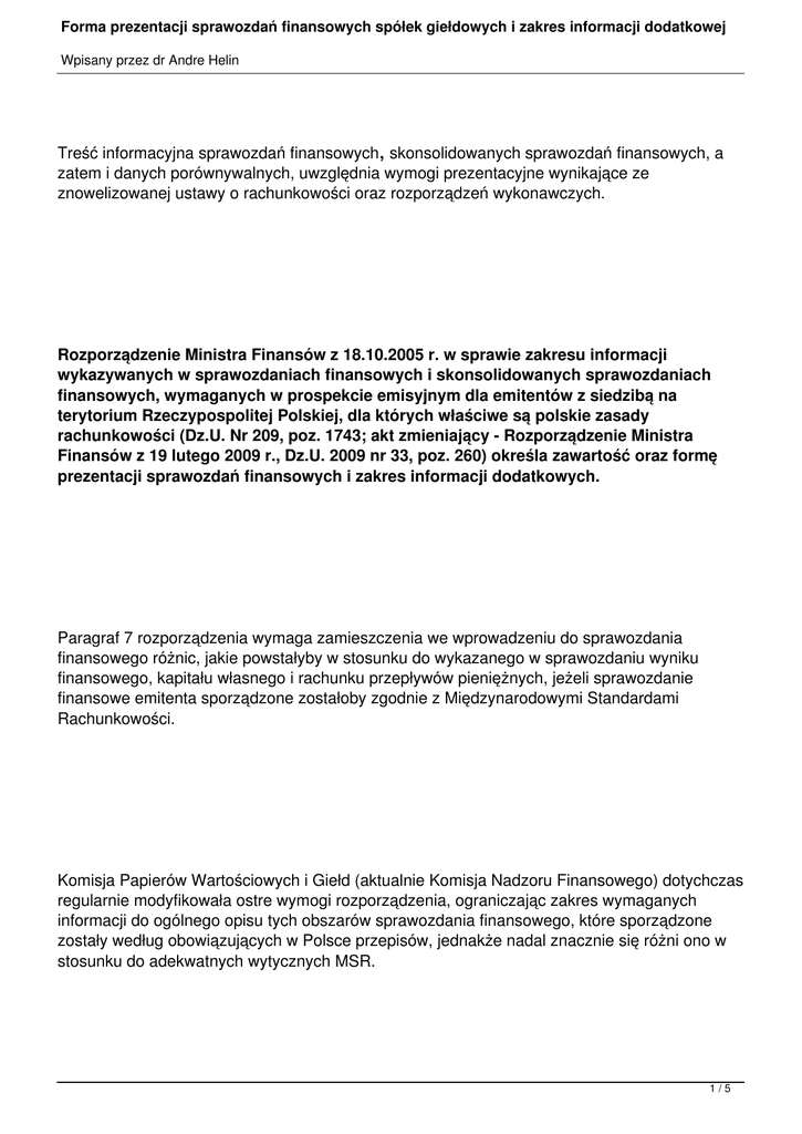 Forma prezentacji sprawozdań finansowych spółek giełdowych i zakres informacji dodatkowej Wpisany przez dr Andre Helin Treść informacyjna sprawozdań finansowych, skonsolidowanych sprawozdań finansowych, a zatem i danych porównywalnych, uwzględnia wymogi prezentacyjne wynikające ze znowelizowanej ustawy o rachunkowości oraz rozporządzeń wykonawczych. Rozporządzenie Ministra Finansów z 18.10.2005 r. w sprawie zakresu informacji wykazywanych w sprawozdaniach finansowych i skonsolidowanych sprawozdaniach finansowych, wymaganych w prospekcie emisyjnym dla emitentów z siedzibą na terytorium Rzeczypospolitej Polskiej, dla których właściwe są polskie zasady rachunkowości (Dz.U. Nr 209, poz. 1743; akt zmieniający - Rozporządzenie Ministra Finansów z 19 lutego 2009 r., Dz.U. 2009 nr 33, poz. 260) określa zawartość oraz formę prezentacji sprawozdań finansowych i zakres informacji dodatkowych. Paragraf 7 rozporządzenia wymaga zamieszczenia we wprowadzeniu do sprawozdania finansowego różnic, jakie powstałyby w stosunku do wykazanego w sprawozdaniu wyniku finansowego, kapitału własnego i rachunku przepływów pieniężnych, jeżeli sprawozdanie finansowe emitenta sporządzone zostałoby zgodnie z Międzynarodowymi Standardami Rachunkowości. Komisja Papierów Wartościowych i Giełd (aktualnie Komisja Nadzoru Finansowego) dotychczas regularnie modyfikowała ostre wymogi rozporządzenia, ograniczając zakres wymaganych informacji do ogólnego opisu tych obszarów sprawozdania finansowego, które sporządzone zostały według obowiązujących w Polsce przepisów, jednakże nadal znacznie się różni ono w stosunku do adekwatnych wytycznych MSR. 1/5 Forma prezentacji sprawozdań finansowych spółek giełdowych i zakres informacji dodatkowej Wpisany przez dr Andre Helin W przypadku grupy kapitałowej, we wprowadzeniu do sprawozdania finansowego należy określić m.in. skład grupy kapitałowej oraz zastosowane zasady konsolidacji: - skonsolidowany bilans, pozycje pozabilansowe, skonsolidowany rachunek zysków i strat (wariant kalkulacyjny), zestawienie zmian w skonsolidowanym kapitale własnym, skonsolidowany rachunek przepływów pieniężnych (metodą pośrednią lub bezpośrednią), - noty objaśniające do rzeczowego majątku trwałego, wartości niematerialnych i prawnych, aktywów finansowych, należności długoterminowych, zapasów, rezerw, zobowiązań oraz poszczególnych pozycji rachunku zysków i strat, - dodatkowe noty objaśniające, m.in.: dotyczące instrumentów finansowych, aktywów i zobowiązań warunkowych, przychodów, kosztów i inwestycji dotyczących działalności zaniechanej lub w trakcie zaniechania oraz szczegółowego opisu skutków finansowych dotyczących zmian w zastosowanych zasadach rachunkowości, - dodatkowe informacje i objaśnienia w skonsolidowanym sprawozdaniu finansowym holdingu finansowego. W porównaniu z ustawą o rachunkowości zakres wymaganych informacji dodatkowych jest znaczny, aczkolwiek znowelizowana ustawa w pewnym stopniu zmniejsza dotychczas występujące rozbieżności. Szeroki zakres informacji zawiera ryzyko obowiązku opublikowania informacji ze szkodą dla jednostki sprawozdawczej, zwłaszcza w sytuacji, kiedy publikowane dane mogą być wykorzystane przez konkurencję. Artykuł 57 ustawy z 29.7.2005 r. o ofercie publicznej i warunkach wprowadzania instrumentów finansowych do zorganizowanego systemu obrotu oraz o spółkach publicznych (Dz.U. Nr 184, poz. 1539 ze zm.) przewiduje, że w przypadku, w którym obowiązkowe przekazanie danych mogłoby naruszyć słuszny interes emitenta, wymagane informacje emitent może przekazać 2/5 Forma prezentacji sprawozdań finansowych spółek giełdowych i zakres informacji dodatkowej Wpisany przez dr Andre Helin wyłącznie KNF wraz z wnioskiem o zwolnienie go z obowiązku przekazania informacji do publicznej wiadomości. Rozporządzenie wprowadziło niezbędne zmiany dostosowawcze do wyżej wymienionych przepisów, mające wpływ na zakres i treść raportów okresowych i skonsolidowanych raportów okresowych przekazywanych przez emitentów do publicznej wiadomości, wynikające m.in. ze zmiany definicji „grupy kapitałowej", a poprzez to również obowiązku w zakresie konsolidacji sprawozdań finansowych jednostek. W rozporządzeniu zamieszczono definicję „jednostek podporządkowanych", wynikającą ze znowelizowanej ustawy o rachunkowości, rozszerzając katalog definicji, zawartych w rozporządzeniu o obowiązkach informacyjnych, odnoszących się do powiązań pomiędzy jednostkami. Rozporządzenie zawiera ponadto zmianę umożliwiającą emitentom zagranicznym nieprzekazywanie do publicznej wiadomości raportów okresowych, jeżeli emitent przekazuje skonsolidowane raporty okresowe, o ile nie sporządza jednostkowych sprawozdań finansowych zgodnie z wymaganymi dla ich sporządzenia standardami, określonymi w rozporządzeniu o obowiązkach informacyjnych. Zastosowanie przepisów znowelizowanego rozporządzenia o obowiązkach informacyjnych, odnoszących się w kwestii zakresu informacyjnego sprawozdań finansowych, zawartych w raportach okresowych (tak jak dotychczas) do znowelizowanego rozporządzenia o sprawozdaniach finansowych w prospekcie, określającego nowe zakresy informacyjne sprawozdań finansowych, skonsolidowanych sprawozdań finansowych i danych porównywalnych - począwszy od okresów sprawozdawczych roku obrotowego (roku budżetowego) rozpoczętego w 2002 r., spowodowane jest znaczącymi zmianami w rachunkowości poszczególnych grup emitentów, wprowadzonymi przepisami znowelizowanej ustawy o rachunkowości oraz rozporządzeń wykonawczych do niej, które weszły w życie 1.1.2002 r. 3/5 Forma prezentacji sprawozdań finansowych spółek giełdowych i zakres informacji dodatkowej Wpisany przez dr Andre Helin Zakresy informacyjne sprawozdań finansowych, skonsolidowanych sprawozdań finansowych i danych porównywalnych, uwzględniające s