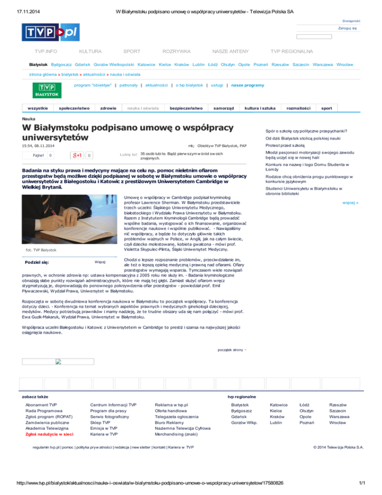 17.11.2014 W Białymstoku podpisano umowę o współpracy uniwersytetów - Telewizja Polska SA Dostępność Zaloguj się TVP.INFO KULTURA SPORT ROZRYWKA NASZE ANTENY TVP REGIONALNA Białystok Bydgoszcz Gdańsk Gorzów Wielkopolski Katowice Kielce Kraków Lublin Łódź Olsztyn Opole Poznań Rzeszów Szczecin Warszawa Wrocław strona główna » białystok » aktualności » nauka i oświata program "obiektyw" | patronaty | aktualności | o tvp białystok | usługi | nasze programy wszystkie społeczeństwo zdrowie nauka i oświata bezpieczeństwo samorząd kultura i sztuka rozmaitości sport pogoda Nauka W Białymstoku podpisano umowę o współpracy uniwersytetów Spór o szkołę czy polityczne przepychanki? 15:54, 08.11.2014 Protest przed szkołą Fajne! 0 Od dziś Białystok stolicą polskiej nauki mk; Obiektyw TVP Białystok, PAP Młodzi pasjonaci motoryzacji swojego zawodu będą uczyć się w nowej hali Lubię to! 35 osób lubi to. Bądź pierw szym w śród sw oich znajomych. 0 Badania na styku prawa i medycyny mające na celu np. pomoc nieletnim ofiarom przestępstw będą możliwe dzięki podpisanej w sobotę w Białymstoku umowie o współpracy uniwersytetów z Białegostoku i Katowic z prestiżowym Uniwersytetem Cambridge w Wielkiej Brytanii. Umowę o współpracy w Cambridge podpisał kryminolog profesor Lawrence Sherman. W Białymstoku przedstawiciele trzech uczelni: Śląskiego Uniwersytetu Medycznego, białostockiego i Wydziału Prawa Uniwersytetu w Białymstoku. Razem z Instytutem Kryminologii Cambridge będą prowadzić wspólne badania, występować o ich finansowanie, organizować konferencje naukowe i wspólnie publikować. - Nawiązaliśmy nić współpracy, a będzie to dotyczyło głównie takich problemów ważnych w Polsce, w Anglii, jak na całym świecie, czyli dziecko molestowane, kobieta gwałcona - mówi prof. Violetta Skypulec-Plinta, Śląski Uniwersytet Medyczny. fot. TVP Białystok Konkurs na nazwę i logo Domu Studenta w Łomży Rodzice chcą obniżenia progu punktowego w konkursie językowym Studenci Uniwersytetu w Białymstoku w obronie biblioteki więcej » Chodzi o lepsze rozpoznanie problemów, przeciwdziałanie im, ale też o lepszą opiekę medyczną i prawną nad ofiarami. Ofiary przestępstw wymagają wsparcia. Tymczasem wiele rozwiązań prawnych, w ochronie zdrowia np: ustawa kompensacyjna z 2005 roku nie służy im. - Badania kryminologiczne obnażają słabe punkty rozwiązań administracyjnych, które nie mają tej głębi. Zamiast służyć ofiarom wręcz stygmatyzują je, doprowadzają do ponownego pokrzywdzenia ofiar przestępstw - powiedział prof. Emil Pływaczewski, Wydział Prawa, Uniwersytet w Białymstoku. Podziel się: Więcej Rozpoczęta w sobotę dwudniowa konferencja naukowa w Białymstoku to początek współpracy. Ta konferencja dotyczy dzieci. - Konferencja na temat wybranych aspektów prawnych i medycznych ginekologii dziecięcej, medyków. Medycy potrzebują prawników i mamy nadzieję, że te trudne obszary uda się nam połączyć - mówi prof. Ewa Guzik-Makaruk, Wydział Prawa, Uniwersytet w Białymstoku. Współpraca uczelni Białegostoku i Katowic z Uniwersytetem w Cambridge to prestiż i szansa na najwyższej jakości osiągnięcia naukowe. początek strony zobacz także Abonament TVP Rada Programowa Zgłoś program (ROPAT) Zamówienia publiczne Akademia Telewizyjna Zgłoś nadużycie w sieci ^ tvp regionalne Centrum Informacji TVP Program dla prasy Serwis fotograficzny Sklep TVP Emisja w TVP Kariera w TVP Reklama w tvp.pl Oferta handlowa Telegazeta ogłoszenia Biuro Reklamy Naziemna Telewizja Cyfrowa Merchandising (znaki) Białystok Bydgoszcz Gdańsk Gorzów Wlkp. Katowice Kielce Kraków Lublin regulamin tvp.pl | pomoc | polityka pryw atności | redakcja | new sletter | kontakt | Kariera w TVP http://www.tvp.pl/bialystok/aktualnosci/nauka-i-oswiata/w-bialymstoku-podpisano-umowe-o-wspolpracy-uniwersytetow/17580826 Łódź Olsztyn Opole Poznań Rzeszów Szczecin Warszawa Wrocław © 2014 Telew izja Polska S.A. 1/1