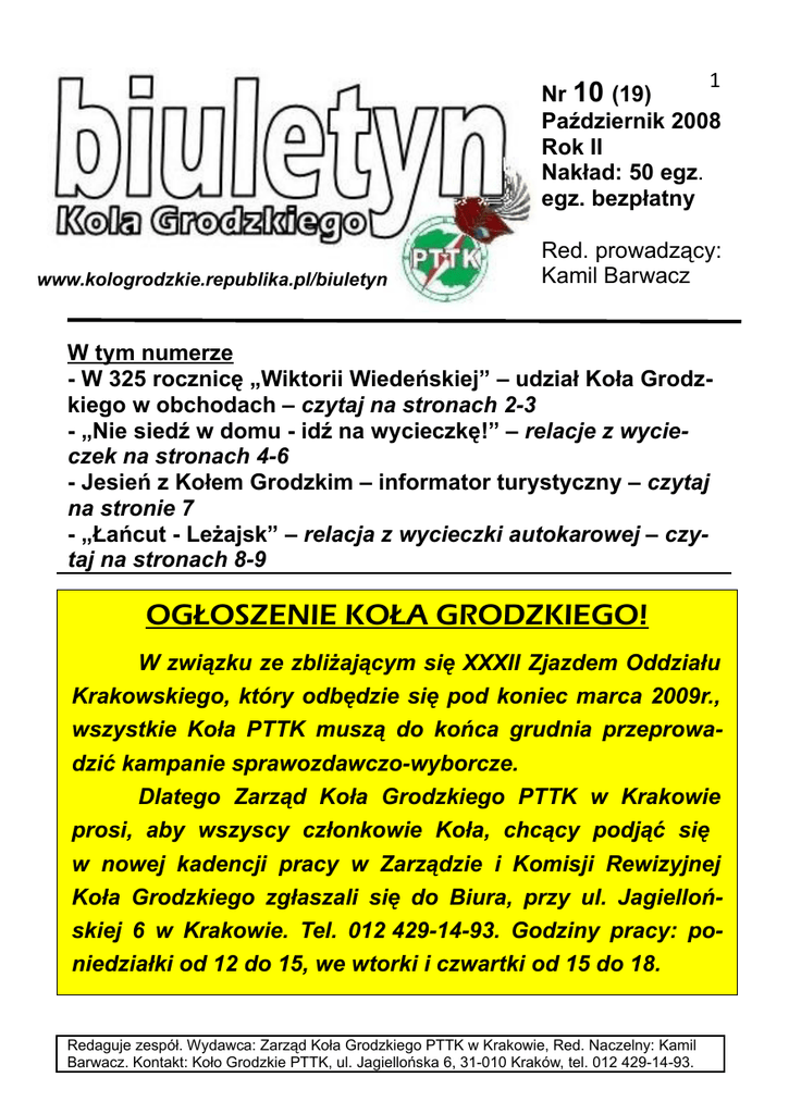 1 Nr 10 (19) Październik 2008 Rok II Nakład: 50 egz. egz. bezpłatny www.kologrodzkie.republika.pl/biuletyn Red. prowadzący: Kamil Barwacz W tym numerze - W 325 rocznicę „Wiktorii Wiedeńskiej” – udział Koła Grodzkiego w obchodach – czytaj na stronach 2-3 - „Nie siedź w domu - idź na wycieczkę!” – relacje z wycieczek na stronach 4-6 - Jesień z Kołem Grodzkim – informator turystyczny – czytaj na stronie 7 - „Łańcut - Leżajsk” – relacja z wycieczki autokarowej – czytaj na stronach 8-9 OGŁOSZENIE KOŁA GRODZKIEGO! W związku ze zbliżającym się XXXII Zjazdem Oddziału Krakowskiego, który odbędzie się pod koniec marca 2009r., wszystkie Koła PTTK muszą do końca grudnia przeprowadzić kampanie sprawozdawczo-wyborcze. Dlatego Zarząd Koła Grodzkiego PTTK w Krakowie prosi, aby wszyscy członkowie Koła, chcący podjąć się w nowej kadencji pracy w Zarządzie i Komisji Rewizyjnej Koła Grodzkiego zgłaszali się do Biura, przy ul. Jagiellońskiej 6 w Krakowie. Tel. 012 429-14-93. Godziny pracy: poniedziałki od 12 do 15, we wtorki i czwartki od 15 do 18. Redaguje zespół. Wydawca: Zarząd Koła Grodzkiego PTTK w Krakowie, Red. Naczelny: Kamil Barwacz. Kontakt: Koło Grodzkie PTTK, ul. Jagiellońska 6, 31-010 Kraków, tel. 012 429-14-93. 2 NR 10 (19) ● PAŹDZIERNIK 2008 BIULETYN W 325 rocznicę „Wiktorii Wiedeńskiej” W tym roku przypadła rocznica 325-lecia bitwy pod Wiedniem. Bitwa była jednym z najbardziej znaczących zwycięstw w historii oręża polskiego. Pokonanie Turków - pogan” przez króla Jana III Sobieskiego pod Wiedniem w 1693 roku odbiło się szerokim echem nie tylko w Polsce, ale w całej ówczesnej Europie. Jan III Sobieski, główny zwycięzca został doceniony i przez stolicę apostolską i przez możnych Europy. 325-rocznicę tego wydarzenia uczcili mieszkańcy Krakowa zainspirowani przez Urząd Miasta – Wydział Promocji i Turystyki. Koło Grodzkie miało również swój znaczący udział. 12 września, w sam dzień „wiedeńskiej walki” przewodnicy krakowscy, poszerzając jakoby akcję „Zdobywamy Odznakę Przyjaciela Krakowa” oprowadzali wszystkich chętnych - krakowian i nie tylko krakowian - „Szlakiem Jana III Sobieskiego po Krakowie”. Siedmiu przewodników w dwóch turach Więcej na www.kologrodzkie.republika.pl/ebiuletyn KOŁA GRODZKIEGO NR 10 (19) ● PAŹDZIERNIK 2008 3 pokazało miejsca i pamiątki po „wiktorii”. Kościoły i klasztory wystawiły specjalnie z tej okazji eksponaty, które na co dzień znajdują się w skarbcach. Nie zdziwiła zatem obecność straży miejskiej (w pełnej gali), strzegącej tych najcenniejszych. M.in. w kościele Mariackim pokazano szkatułkę srebrną w kształcie kufla z namiotu wielkiego Wezyra (dar króla Jana Sobieskiego dla świątyni mariackiej) , u oo. Dominikanów portrety matki królewskiej, Teofili, i brata, Marka Sobies-kiego oraz kapę z fundacji Teofili Sobieskiej, w kościele oo. Karmelitów „Na Piasku”: kaplicę M.B. Piaskowej, malowidła w krużgankach , mini-muzeum, w którym pamiątki „wiedeńskie” … i wiele innych. Szlakiem „Sobieskiego” podążyło około 250 chętnych. Bogumiła Zając Więcej na www.kologrodzkie.republika.pl/ebiuletyn 4 NR 10 (19) ● PAŹDZIERNIK 2008 BIULETYN „NIE SIEDŹ W DOMU, IDŹ NA WYCIECZKĘ” AKTUALNOŚCI Tegoroczny sezon akcji „Nie siedź w domu, idź na wycieczkę” nieubłagalnie chyli się ku końcowi. Przed nami ostatnie sobotnie i niedzielne wypady za Kraków. W trakcie ich trwania odwiedzimy jeszcze m.in. Jurę, gotycki zamek w Dębnie, uzdrowisko w Swoszowicach oraz podążymy szlakiem Tadeusza Kościuszki.. Wybierzemy się również w góry – na Pasmo Bukowca. Sezon zakończymy w niedzielę 26 października spotykając się przy Jaskini Nietoperzowej. Do wyboru są dwie trasy z przewodnikiem – 6 i 10 km. Można również dojść na własną rękę. Na wszystkich czeka zabawa przy muzyce i ognisku – trzeba pamiętać o wzięciu kiełbasek. Początek o godz. 12. Serdecznie zapraszamy! Październikowe wycieczki to również ostatnia w tym roku szansa, aby zdobyć punkty do odznaki „Miłośnika Okolic Krakowa” (ustanowionej przez Koło Grodzkie) jak i innych odznak: Odznaki Turystyki Pieszej, odznaki „Miłośnika Jury” czy popularnego „GOT-u”. Pomimo, że pogoda o tej porze roku nie zawsze sprzyja wędrówce, zapraszamy do udziału w wycieczkach! Teraz jeszcze w ramach akcji „Nie siedź w domu, idź na wycieczkę”, a od 8 listopada na spacery po Krakowie pn. „Zdobywamy Odznakę Przyjaciela Krakowa” Kamil Barwacz „NIE SIEDŹ W DOMU, IDŹ NA WYCIECZKĘ” Ciągle pada! Słowami tej popularnej w latach 70-tych piosenki zespołu Czerwone Gitary, można by opisać wrześniową pogodę. Albo przysłowiem „Kwiecień plecień, wciąż przeplata, trochę zimy, trochę lata”, zmieniając kwiecień na wrzesień. Ale pomimo niezbyt sprzyjających warunków Więcej na www.kologrodzkie.republika.pl/ebiuletyn KOŁA GRODZKIEGO NR 10 (19) ● PAŹDZIERNIK 2008 5 atmosferycznych nie zabrakło amatorów spacerowania podkrakowskimi ścieżkami. W trakcie wrześniowych wycieczek wielokrotnie odwiedzaliśmy tereny Jury Krakowsko-Częstochowskiej. Były to: Las Wolski, dolina Naramki, tzw. Podkrakowskie wulkany, rez. Skołczanka i uroczysko Skotniki, zamek w Lipowcu oraz zalew Chechło. Na trasie naszych wędrówek znalazło się również Pogórze Świątnickie z Sieprawiem oraz rezerwaty: Kępie i Biała Góra w „dzikich” lasach tunelskich. Nie zabrakło również wycieczek górskich, podczas których zdobyliśmy Lubań (1211 m) – jeden z najwyższych szczytów Gorców, Klimas (801 m) i Zembalową (852 m) w Beskidzie Wyspowym oraz Magurkę nad Suchą Beskidzką. Astronomiczne i kalendarzowe lato dobiegło końca, mamy jesień. Już niedługo przestawimy zegar-ki na czas zimowy. Ale jesz-cze do końca października zapraszamy na piesze wy-cieczki w ramach naszej akcji 