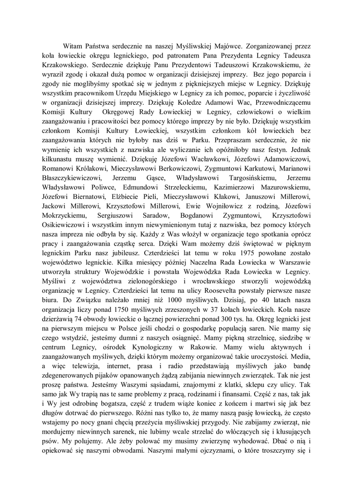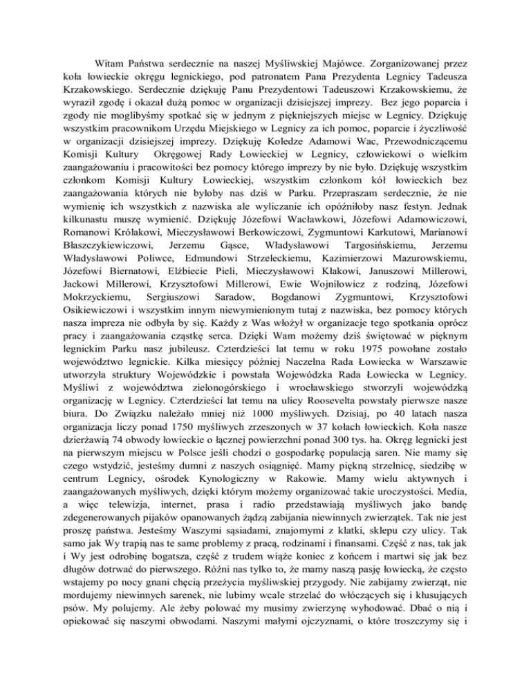 Witam Państwa serdecznie na naszej Myśliwskiej Majówce. Zorganizowanej przez koła łowieckie okręgu legnickiego, pod patronatem Pana Prezydenta Legnicy Tadeusza Krzakowskiego. Serdecznie dziękuję Panu Prezydentowi Tadeuszowi Krzakowskiemu, że wyraził zgodę i okazał dużą pomoc w organizacji dzisiejszej imprezy. Bez jego poparcia i zgody nie moglibyśmy spotkać się w jednym z piękniejszych miejsc w Legnicy. Dziękuję wszystkim pracownikom Urzędu Miejskiego w Legnicy za ich pomoc, poparcie i życzliwość w organizacji dzisiejszej imprezy. Dziękuję Koledze Adamowi Wac, Przewodniczącemu Komisji Kultury Okręgowej Rady Łowieckiej w Legnicy, człowiekowi o wielkim zaangażowaniu i pracowitości bez pomocy którego imprezy by nie było. Dziękuję wszystkim członkom Komisji Kultury Łowieckiej, wszystkim członkom kół łowieckich bez zaangażowania których nie byłoby nas dziś w Parku. Przepraszam serdecznie, że nie wymienię ich wszystkich z nazwiska ale wyliczanie ich opóźniłoby nasz festyn. Jednak kilkunastu muszę wymienić. Dziękuję Józefowi Wacławkowi, Józefowi Adamowiczowi, Romanowi Królakowi, Mieczysławowi Berkowiczowi, Zygmuntowi Karkutowi, Marianowi Błaszczykiewiczowi, Jerzemu Gąsce, Władysławowi Targosińskiemu, Jerzemu Władysławowi Poliwce, Edmundowi Strzeleckiemu, Kazimierzowi Mazurowskiemu, Józefowi Biernatowi, Elżbiecie Pieli, Mieczysławowi Kłakowi, Januszowi Millerowi, Jackowi Millerowi, Krzysztofowi Millerowi, Ewie Wojniłowicz z rodziną, Józefowi Mokrzyckiemu, Sergiuszowi Saradow, Bogdanowi Zygmuntowi, Krzysztofowi Osikiewiczowi i wszystkim innym niewymienionym tutaj z nazwiska, bez pomocy których nasza impreza nie odbyła by się. Każdy z Was włożył w organizacje tego spotkania oprócz pracy i zaangażowania cząstkę serca. Dzięki Wam możemy dziś świętować w pięknym legnickim Parku nasz jubileusz. Czterdzieści lat temu w roku 1975 powołane zostało województwo legnickie. Kilka miesięcy później Naczelna Rada Łowiecka w Warszawie utworzyła struktury Wojewódzkie i powstała Wojewódzka Rada Łowiecka w Legnicy. Myśliwi z województwa zielonogórskiego i wrocławskiego stworzyli wojewódzką organizację w Legnicy. Czterdzieści lat temu na ulicy Roosevelta powstały pierwsze nasze biura. Do Związku należało mniej niż 1000 myśliwych. Dzisiaj, po 40 latach nasza organizacja liczy ponad 1750 myśliwych zrzeszonych w 37 kołach łowieckich. Koła nasze dzierżawią 74 obwody łowieckie o łącznej powierzchni ponad 300 tys. ha. Okręg legnicki jest na pierwszym miejscu w Polsce jeśli chodzi o gospodarkę populacją saren. Nie mamy się czego wstydzić, jesteśmy dumni z naszych osiągnięć. Mamy piękną strzelnicę, siedzibę w centrum Legnicy, ośrodek Kynologiczny w Rakowie. Mamy wielu aktywnych i zaangażowanych myśliwych, dzięki którym możemy organizować takie uroczystości. Media, a więc telewizja, internet, prasa i radio przedstawiają myśliwych jako bandę zdegenerowanych pijaków opanowanych żądzą zabijania niewinnych zwierzątek. Tak nie jest proszę państwa. Jesteśmy Waszymi sąsiadami, znajomymi z klatki, sklepu czy ulicy. Tak samo jak Wy trapią nas te same problemy z pracą, rodzinami i finansami. Część z nas, tak jak i Wy jest odrobinę bogatsza, część z trudem wiąże koniec z końcem i martwi się jak bez długów dotrwać do pierwszego. Różni nas tylko to, że mamy naszą pasję łowiecką, że często wstajemy po nocy gnani chęcią przeżycia myśliwskiej przygody. Nie zabijamy zwierząt, nie mordujemy niewinnych sarenek, nie lubimy wcale strzelać do włóczących się i kłusujących psów. My polujemy. Ale żeby polować my musimy zwierzynę wyhodować. Dbać o nią i opiekować się naszymi obwodami. Naszymi małymi ojczyznami, o które troszczymy się i których strzeżemy. Nie ma polowań bez hodowli. Z roku na rok zwierzyny przybywa. Nie zawsze jest to nasza zasługa, ale gospodarka łowiecka prowadzona przez koła łowieckie powoduje, że którąkolwiek drogą prowadzącą z Legnicy Państwo pojedziecie zawsze zobaczycie pasące się sarny. Mamy swój język łowiecki, historię, tradycje i zabobony, Ale oprócz tego wszystkiego mamy coś co jest najcenniejsze. Mamy nasze koła łowieckie. Naszą drugą rodzinę, kolegów i przyjaciół po flincie z którymi przeżywamy nasze troski i radości. Gościmy w pięknym legnickim Parku. Pan Tadeusz Krzakowski, Prezydent Legnicy raczył objąć naszą imprezę Patronatem i ufundować wraz z kołami łowieckimi Bigos Prezydencki. Moją wielką prośbą jest to abyśmy ten piękny park po Festynie pozostawili w stanie nie gorszym niż był wówczas gdy tu przybyliśmy. Proszę sprzątnijmy po sobie wszystkie śmieci. Jeśli zauważycie, że ktoś wyrzuca śmieci nie do kosza proszę o zwrócenie uwagi lub też o ich sprzątnięcie. Proszę abyśmy nie zawiedli zaufania Pana Prezydenta. Nie pierwszy raz koła łowieckie okręgu legnickiego organizują takie uroczystości i zawsze był porządek, proszę bardzo aby tak było i dziś, żeby nikt po nas nie musiał sprzątać. Ze swej strony staraliśmy się uczynić wszystko abyście Państwo miło spędzili w najpiękniejszym miejscu Legnicy dzisiejszy dzień. Niewątpliwie będą jakieś potknięcia, gdyż pierwszy raz organizujemy imprezę na tak dużą skalę. Z góry za nie przepraszam. Mam nadzieję, że przypadną Wam do gustu zaproponowane przez nas atrakcje. Cieszy nas to, że na parę godzin udało nam się odciągnąć Państwa od ekranów telewizorów, monitorów komputerowych, internetów i innych wynalazków. Sądzę, że będą państwu smakowały przygotowane przez nas potrawy. Gulasz Eli Pieli, jajecznica z 1000 jaj Millera, grochówka z „Wilka” a zwłaszcza „Bigos Prezydencki”. Mam nadzieję, że wszyscy będziemy bawili się wyśmienicie, bo tylko od nas samych to zależy. Wszystkim myśliwym życzę Darz Bór a tym, którzy nie polują życz