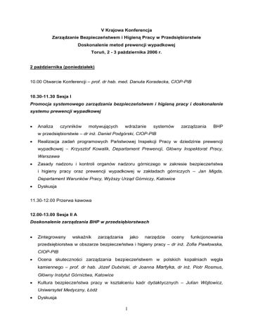V Krajowa Konferencja Zarządzanie Bezpieczeństwem i Higieną Pracy w Przedsiębiorstwie Doskonalenie metod prewencji wypadkowej Toruń, 2 - 3 października 2006 r. 2 października (poniedziałek) 10.00 Otwarcie Konferencji – prof. dr hab. med. Danuta Koradecka, CIOP-PIB 10.30-11.30 Sesja I Promocja systemowego zarządzania bezpieczeństwem i higieną pracy i doskonalenie systemu prewencji wypadkowej • Analiza czynników motywujących wdrażanie systemów zarządzania BHP w przedsiębiorstwie – dr inż. Daniel Podgórski, CIOP-PIB • Realizacja zadań programowych Państwowej Inspekcji Pracy w dziedzinie prewencji wypadkowej – Krzysztof Kowalik, Departament Prewencji, Główny Inspektorat Pracy, Warszawa • Zasady nadzoru i kontroli organów nadzoru górniczego w zakresie bezpieczeństwa i higieny pracy oraz prewencji wypadkowej w zakładach górniczych – Jan Migda, Departament Warunków Pracy, Wyższy Urząd Górniczy, Katowice • Dyskusja 11.30-12.00 Przerwa kawowa 12.00-13.00 Sesja II A Doskonalenie zarządzania BHP w przedsiębiorstwach • Zintegrowany wskaźnik zarządzania jako narzędzie oceny funkcjonowania przedsiębiorstwa w obszarze bezpieczeństwa i higieny pracy – dr inż. Zofia Pawłowska, CIOP-PIB • Ocena skuteczności zarządzania bezpieczeństwem w polskich kopalniach węgla kamiennego – prof. dr hab. Józef Dubiński, dr Joanna Martyka, dr inż. Piotr Rosmus, Główny Instytut Górnictwa, Katowice • Kultura bezpieczeństwa pracy w kształceniu kadr dydaktycznych – Julian Wójtowicz, Uniwersytet Medyczny, Łódź • Dyskusja 1 13.00-14.00 Przerwa obiadowa 14.00-15.30 Sesja II B Doskonalenie zarządzania BHP w przedsiębiorstwach • Skuteczność systemów zarządzania BHP – Bogusław Ziędalski, Oddział Toruńskiego Stowarzyszenia Ochrony Pracy, Toruń • Ocena zarządzania bezpieczeństwem i higieną pracy w ORLEN S.A. – przedsiębiorstwie – Marek Witkowski, PKN ORLEN, Płock • Ocena zarządzania bezpieczeństwem i higieną pracy w Jan Rogalski, BOT Elektrownia Bełchatów S.A. • Narzędzia zarządzania bezpieczeństwem i higieną pracy w Skanska S.A. - Wojciech Prusiński, Skanska S.A., Kielce • Podnoszenie poziomu bezpieczeństwa pracy – misja firmy DuPont – Magdalena Aleksandrowicz, DuPont • Dyskusja 15.30-16.00 Przerwa kawowa 16.00 – 17.00 Sesja III Czynniki środowiska pracy i profilaktyka wydarzeń wypadkowych • Zapobieganie zagrożeniom wypadkowym w magazynach wysokiego składowania – dr inż. Krystyna Myrcha, CIOP-PIB • Zastosowanie wirtualnego środowiska do tworzenia materiałów szkoleniowych z zakresu bezpieczeństwa pracy w zakładach górniczych – doc. dr hab. inż. Teodor Winkler prof. nzw. w Pol. Śl., mgr inż. Dariusz Michalak, mgr inż. Łukasz Jaszczyk, mgr inż. Szczepan Bojara, Centrum Mechanizacji Górnictwa KOMAG • Wybrane czynniki kształtujące środowisko pracy a ryzyko zawodowe w przedsiębiorstwie branży obuwniczej – Małgorzata Jaworska, Wydział Ekonomiczny Katedra Nauk o Jakości, Politechnika Radomska • Dyskusja 19. 00 Kolacja uroczysta 2 3 października (wtorek) 9.00-10.30 Sesja IV Badanie i rejestrowanie wydarzeń wypadkowych w przedsiębiorstwach • Rejestrowanie zdarzeń potencjalnie wypadkowych w przedsiębiorstwach – mgr inż. Grzegorz Dudka, CIOP-PIB • Technologia „Behavioral Accident Prevention Pocess- BAPP firmy BST – Proces Zapobiegania Wypadkom Przemysłowym Oparty na Zachowaniach – Antonina Polok, Mirosław Koźlik TUV Consulting Polska • Program rejestracji wypadków przy pracy w Poczcie Polskiej – Andrzej Garwacki, Poczta Polska, Dyrekcja Okręgu Poczty, Poznań • Motywowanie pracowników do bezpiecznych zachowań jako narzędzie prewencji wypadkowej - dr hab. Zygmunt Niczyporuk, mgr inż. Wioletta Przenniak, Wydział Organizacji i Zarządzania, Katedra Zarządzania Środowiskiem i Bezpieczeństwem, Politechnika Śląska, Gliwice • Dyskusja 10.30 – 11.00 Przerwa kawowa 11.00 – 12.00 Sesja V Stosowanie środków ochrony indywidualnej w prewencji wypadkowej • Zasady bezpiecznego stosowania środków ochrony indywidualnej – dr inż. Katarzyna Majchrzycka, CIOP-PIB • Programy komputerowe wspomagające dobór środków ochrony indywidualnej – dr inż. Adam Pościk, CIOP-PIB • Zasady doboru i stosowania sprzętu chroniącego przed upadkiem z wysokości – Jacek Sosnowski, Zygmunt Zrobek, PROTEKT Grzegorz Łaszkiewicz, Łódź • Dyskusja 12.00 – 12.30 Podsumowanie i zakończenie Konferencji 13.00 Obiad 3