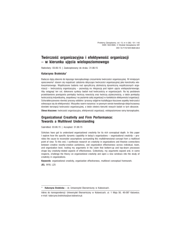 Problemy ZarzÈdzania, vol. 13, nr 4 (56): 131 – 143 ISSN 1644-9584, © Wydziaï ZarzÈdzania UW DOI 10.7172/1644-9584.56.8 TwórczoĂÊ organizacyjna ib efektywnoĂÊ organizacji –b wb kierunku ujÚcia wielopoziomowego Nadesïany: 03.06.15 | Zaakceptowany do druku: 31.08.15 Katarzyna Bratnicka* Badacze dÈĝÈ obecnie do lepszego konceptualnego zrozumienia twórczoĂci organizacyjnej. W niniejszym opracowaniu1 staram siÚ rozpatrzeÊ zaïoĝenia dotyczÈce twórczoĂci organizacyjnej jako konstruktu wielowymiarowego. Wspóïczesne badania nad specyficznÈ zdolnoĂciÈ dynamicznÈ wspóïczesnych organizacji – twórczoĂciÈ organizacyjnÈ – pozwalajÈ na integracjÚ pod kÈtem ujÚcia wielopoziomowego. Aby osiÈgnÈÊ ten cel, dokonano syntezy badañ nad twórczoĂciÈ wb organizacjach. Na tej podstawie przedstawiono powiÈzania pomiÚdzy twórczÈ nowoĂciÈ oraz twórczÈ uĝytecznoĂciÈ, ab takĝe pomiÚdzy twórczoĂciÈ indywidualnÈ, zespoïowÈ ibna poziomie caïej organizacji wbkontekĂcie efektywnoĂci organizacji. Scharakteryzowano równieĝ procesy oddolne ibprocesy odgórne ksztaïtujÈce kluczowe aspekty twórczoĂci odnoszÈce siÚ do efektywnoĂci. Wszystko razem rozszerza ibwbpewnym sensie kwestionuje dotychczasowy dorobek koncepcji twórczoĂci organizacyjnej, ab takĝe otwiera kierunki nowych badañ wb tym obszarze. Sïowa kluczowe: twórczoĂÊ organizacyjna, efektywnoĂÊ organizacji, wielopoziomowe ramy konceptualne. Organizational Creativity and Firm Performance: Towardsb ab Multilevel Understanding Submitted: 03.06.15 | Accepted: 31.08.15 Scholars have got to understand organizational creativity for its rich conceptual depth. In this paper Ib explore how the specific dynamic capability in today’s organizations – organizational creativity – provides the cause to reconsider assumptions surrounding this multidimensional concept from ab multilevel point of view. To this end, I synthesize research on creativity in organizations and theorize connections between creative novelty-creative usefulness, and organization effectiveness across individual, team, and organization level, rooting my arguments in the claim that bottom-up and top-down processes shape key creativity-related aspects of effectiveness. Collectively, my arguments expand and, in some respects, challenge the theory on organizational creativity and open ab new windows into the study of creativity in organizations. Keywords: organizational creativity, organization effectiveness, multilevel conceptual framework. JEL: M19, L25 * Katarzyna Bratnicka – dr, Uniwersytet Ekonomiczny wb Katowicach. Adres do korespondencji: Uniwersytet Ekonomiczny wb Katowicach, ul. 1 Maja 50, 40-287 Katowice; e-mail: [email protected]. Katarzyna Bratnicka 1. Wprowadzenie TwórczoĂÊ cieszy siÚ obecnie duĝym zainteresowaniem zarówno praktyków, jak ibteoretyków zarzÈdzania, poniewaĝ jest uwaĝana za krytyczny noĂnik przetrwania ib powodzenia organizacji (Florida ib Goodnight, 2005). Coraz czÚĂciej pojawiajÈ siÚ tez gïosy, aby spojrzeÊ na twórczoĂÊ organizacyjnÈ zb perspektywy wielopoziomowoĂci tego zjawiska, które przecieĝ nie moĝe byÊ traktowane jako prosty efekt indywidualnych aktów twórczoĂci (Hirst, Van Knippenberg ib Zhou, 2009). Jednakĝe dotychczasowe modele wielopoziomowe uwzglÚdniajÈ gïównie poziom uczestnika organizacji ib poziom zespoïu, pomijajÈc poziom caïej organizacji. DÈĝÈc do wypeïnienia tej luki, rozpatrujÚ twórczoĂÊ organizacyjnÈ jako proces przebiegajÈcy przez trzy poziomy analizy: uczestnika organizacji, zespoïu ib caïej organizacji. Drazin, Glynn ib Kazanijan (1999, s. 304) przekonujÈco dowodzÈ, ĝe modele wielopoziomowe charakteryzujÈ siÚ „badaniem równoczesnych interakcji na danym poziomie analizy zb innymi poziomami, co pozwala opisaÊ narastajÈcÈ zïoĝonoĂÊ ibustawicznÈ zmiennoĂÊ krajobrazu organizacyjnego”. KontynuujÈc tok rozumowania tych badaczy, integrujÚ teoriÚ twórczoĂci ibteorie zarzÈdzania strategicznego, biorÈc pod uwagÚ wielopoziomowe ujÚcie po to, aby odkryÊ kluczowe procesy twórczoĂci organizacyjnej ïÈczÈce uczestników organizacji, zespoïy ibcaïÈ organizacjÚ. Rezultaty teoretycznych rozwaĝañ podpowiadajÈ, ĝe procesy twórczoĂci organizacyjnej mogÈ byÊ opisane równoczeĂnie wb dwóch wymiarach: jako oddolny proces twórczej nowoĂci ib odgórny proces twórczej uĝytecznoĂci. Uzyskane wyniki dajÈ pewien wkïad do literatury wbobszarze twórczoĂci ib zarzÈdzania strategicznego. Po pierwsze, niniejsze studium pogïÚbia zrozumienie roli twórczoĂci organizacyjnej wb osiÈganiu wysokiej efektywnoĂci ibtworzeniu przewagi konkurencyjnej na poziomie caïej organizacji. Jest to waĝne uzupeïnienie dotychczasowych badañ, które skupiaïy siÚ na zaleĝnoĂciach pomiÚdzy twórczymi zachowaniami jako predyktorami efektywnoĂci indywidualnej ib zespoïowej. Wprowadzenie do analiz poziomu organizacji pozwala lepiej uchwyciÊ zïoĝonoĂÊ tego zjawiska. Po drugie, rozszerzono spojrzenie na twórczoĂÊ uwzglÚdniajÈc zarówno oddolne procesy twórczej nowoĂci, jak ibodgórne procesy twórczej uĝytecznoĂci jako wzajemnie dopeïniajÈce siÚ noĂniki efektywnoĂci organizacji. 2. Wymiary ib poziomy twórczoĂci organizacyjnej wb kontekĂcie efektywnoĂci organizacji W literaturze przedmiotu twórczoĂÊ wb organizacjach jest najczÚĂciej definiowana jako „wypracowanie idei odnoĂnie produktów, praktyk, usïug czy teĝ procedur, które sÈ (a) nowe oraz (b) potencjalnie uĝyteczne dla organizacji” (Shalley, Zhou ib Oldham, 2004, s. 934). 132 DOI 10.7172/1644-9584.56.8 TwórczoĂÊ organizacyjna ib efektywnoĂÊ organizacji – wb kierunku ujÚcia wielopoziomowego Twórcza nowoĂÊ ib twórcza uĝytecznoĂÊ sÈ odrÚbnymi, niezaleĝnymi wymiarami skïadajÈcymi siÚ na twórczoĂÊ organizacyjnÈ. Oba procesy sÈ kluczowe dla przetrwania ibrozwoju organizacji. MajÈc to na uwadze ibwykorzy