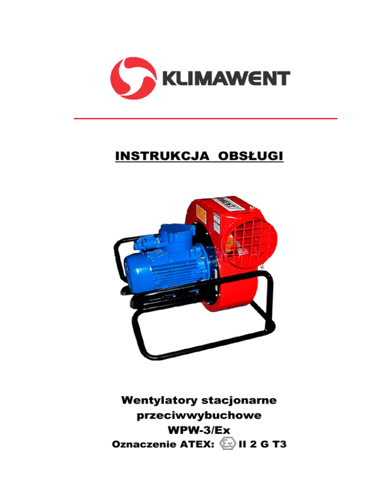 INSTRUKCJA OBSŁUGI Wentylatory stacjonarne przeciwwybuchowe WPW-3/Ex Oznaczenie ATEX: II 2 G T3 -2- Spis treści 1. Uwagi wstępne 2. Przeznaczenie 3. Zastrzeżenia producenta 4. Dane techniczne 5. Budowa i działanie 6. Montaż i uruchomienie 7. Użytkowanie 8. Zakłócenia w pracy, przyczyny, środki zaradcze 9. Instrukcja konserwacji 10. Instrukcja BHP 11. Transport i przechowywanie 12. Warunki gwarancji -3- 1. UWAGI WSTĘPNE Niniejsza instrukcja obsługi przeznaczona jest dla nabywcy i przyszłego użytkownika wentylatorów dachowych przeciwwybuchowych typu WPW-3/Ex. Jej celem jest dostarczenie użytkownikowi wskazówek odnośnie zastosowania, montażu, uruchamiania i eksploatacji w/w wyrobów. Przed przystąpieniem do montażu urządzenia na stanowisku pracy i jego uruchomieniem należy dokładnie zapoznać się treścią instrukcji. Ze względu na stałe udoskonalanie naszych wyrobów zastrzegamy sobie możliwość wprowadzenia zmian konstrukcyjnych podwyższających walory użytkowe i bezpieczeństwo urządzenia. W razie stwierdzenia wadliwej pracy lub usterek, których nie można usunąć we własnym zakresie, należy zwrócić się z zapytaniem do producenta lub jego upoważnionego przedstawiciela. Konstrukcja wentylatorów spełnia wymagania następujących dyrektyw europejskich: ● Dyrektywa 2006/42/WE Parlamentu Europejskiego i Rady z dnia17 maja 2006 r. w sprawie maszyn zmieniająca dyrektywę 95/16/WE (przekształcenie)/Dz. Urz. UE L157 z dn. 09.06.2006, str. 24/ Rozporządzenie Ministra Gospodarki z dnia 21 października 2008 r. w sprawie wymagań dla maszyn (Dz. U. Nr 199 z 2008 r. poz. 1228) ● Dyrektywa 2006/95/WE Parlamentu Europejskiego i Rady z dnia12 grudnia 2006 r. w sprawie harmonizacji ustawodawstwa państw członkowskich odnoszących się do stosowania w określonych granicach napięcia /Dz. Urz. UE L 374 z dn. 27.12.2006, str.10/ Rozporządzenie Ministra Gospodarki z dnia 21 sierpnia 2007 r. w sprawie zasadniczych wymagań dla sprzętu elektrycznego (Dz. U. Nr 155 z 2007 r. poz. 1089) ● Dyrektywa ATEX 94/9/WE Parlamentu Europejskiego i Rady z dnia 23 marca 1994r. w sprawie dot. urządzeń i systemów ochrony w przestrzeniach zagrożonych wybuchem /Dz. Urz. UE L100 z dnia 19.o4.1994/ Rozporządzenie ministra Gospodarki Przemysłu Polityki Społecznej z dn. 29 maja 2003r. /Dz. U. Nr 263 / 2005r. poz. 2203/. UWAGA: Wszystkie wentylatory jako maszyny wirujące stanowią potencjalne źródło zagrożenia w przypadku gdy: - nie są instalowane , uruchamiane oraz serwisowane przez wykwalifikowany personel, - nie są użytkowane zgodnie z przeznaczeniem Urządzenie zostało skonstruowane i wyprodukowane w oparciu o następujące normy: PN-EN ISO 12100-1:2005/A1:2009 Maszyny. Bezpieczeństwo. Pojęcia podstawowe, ogólne zasady projektowania – Podstawowa terminologia, metodologia. PN-EN ISO 12100-2:2005/A1:2009 Maszyny. Bezpieczeństwo. Pojęcia podstawowe, ogólne zasady projektowania – Zasady i wymagania techniczne. PN-EN ISO 13857:2010 Bezpieczeństwo maszyn. Odległości bezpieczeństwa uniemożliwiające dostęp kończyn górnych do stref zagrożenia. PN-EN 60204-1:2010 Bezpieczeństwo maszyn – Wyposażenie elektryczne maszyn. Cz.1: Wymagania ogólne. PN-M-43026:1998 Wentylatory. Wytyczne do konstrukcji wentylatorów przetłaczających wybuchowe mieszaniny gazów palnych i par z powietrzem. PN-EN 1127-1:2009 Atmosfery wybuchowe - zapobieganie wybuchowi i ochrona przed wybuchem. Pojęcia podstawowe i metodologia. PN-EN 13463-1:2010 Urządzenia nieelektryczne w przestrzeniach zagrożonych wybuchem. Część 1. Podstawowe założenia i wymagania. PN-EN 60079-0:2009 Urządzenia elektryczne w przestrzeniach zagrożonych wybuchem gazów. -4- 2. PRZEZNACZENIE Urządzenie przeznaczone jest do pracy w pomieszczeniach zagrożonych wybuchem, w których, zależnie od warunków lokalnych i ruchowych, może wystąpić atmosfera wybuchowa tj. mieszanina substancji palnych w postaci, gazów, par, mgieł z powietrzem w warunkach atmosferycznych, w której po zapaleniu spalanie rozprzestrzenia się na całą nie spaloną mieszaninę. Zgodnie z Dyrektywą ATEX 94/9/WE z 23 marca 1994 r. oraz normą PN-EN 13463-1 urządzenie daje poziom zabezpieczenia: „WYSOKI” – jako urządzenie sklasyfikowane w grupie II kategoria 2; może pracować w przestrzeniach, w których jest prawdopodobne pojawienie się atmosfer wybuchowych. Środki zabezpieczenia przeciwwybuchowego dotyczące urządzeń tej kategorii zapewniają wysoki poziom zabezpieczenia nawet w przypadku częstych zakłóceń lub uszkodzeń urządzenia jakie zwykle należy brać pod uwagę. Urządzenie może pracować w strefach 1, 2 (G). Zgodnie z załącznikiem nr II do Dyrektywy ATEX 94/9/WE oraz normą PN-EN 13463-1 urządzenie jest oznaczone na tabliczce klasyfikacji przeciwwybuchowej – II 2 G T3 3. ZASTRZEŻENIA PRODUCENTA A. Producent nie ponosi odpowiedzialności za skutki wynikające z niezgodnego z przeznaczeniem użytkowania urządzenia. B. Niedopuszczalne jest instalowanie na urządzeniu dodatkowych elementów, nie wchodzących w jego skład lub wyposażenie. C. Niedopuszczalne są samowolne przeróbki lub modyfikacje urządzenia. D. Należy chronić obudowę urządzenia przed uszkodzeniami mechanicznymi. E. Przed montażem urządzenia sprawdzić nośność elementów konstrukcyjnych do których urządzenia będzie przymocowane, gdyż niepewne zamocowanie może doprowadzić do uszkodzenia lub zniszczenia urządzenia, a także stwarzać może zagrożenie dla znajdujących się w pobliżu ludzi. F. Wentylator jest przeznaczony do przetłaczania powietrza suchego o zapyleniu nie większym niż 0,3g/m³ i temperaturze nie wyższej niż +60º. G. Wentylator nie może być stosowany do przetłaczania powietrza zawierającego zanieczyszczenia lepkie, które mogą osadzać się na urządzeniu, a zwłaszcza na wirniku. H. Wentylator nie może być stosowany do przetłaczania powietrza zawierającego zanieczyszczen