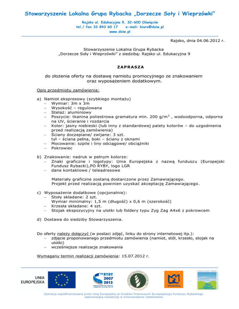 Stowarzyszenie Lokalna Grupa Rybacka „Dorzecze Soły i Wieprzówki” Rajsko ul. Edukacyjna 9, 32-600 Oświęcim tel./ fax 33 843 60 17 e-mali: [email protected] www.dsiw.pl Rajsko, dnia 04.06.2012 r. Stowarzyszenie Lokalna Grupa Rybacka „Dorzecze Soły i Wieprzówki” z siedzibą: Rajsko ul. Edukacyjna 9 Z AP R A S Z A do złożenia oferty na dostawę namiotu promocyjnego ze znakowaniem oraz wyposażeniem dodatkowym. Opis przedmiotu zamówienia: a) Namiot ekspresowy (szybkiego montażu) Wymiar: 3m x 3m Wysokość – regulowana Stelaż: aluminiowy Poszycie: tkanina poliestrowa gramatura min. 200 g/m 2 , wodoodporna, odporna na UV, ścieranie i rozdarcia Kolor: jasny niebieski (lub inny z standardowej palety kolorów – do uzgodnienia przed realizacją zamówienia) Ściany doczepiane/ zwijane: 3 szt. tył – ściana pełna, boki – ściany z oknami Mocowanie: szpile i liny odciągowe/ obciążniki Pokrowiec b) Znakowanie: nadruk w pełnym kolorze: Znaki graficzne i logotypy: Unia Europejska z nazwą fundusz u (Europejski Fundusz Rybacki),PO RYBY, logo LGR dane kontaktowe / teleadresowe Materiały graficzne zostaną dostarczone przez Zamawiającego. Projekt przed realizacją powinien uzyskać akceptację Zamawiającego. c) Wyposażenie dodatkowe (opcjonalnie): Stoły składane: 2 szt. Wymiar minimalny: 1,5 m (długość) x 0,6 m (szerokość) Krzesła składane: 4 szt. Stojak ekspozycyjny na ulotki lub foldery typu Zyg Zag A4x6 z pokrowcem d) Dostawa do siedziby Stowarzyszenia. Do oferty należy dołączyć (w postaci zdjęć, linku do strony internetowej itp.): zdjęcie proponowanego przedmiotu zamówienia (namiot, stół, krzesło, stojak na ulotki) wcześniejsze realizacje znakowania Wymagany termin realizacji zamówienia: 15.07.2012 r. Operacja współfinansowana przez Unię Europejską ze środków finansowych Europejskiego Funduszu Rybackiego zapewniającą inwestycję w zrównoważone rybołówstwo. Stowarzyszenie Lokalna Grupa Rybacka „Dorzecze Soły i Wieprzówki” Rajsko ul. Edukacyjna 9, 32-600 Oświęcim tel./ fax 33 843 60 17 e-mali: [email protected] www.dsiw.pl Kryterium wyboru oferty: cena, rodzaj i jakość oferowanych produktów Warunki płatności: przelew do 14 dni Miejsce i termin złożenia oferty: Ofertę należy złożyć w formie pisemnej na załączonym formularzu oferty do dnia 15.06.2012 r. do godz. 12.00: a) w siedzibie zamawiającego, t j . Stowarzyszenia Lokalna Grupa Rybacka „Dorzecze Soły i Wieprzówki”, Rajsko, ul. Edukacyjna 9 b) na nr fax: 33/ 843 60 17 c) e-mail: [email protected] Zamawiający dopuszcza możliwość produktowych / cenowych. złożenia kilku ofert w różnych wariantach Zamawiający zastrzega sobie prawo do wyboru oferty łącznej lub ofert cenowych dla poszczególnych przedmiotów zamówienia. Złożenie oferty traktowane będzie jako akceptacja złożenia zamówienia. Zamówienie będzie udzielone pisemnie. Oferty nie spełniające wymogów formalnych określonych w niniejszym zapytaniu nie będą rozpatrywane. Osoba uprawniona do kontaktów w sprawie zapytania ofertowego: Magdalena Zając, tel. 33/ 843 60 17, 609 448 752 Operacja współfinansowana przez Unię Europejską ze środków finansowych Europejskiego Funduszu Rybackiego zapewniającą inwestycję w zrównoważone rybołówstwo.