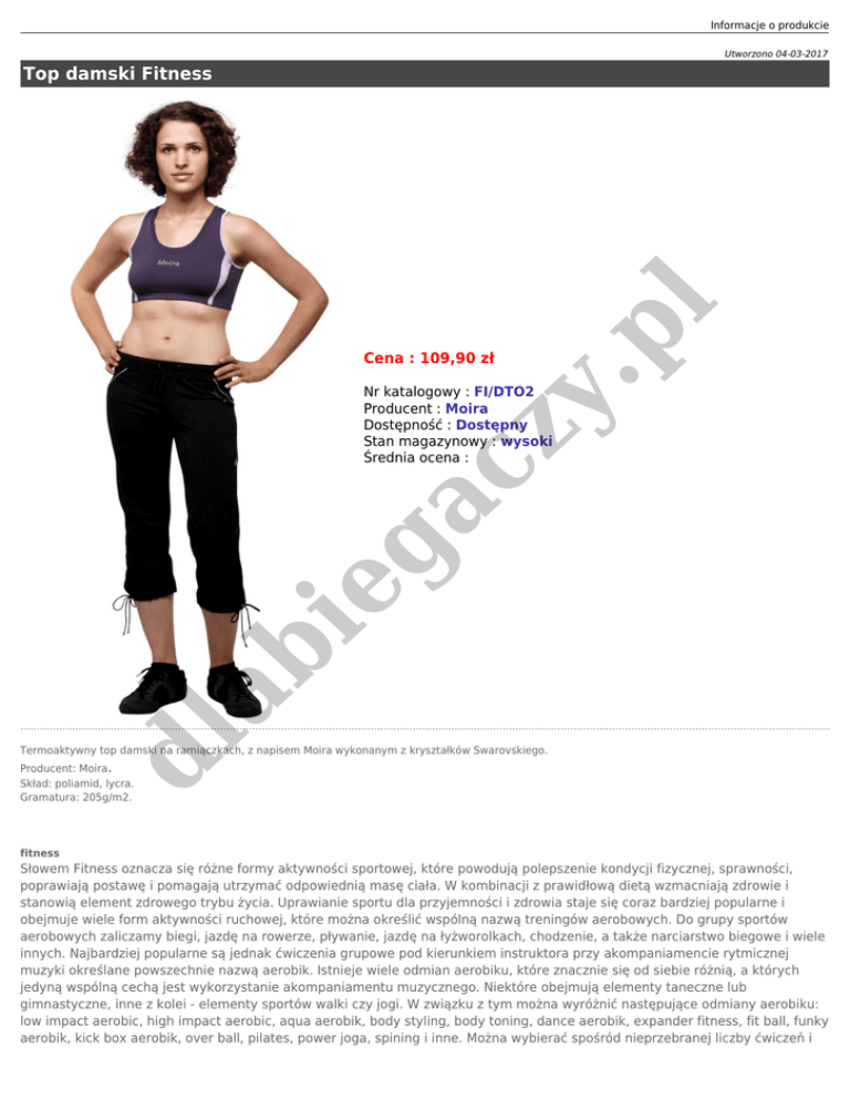 Informacje o produkcie Utworzono 04-03-2017 y. Cena : 109,90 zł pl Top damski Fitness dl ab ie ga cz Nr katalogowy : FI/DTO2 Producent : Moira Dostępność : Dostępny Stan magazynowy : wysoki Średnia ocena : Termoaktywny top damski na ramiączkach, z napisem Moira wykonanym z kryształków Swarovskiego. Producent: Moira. Skład: poliamid, lycra. Gramatura: 205g/m2. fitness Słowem Fitness oznacza się różne formy aktywności sportowej, które powodują polepszenie kondycji fizycznej, sprawności, poprawiają postawę i pomagają utrzymać odpowiednią masę ciała. W kombinacji z prawidłową dietą wzmacniają zdrowie i stanowią element zdrowego trybu życia. Uprawianie sportu dla przyjemności i zdrowia staje się coraz bardziej popularne i obejmuje wiele form aktywności ruchowej, które można określić wspólną nazwą treningów aerobowych. Do grupy sportów aerobowych zaliczamy biegi, jazdę na rowerze, pływanie, jazdę na łyżworolkach, chodzenie, a także narciarstwo biegowe i wiele innych. Najbardziej popularne są jednak ćwiczenia grupowe pod kierunkiem instruktora przy akompaniamencie rytmicznej muzyki określane powszechnie nazwą aerobik. Istnieje wiele odmian aerobiku, które znacznie się od siebie różnią, a których jedyną wspólną cechą jest wykorzystanie akompaniamentu muzycznego. Niektóre obejmują elementy taneczne lub gimnastyczne, inne z kolei - elementy sportów walki czy jogi. W związku z tym można wyróżnić następujące odmiany aerobiku: low impact aerobic, high impact aerobic, aqua aerobik, body styling, body toning, dance aerobik, expander fitness, fit ball, funky aerobik, kick box aerobik, over ball, pilates, power joga, spining i inne. Można wybierać spośród nieprzebranej liczby ćwiczeń i stopni intensywności treningu. Ćwiczenia są dobierane w taki sposób, aby zaangażować większą liczbę grup mięśni niż w przypadku zwykłych ćwiczeń. Intensywność treningu wyznacza rytm muzyki i liczba ćwiczeń zaproponowanych przez instruktora. Aerobik to intensywny trening, podczas którego zużywana jest duża liczba kalorii i który ma dobry wpływ na psychikę. Efektem jest dobre samopoczucie i radość spowodowana aktywnością ruchową. Podczas intensywnego treningu następuje jednak uwolnienie dużej ilości ciepła i istnieje ryzyko przegrzania organizmu. pl Nowa, limitowana kolekcja Fitness obejmuje ubrania przeznaczone do uprawiania sportów aerobowych wykonane z zaawansowanych dzianin Moira, które podczas ćwiczeń utrzymują ciało w równowadze termicznej, a nawet są w stanie je ochłodzić. Odpowiedni dobór włókien i ich składu procentowego umożliwia przyjęcie przez dzianinę optymalnej ilości wilgoci, która podczas ćwiczeń działa chłodząco. Nadmiar wilgoci jest odprowadzany na zewnętrzną stronę dzianiny, gdzie jest odparowywany, co daje dodatkowy efekt chłodzący. Optymalnie dobrana elastyczność materiału daje wsparcie mięśniom oraz stawom oraz zmniejsza drżenie mięśni. Wspomaga koordynację ruchów, stymuluje krążenie krwi, która w efekcie lepiej zaopatruje mięśnie w potrzebne substancje odżywcze. Zastosowane materiały są skonstruowane na potrzeby form aktywności ograniczonych czasowo i w istotny sposób pomagają w poprawie jakości treningów kondycyjnych. W tworzeniu i testowaniu nowej kolekcji brali udział trenerzy i instruktorzy różnych typów sportów aerobowych. Fason poszczególnych modeli odpowiada wymogom ergonomicznym, z którymi koresponduje elastyczność poszczególnych elementów kroju. Nowa kolekcja pod względem fasonów i kolorystyki wpisuje się w obecne trendy mody. Zastosowanie koronek i elementów siateczkowych zwiększa estetykę poszczególnych modeli podobnie jak ozdobienie elementami CRYSTALLIZED Swarovski Elements. y. Dostępne opcje Top damski Fitness dl ab ie ga cz kolor: borówka z różowym, czerwono-czarny. rozmiar: S, M, L, XL.