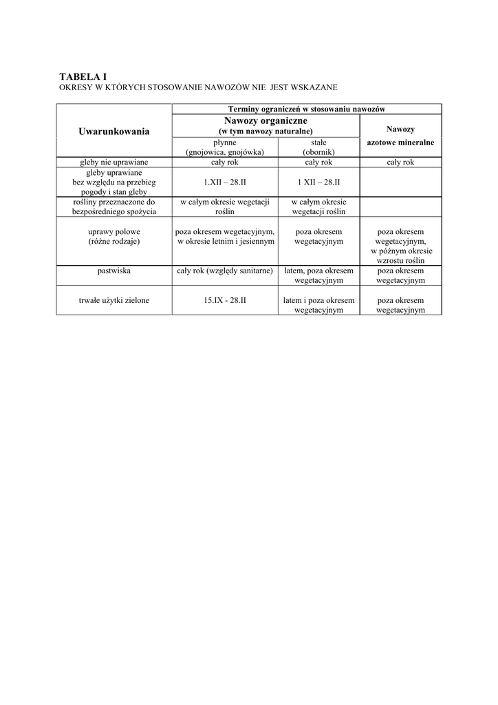 TABELA I OKRESY W KTÓRYCH STOSOWANIE NAWOZÓW NIE JEST WSKAZANE Terminy ograniczeń w stosowaniu nawozów Nawozy organiczne Uwarunkowania (w tym nawozy naturalne) płynne stałe (gnojowica, gnojówka) (obornik) cały rok cały rok Nawozy azotowe mineralne gleby nie uprawiane gleby uprawiane bez względu na przebieg pogody i stan gleby rośliny przeznaczone do bezpośredniego spożycia cały rok 1.XII – 28.II 1 XII – 28.II w całym okresie wegetacji roślin w całym okresie wegetacji roślin uprawy polowe (różne rodzaje) poza okresem wegetacyjnym, w okresie letnim i jesiennym poza okresem wegetacyjnym pastwiska cały rok (względy sanitarne) latem, poza okresem wegetacyjnym poza okresem wegetacyjnym, w późnym okresie wzrostu roślin poza okresem wegetacyjnym trwałe użytki zielone 15.IX - 28.II latem i poza okresem wegetacyjnym poza okresem wegetacyjnym