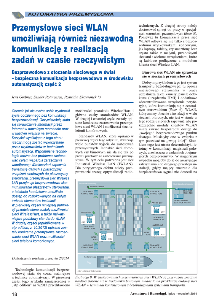 AUTOMATYKA PRZEMYSŁOWA Przemysłowe sieci WLAN umożliwiają również niezawodną komunikację z realizacją zadań w czasie rzeczywistym technicznych. Z drugiej strony należy dostosować sprzęt do pracy w specjalnych warunkach przemysłowych (ilustr. 8). Ponieważ tu komunikacja przez sieć WLAN odbywa się nie tylko z bezpośrednimi użytkownikami końcowymi, jak laptopy, tablety, czy smartfony, lecz często także z małymi, przenośnymi sieciami z wieloma urządzeniami, które są kablowo podłączone z modułem klienta sieci Wireless LAN. Bezprzewodowo z otoczenia sieciowego w świat – bezpieczna komunikacja bezprzewodowa w środowisku automatyzacji; część 2 Biurowa sieć WLAN nie sprawdza się w sieciach przemysłowych Jens Grebner, Sander Rotmensen, Roswitha Skowronek *) Obecnie już nie można sobie wyobrazić życia codziennego bez komunikacji bezprzewodowej. Oczywistością stało się sprawdzanie informacji przez Internet w dowolnym momencie oraz w każdym miejscu na świecie. Korzyści wynikające z tego stanu rzeczy mogą zostać wykorzystane przez użytkowników w technikach automatyzacji. Wspomniane technologie można bez problemu zastosować celem wsparcia zarządzania współpracą; WirelessHart zapewnia transmisję danych z płaszczyzny urządzeń sieciowych do płaszczyzny sterowania, przemysłowa sieć Wireless LAN przejmuje bezprzewodowo skomunikowanie płaszczyzny sterowania, a telefonia komórkowa umożliwia dostęp do rozlokowanych na całym świecie elementów instalacji. W pierwszej części niniejszej publikacji przedstawione zostały możliwości sieci WirelessHart, a także najważniejsze podstawy standardu WLAN. W drugiej części (opublikowana w atp edition, z. 10/2013) opisane zostały konkretne przemysłowe zastosowania sieci WLAN oraz możliwości sieci telefonii komórkowych. możliwości protokołu WirelessHart i główne cechy standardów WLAN. W drugiej i ostatniej części zostały opisane konkretne zastosowania przemysłowe sieci WLAN i możliwości sieci telefonii komórkowych. Standardy WLAN, które opisano w pierwszej części tego artykułu, stwarzają wiele punktów wyjścia do zastosowań przemysłowych. Jednakże sieci domowych czy biurowych nie da się tak po prostu przełożyć na zastosowania przemysłowe. W tym celu potrzebna jest sieć Industrial Wireless LAN (IWLAN). Dla pozytywnego efektu należy przeprowadzić szereg optymalizacji radio- Terminal kontenerowy Centrala automatyzacyjna Industrial Ethernet SCALANCE W786C-2 RJ45 SCALANCE W786C-2 RJ45 ANT795-6MT Technologie komunikacji bezprzewodowej stają się coraz ważniejsze w technice automatyzacji. W pierwszej części tego artykułu zamieszczonej w „atp edition” nr 9/2013 przedstawiono 18 SCALANCE XR324-12M IWLAN Controller SCALANCE WLC711 AGV ANT795-6MT SCALANCE W748-1 RJ45 AGV SCALANCE W748-1 RJ45 ANT795-6MT ANT795-6MT W748-1 RJ45 W748-1 RJ45 SCALANCE W786C-2 RJ45 Dokończenie artykułu z zeszytu 2/2014. Dobrym przykładem tego jest system transportu bezobsługowego: tu oprócz miejscowego sterownika w pracy uczestniczą także kamery, panele dotykowe (urządzenia HMI) i dodatkowe zdecentralizowane urządzenia peryferyjne, które komunikują się z centralnym sterownikiem (ilustr. 9). WLAN, który znamy obecnie z instalacji w wielu sieciach biurowych, nie jest w stanie w tego rodzaju sieciach zapewnić, aby poszczególne moduły klientów WLAN miały zawsze bezpośredni dostęp do „swojego“ bezprzewodowego punktu dostępu. Musiałyby one w związku z tym poczekać na „swoją kolej”. Skutkiem tego jest utrata deterministyki istotnej w komunikacji magistrali polowych, a zwłaszcza w zadaniach obejmujących bezpieczeństwo. W najgorszym wypadku mogłoby dojść do awaryjnego zatrzymania i do drogiego przestoju instalacji, gdyby mający znaczenie dla bezpieczeństwa sygnał nie doszedł na AGV AGV SCALANCE W786C-2 RJ45 Kontenerowiec AGV = Automated Guided Vehicle Ilustracja 9. W zastosowaniach przemysłowych sieci WLAN są przeważnie znacznie bardziej złożone niż w środowisku biurowym. Widać to na przykładzie budowy sieci WLAN w terminalu kontenerowym z bezobsługowymi systemami transportu. Armatura i Rurociągi, lipiec - wrzesień 2014 AUTOMATYKA PRZEMYSŁOWA czas do użytkownika końcowego. Dzięki zastosowaniu protokołów zabezpieczających, w ogóle nie do dochodzi do takich niebezpiecznych sytuacji. SIMATIC S7-400 z CP 443-1 Serwer danych wkrętarek Serwer systemowy (FIS) Switch SCALANCE X-400 Metoda odpytywania (polling) zapobiega kolizjom Aby mimo wszystko zapewnić niezawodną komunikację na płaszczyźnie magistrali polowej poprzez sieć WLAN, do komunikacji z wymogiem realizacji zadań w czasie rzeczywistym, w porównaniu do obecnych standardów, konieczne są pewne rozszerzenia. Problem komunikacji w czasie rzeczywistym w magistralach sieciowych w połączeniu z komunikacją skoncentrowaną na bezpieczeństwie rozwiązano na przykład za pomocą funkcji iPCF produktów IWLAN firmy Siemens, które często stosuje się w połączeniu z falowodem szczelinowym. Technologia iPCF bazuje na metodzie dostępu do PCF (Point Coordination Function), która już od 1999 r. wchodzi w skład standardu IEEE 802.11-legacy. PCF to metoda odpytywania, w której punkt dostępu, jako centralna jednostka, kontroluje dostęp do poszczególnych stanowisk, mając na celu uniknięcie kolizji. W iPCF stosuje się porównywalną metodę odpytywania, w połączeniu z metodą, która umożliwia szybszy roaming. Dzięki temu zapewnia się, że każdy połączony moduł klienta sieci bezprzewodowej może co najmniej raz dokonać wymiany danych z punktem dostępu w trakcie wybranego cyklu magistrali polowej. Falowód szczelinowy stosuje się wtedy, gdy komunikacja bezprzewodowa ma lub musi być zorientowana wzdłuż określonego odcinka drogi, a nie jest możliwe zastosowanie typowych anten, ponieważ, na przykład, można byłoby się spodziewać trudności podczas wzbudzen