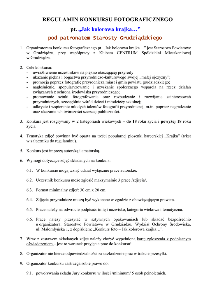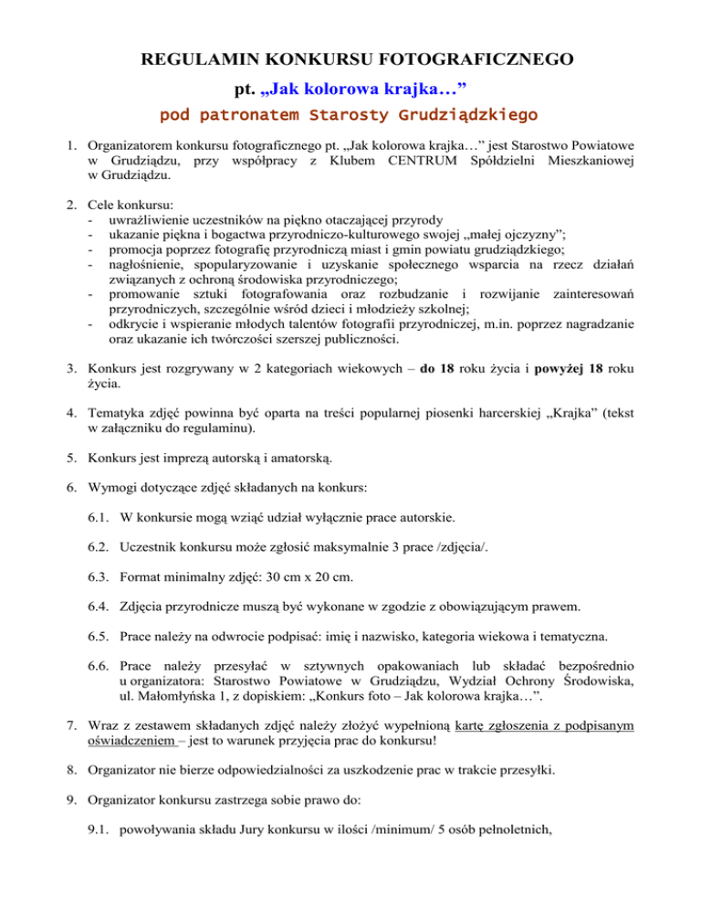 REGULAMIN KONKURSU FOTOGRAFICZNEGO pt. „Jak kolorowa krajka…” pod patronatem Starosty Grudziądzkiego 1. Organizatorem konkursu fotograficznego pt. „Jak kolorowa krajka…” jest Starostwo Powiatowe w Grudziądzu, przy współpracy z Klubem CENTRUM Spółdzielni Mieszkaniowej w Grudziądzu. 2. Cele konkursu: - uwraŜliwienie uczestników na piękno otaczającej przyrody - ukazanie piękna i bogactwa przyrodniczo-kulturowego swojej „małej ojczyzny”; - promocja poprzez fotografię przyrodniczą miast i gmin powiatu grudziądzkiego; - nagłośnienie, spopularyzowanie i uzyskanie społecznego wsparcia na rzecz działań związanych z ochroną środowiska przyrodniczego; - promowanie sztuki fotografowania oraz rozbudzanie i rozwijanie zainteresowań przyrodniczych, szczególnie wśród dzieci i młodzieŜy szkolnej; - odkrycie i wspieranie młodych talentów fotografii przyrodniczej, m.in. poprzez nagradzanie oraz ukazanie ich twórczości szerszej publiczności. 3. Konkurs jest rozgrywany w 2 kategoriach wiekowych – do 18 roku Ŝycia i powyŜej 18 roku Ŝycia. 4. Tematyka zdjęć powinna być oparta na treści popularnej piosenki harcerskiej „Krajka” (tekst w załączniku do regulaminu). 5. Konkurs jest imprezą autorską i amatorską. 6. Wymogi dotyczące zdjęć składanych na konkurs: 6.1. W konkursie mogą wziąć udział wyłącznie prace autorskie. 6.2. Uczestnik konkursu moŜe zgłosić maksymalnie 3 prace /zdjęcia/. 6.3. Format minimalny zdjęć: 30 cm x 20 cm. 6.4. Zdjęcia przyrodnicze muszą być wykonane w zgodzie z obowiązującym prawem. 6.5. Prace naleŜy na odwrocie podpisać: imię i nazwisko, kategoria wiekowa i tematyczna. 6.6. Prace naleŜy przesyłać w sztywnych opakowaniach lub składać bezpośrednio u organizatora: Starostwo Powiatowe w Grudziądzu, Wydział Ochrony Środowiska, ul. Małomłyńska 1, z dopiskiem: „Konkurs foto – Jak kolorowa krajka…”. 7. Wraz z zestawem składanych zdjęć naleŜy złoŜyć wypełnioną kartę zgłoszenia z podpisanym oświadczeniem – jest to warunek przyjęcia prac do konkursu! 8. Organizator nie bierze odpowiedzialności za uszkodzenie prac w trakcie przesyłki. 9. Organizator konkursu zastrzega sobie prawo do: 9.1. powoływania składu Jury konkursu w ilości /minimum/ 5 osób pełnoletnich, 9.2. bezpłatnego i niekonsultowanego eksponowania i wykorzystania w publikacjach zdjęć konkursowych oraz podania podstawowych danych osobowych autora w materiałach drukowanych i w środkach masowego przekazu informacji, 9.3. bezpłatnego przejęcia do archiwum organizatora zdjęć nagrodzonych i wyróŜnionych, 9.4. nie odsyłania Ŝadnych prac chyba, Ŝe uczestnik dostarczy zaadresowaną kopertę ze znaczkiem pocztowym o odpowiednim nominale; po wcześniejszym uzgodnieniu moŜna takŜe zgłosić się osobiście po odbiór swojej pracy do siedziby organizatora, 9.5. nie informowania o wynikach konkursu autorów prac, które nie zostały nagrodzone, 9.6. podejmowania współpracy /dot. strony organizacyjnej oraz finansowej konkursu/ z instytucjami i osobami prywatnymi, np. z serwisem internetowym, szkołami itp., 9.7. dokonywania zmian w terminarzu konkursu. 10. Terminarz ogólny konkursu: - dostarczenie prac na konkurs: do 30 września 2008 roku. - ocena i werdykt Jury konkursu: do 31 października 2008 roku. - uroczyste wręczenie dyplomów i nagród laureatom: do 29 listopada 2008 roku. 11. Werdykt Jury konkursu jest ostateczny i nie podlega odwołaniu. 12. Jury konkursu wykluczy z poddawania ocenie zdjęcia, co do których zaistnieją zbyt duŜe przesłanki, Ŝe zostały wykonane z naruszeniem obowiązującego prawa. 13. Organizatorzy dopuszczają przyznawanie nagród i wyróŜnień w niniejszym konkursie przez instytucje (np. szkoły, firmy, marszałków, starostów, prezydentów etc.) i osoby prywatne. 14. Nadesłanie prac jest jednoznaczne z akceptacją niniejszego regulaminu. UWAGA ! WAśNE ! PAMIĘTAJ ! Fotografie konkursowe muszą być wykonane w zgodzie z obowiązującym prawem, tj. Ustawą o ochronie przyrody z dnia 16 kwietnia 2004 r. /Dz.U.2004.92.880 ze zm./ oraz stosownymi Rozporządzeniami Ministra Środowiska. Więcej informacji na stronach www.mos.gov.pl Kontakt: Michał Kosowicz, Starostwo Powiatowe w Grudziądzu, tel. 056 451 44 14 KARTA ZGŁOSZENIA UCZESTNIKA KONKURSU FOTOGRAFICZNEGO pt. „Jak kolorowa krajka…” pod patronatem Starosty Grudziądzkiego Imię i nazwisko ............................................................................................................ Adres zamieszkania .................................................................................................... Kategoria wiekowa ..................... Jeśli do 18 lat to podać ukończone lata .............. Kontakt tel. ................................................................................................................... * Nazwa placówki szkolnej........................................................................................... ...................................................................................................................................... * dotyczy osób reprezentujących placówki oświatowe Liczba zdjęć zgłoszonych do konkursu ................ Oświadczam, Ŝe osoba wymieniona powyŜej z imienia i nazwiska jest autorem wszystkich zdjęć złoŜonych na konkurs wraz z tą kartą, a dane są zgodne z prawdą. Zgodnie z ustawą z dnia 29 sierpnia 1997 r. o ochronie danych osobowych (Dz. U. Nr 133 poz. 883 ze zm.) wyraŜam zgodę na przetwarzanie danych zawartych w złoŜonych przeze mnie dokumentach, dla potrzeb niezbędnych do realizacji i promocji niniejszego konkursu, w tym podania podstawowych danych osobowych autora w materiałach drukowanych i w środkach masowego przekazu informacji. Ponadto, wyraŜam takŜe zgodę na bezpłatne i niekonsultowane eksponowanie oraz do wykorzystania w publikacjach złoŜonych przeze mnie zdjęć konkursowych. Podpisanie