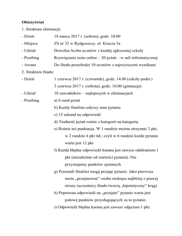 Obieżyświat 1. Struktura eliminacji: - Dzień 18 marca 2017 r. (sobota), godz. 10.00 - Miejsce ZS nr 32 w Bydgoszczy, ul. Krucza 5a - Udział Dowolna liczba uczniów z każdej zgłoszonej szkoły - Przebieg Rozwiązanie testu online – 20 pytań – w sali informatycznej - Awans Do finału przechodzi 10 uczniów z najwyższymi wynikami 2. Struktura finału: - Dzień 1 czerwca 2017 r. (czwartek), godz. 14.00 (szkoły podst.) 3 czerwca 2017 r. (sobota), godz. 10.00 (gimnazja) - Udział 10 zawodników – najlepszych w eliminacjach - Przebieg a) 6 rund pytań b) Każdy finalista usłyszy inne pytanie c) 15 sekund na odpowiedź d) Trudność pytań rośnie z kategorii na kategorię e) Rośnie też punktacja. W 1 rundzie można otrzymać 2 pkt, w 2 rundzie 4 pkt itd.; czyli w 6 rundzie każde pytanie warte jest 12 pkt f) Każda błędna odpowiedź karana jest zawsze odebraniem 1 pkt (niezależnie od wartości pytania). Nie przyznajemy punktów ujemnych g) Pozostali finaliści mogą przejąć pytanie. Jako pierwsza może „przejmować” osoba siedząca najbliżej z prawej strony (uczestnicy finału tworzą „hipotetyczny” krąg) h) Poprawna odpowiedź na „przejęte” pytanie warta jest połowę punktów przysługujących za to pytanie. i) Odpowiedź błędna karana jest zawsze odjęciem 1 pkt. Pytanie może wtedy przejąć kolejna osoba. - Tematyka Zabytki / Cuda natury / Metropolie / Państwa / Kontynenty - Kolejność a) Finalista z najwyższą ilością punktów b) Finalista najmłodszy (przy równej ilości punktów)