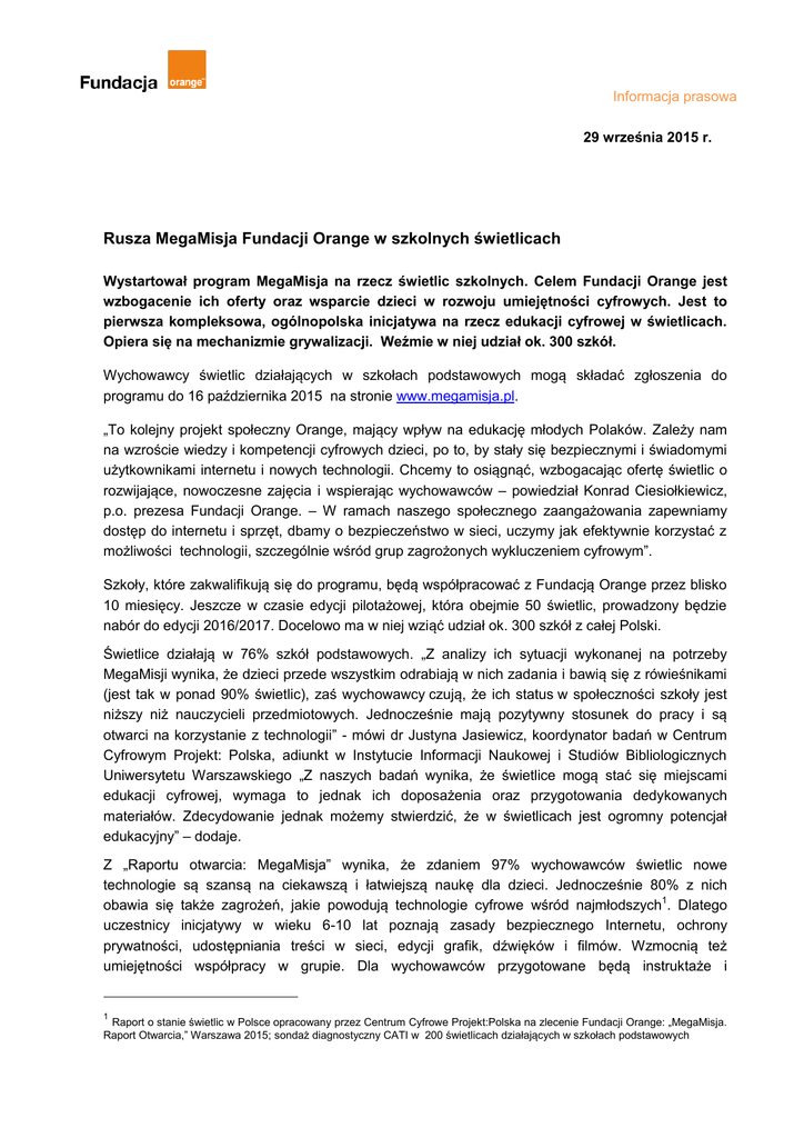 Informacja prasowa 29 września 2015 r. Rusza MegaMisja Fundacji Orange w szkolnych świetlicach Wystartował program MegaMisja na rzecz świetlic szkolnych. Celem Fundacji Orange jest wzbogacenie ich oferty oraz wsparcie dzieci w rozwoju umiejętności cyfrowych. Jest to pierwsza kompleksowa, ogólnopolska inicjatywa na rzecz edukacji cyfrowej w świetlicach. Opiera się na mechanizmie grywalizacji. Weźmie w niej udział ok. 300 szkół. Wychowawcy świetlic działających w szkołach podstawowych mogą składać zgłoszenia do programu do 16 października 2015 na stronie www.megamisja.pl. „To kolejny projekt społeczny Orange, mający wpływ na edukację młodych Polaków. Zależy nam na wzroście wiedzy i kompetencji cyfrowych dzieci, po to, by stały się bezpiecznymi i świadomymi użytkownikami internetu i nowych technologii. Chcemy to osiągnąć, wzbogacając ofertę świetlic o rozwijające, nowoczesne zajęcia i wspierając wychowawców – powiedział Konrad Ciesiołkiewicz, p.o. prezesa Fundacji Orange. – W ramach naszego społecznego zaangażowania zapewniamy dostęp do internetu i sprzęt, dbamy o bezpieczeństwo w sieci, uczymy jak efektywnie korzystać z możliwości technologii, szczególnie wśród grup zagrożonych wykluczeniem cyfrowym”. Szkoły, które zakwalifikują się do programu, będą współpracować z Fundacją Orange przez blisko 10 miesięcy. Jeszcze w czasie edycji pilotażowej, która obejmie 50 świetlic, prowadzony będzie nabór do edycji 2016/2017. Docelowo ma w niej wziąć udział ok. 300 szkół z całej Polski. Świetlice działają w 76% szkół podstawowych. „Z analizy ich sytuacji wykonanej na potrzeby MegaMisji wynika, że dzieci przede wszystkim odrabiają w nich zadania i bawią się z rówieśnikami (jest tak w ponad 90% świetlic), zaś wychowawcy czują, że ich status w społeczności szkoły jest niższy niż nauczycieli przedmiotowych. Jednocześnie mają pozytywny stosunek do pracy i są otwarci na korzystanie z technologii” - mówi dr Justyna Jasiewicz, koordynator badań w Centrum Cyfrowym Projekt: Polska, adiunkt w Instytucie Informacji Naukowej i Studiów Bibliologicznych Uniwersytetu Warszawskiego „Z naszych badań wynika, że świetlice mogą stać się miejscami edukacji cyfrowej, wymaga to jednak ich doposażenia oraz przygotowania dedykowanych materiałów. Zdecydowanie jednak możemy stwierdzić, że w świetlicach jest ogromny potencjał edukacyjny” – dodaje. Z „Raportu otwarcia: MegaMisja” wynika, że zdaniem 97% wychowawców świetlic nowe technologie są szansą na ciekawszą i łatwiejszą naukę dla dzieci. Jednocześnie 80% z nich obawia się także zagrożeń, jakie powodują technologie cyfrowe wśród najmłodszych1. Dlatego uczestnicy inicjatywy w wieku 6-10 lat poznają zasady bezpiecznego Internetu, ochrony prywatności, udostępniania treści w sieci, edycji grafik, dźwięków i filmów. Wzmocnią też umiejętności współpracy w grupie. Dla wychowawców przygotowane będą instruktaże i 1 Raport o stanie świetlic w Polsce opracowany przez Centrum Cyfrowe Projekt:Polska na zlecenie Fundacji Orange: „MegaMisja. Raport Otwarcia,” Warszawa 2015; sondaż diagnostyczny CATI w 200 świetlicach działających w szkołach podstawowych scenariusze zajęć. Przebieg zadań oparty jest na fabularyzowanej grze, która przenosi dzieci do cyfrowego laboratorium i pełnej przygód misji. Tu pomogą bohaterom sprawnie poruszać się w wirtualnym świecie i chronić go przed niesfornym psotnikiem. Za realizację wyzwań grupy gromadzić będą punkty i wymieniać je na nagrody dla świetlicy uzupełniające jej wyposażenie (w tym tablety, aparaty cyfrowe, laptopy, książki, gry edukacyjne, materiały plastyczne). Inauguracja MegaMisji zbiega się z jubileuszem 10-lecia Fundacji Orange, która od 2005 roku realizuje autorskie programy społeczne. Nauczyła ponad 30 tys. dzieci zasad bezpiecznego internetu, wsparła powstanie narzędzi ochrony on-line i prowadzenie edukacji cyfrowej dla 25 tys. dzieci i młodzieży, wyposażyła w internet 3,5 tys. bibliotek publicznych i 10 tys. szkół, wspomogła 1000 szpitali i ponad 900 organizacji w Polsce. Do tej pory przeznaczyła ponad 150 mln zł na inicjatywy społeczne. W swoje działania angażuje 3000 wolontariuszy rocznie. To realny udział w rozwoju kompetencji cyfrowych Polaków. Dodatkowych informacji udzielą: Wojciech Jabczyński, rzecznik Orange Polska e-mail: [email protected] tel.: (+48) 502 121 859 Antonina Bojanowska, koordynator ds. komunikacji, Fundacja Orange e-mail: [email protected] tel.: (+48) 22 527 40 24 kom: (+48) 509 84 86 82 Partnerami programu są: Fundacja HIGHLIGHT/inaczej, Fundacja Nowoczesna Polska oraz Centrum Cyfrowe Projekt: Polska. 2