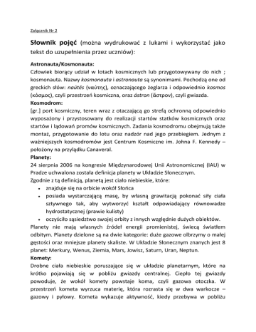 Załącznik Nr 2 Słownik pojęć (można wydrukować z lukami i wykorzystać jako tekst do uzupełnienia przez uczniów): Astronauta/Kosmonauta: Człowiek biorący udział w lotach kosmicznych lub przygotowywany do nich ; kosmonauta. Nazwy kosmonauta i astronauta są synonimami. Pochodzą one od greckich słów: naútēs (ναύτης), oznaczającego żeglarza i odpowiednio kosmos (κόσμος), czyli przestrzeń kosmiczna, oraz ástron (ἄστρον), czyli gwiazda. Kosmodrom: [gr.] port kosmiczny, teren wraz z otaczającą go strefą ochronną odpowiednio wyposażony i przystosowany do realizacji startów statków kosmicznych oraz startów i lądowań promów kosmicznych. Zadania kosmodromu obejmują także montaż, przygotowanie do lotu oraz nadzór nad jego przebiegiem. Jednym z ważniejszych kosmodromów jest Centrum Kosmiczne im. Johna F. Kennedy – położony na przylądku Canaveral. Planety: 24 sierpnia 2006 na kongresie Międzynarodowej Unii Astronomicznej (IAU) w Pradze uchwalona została definicja planety w Układzie Słonecznym. Zgodnie z tą definicją, planetą jest ciało niebieskie, które: znajduje się na orbicie wokół Słońca posiada wystarczającą masę, by własną grawitacją pokonać siły ciała sztywnego tak, aby wytworzyć kształt odpowiadający równowadze hydrostatycznej (prawie kulisty) oczyściło sąsiedztwo swojej orbity z innych względnie dużych obiektów. Planety nie mają własnych źródeł energii promienistej, świecą światłem odbitym. Planety dzielone są na dwie kategorie: duże gazowe olbrzymy o małej gęstości oraz mniejsze planety skaliste. W Układzie Słonecznym znanych jest 8 planet: Merkury, Wenus, Ziemia, Mars, Jowisz, Saturn, Uran, Neptun. Komety: Drobne ciała niebieskie poruszające się w układzie planetarnym, które na krótko pojawiają się w pobliżu gwiazdy centralnej. Ciepło tej gwiazdy powoduje, że wokół komety powstaje koma, czyli gazowa otoczka. W przestrzeń kometa wyrzuca materię, która rozrasta się w dwa warkocze – gazowy i pyłowy. Kometa wykazuje aktywność, kiedy przebywa w pobliżu gwiazdy. Są nietrwałymi obiektami; wskutek utraty materii lub nagłego rozpadu zmniejszają swoje masy. Najbardziej znana jest kometa Halleya. Planetoidy: Planetoida (planeta + gr. eídos postać), asteroida (gr. asteroeidés – gwiaździsty), planetka (ang. minor planet) – ciało niebieskie o średnicy od kilku metrów do czasem niewiele ponad 1000 km, obiegające Słońce, posiadające stałą powierzchnię skalną lub lodową, bardzo często – przede wszystkim w przypadku planetoid o mniejszych rozmiarach i mało masywnych – o nieregularnym kształcie, często noszącym znamiona kolizji z innymi podobnymi obiektami. Mgławica: Skupienie gazu i pyłu w przestrzeni kosmicznej lub rozległa otoczka gazowa wokół gwiazdy. Na zdjęciach nieba mgławice są widoczne jako obszary jasne, gdy zaś nie są oświetlone przez gorącą gwiazdę, a tworzący je gaz jest chłodny i nie świeci w widzialnej części widma – jako obszary ciemne, ubogie w gwiazdy. Czarna dziura: To obiekt astronomiczny, który tak silnie oddziałuje grawitacyjnie na swoje otoczenie, że nawet światło nie może uciec z jego powierzchni (prędkość światła jest mniejsza od prędkości ucieczki). Z tego obiektu niemożliwe jest przesyłanie na zewnątrz jakiejkolwiek informacji. Czarna dziura nie może być bezpośrednio obserwowana przez uczonych; można tylko obserwować procesy zachodzące w jej polu grawitacyjnym. Meteor: Świetlny ślad ( nazywany też niekiedy spadającą gwiazdą) znaczący na niebie drogę spadającego meteoroidu. Meteoryt – pozostałość drobnego skalnego ciała niebieskiego (meteoroidu) przyciągniętego przez znacznie większe ciało niebieskie, która w postaci ciała stałego dotarła do jego powierzchni. Najlepiej zapamiętać, że meteor widać na niebie, a meteoryt na ziemi. Meteor to tzw. spadająca gwiazda, zaś meteoryt już nie. Meteoroid: [gr], ciało niebieskie (pyłek, bryła) o rozmiarach od ułamka milimetra do wielu metrów, obiegające Słońce po orbicie eliptycznej. Jeśli wpadnie do atmosfery Ziemi (z prędkością 10 – 70 km/s)rozgrzewa się pod wpływem tarcia do wysokiej temperatury i na wysokości ok. 100 km zaczyna świecić. Jednocześnie wzbudza cząstki powietrza, które następnie wypromieniowują uzyskaną energię, co obserwuje się w postaci krótkotrwałej smugi. Betelgeza: Jest jedną z najjaśniejszych gwiazd na niebie, jak również jedną z najbardziej interesujących dla astronomów. Jest ona ogromnym czerwonym nadolbrzymem (nadolbrzym – gwiazda o masie od około 10 do 50 mas Słońca i promieniu dochodzącym nawet ponad 1500 promieni Słońca), jej masę ocenia się na 14-15 mas Słońca. Jej średnica jest ogromna, tak duża (maks. ok. 345 razy większa od Słońca), że za pomocą ziemskich teleskopów jesteśmy w stanie widzieć jej powierzchnię jako dysk, a nie punkt (jeden z około 10 takich przypadków wśród wszystkich gwiazd, oczywiście z pominięciem Słońca). Astronomowie przewidują, że gwiazda ta, znajdująca się przy końcu swojej ewolucji, w stosunkowo niedalekiej przyszłości (w skali astronomicznej) wybuchnie jako supernowa(supernowa – w astronomii termin określający kilka rodzajów kosmicznych eksplozji, które powodują powstanie na niebie niezwykle jasnego obiektu, który już po kilku tygodniach bądź miesiącach staje się niemal niewidoczny), w przypadku wybuchu gwiazda osiągnie jasność równą w przybliżeniu jasności Księżyca. Układ Słoneczny: Układ składający się ze Słońca i powiązanych z nim grawitacyjnie ciał niebieskich. Zbadane regiony Układu Słonecznego zawierają, licząc od Słońca: cztery planety skaliste (Merkury, Wenus, Ziemia, Mars), pas planetoid składający się z małych skalistych ciał, cztery zewnętrzne gazowe olbrzymy (Jowisz, Saturn, Uran, Neptun) oraz drugi pas – pas Kuipera, składa