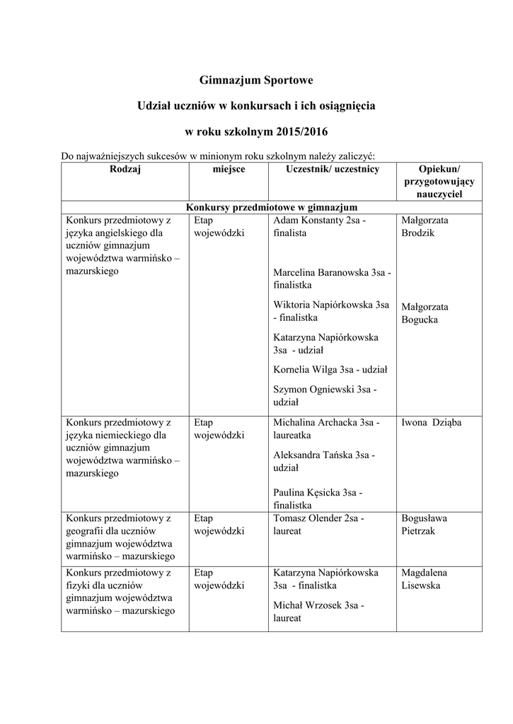 Gimnazjum Sportowe Udział uczniów w konkursach i ich osiągnięcia w roku szkolnym 2015/2016 Do najważniejszych sukcesów w minionym roku szkolnym należy zaliczyć: Rodzaj miejsce Uczestnik/ uczestnicy Konkurs przedmiotowy z języka angielskiego dla uczniów gimnazjum województwa warmińsko – mazurskiego Konkursy przedmiotowe w gimnazjum Etap Adam Konstanty 2sa wojewódzki finalista Opiekun/ przygotowujący nauczyciel Małgorzata Brodzik Marcelina Baranowska 3sa finalistka Wiktoria Napiórkowska 3sa - finalistka Małgorzata Bogucka Katarzyna Napiórkowska 3sa - udział Kornelia Wilga 3sa - udział Szymon Ogniewski 3sa udział Konkurs przedmiotowy z języka niemieckiego dla uczniów gimnazjum województwa warmińsko – mazurskiego Etap wojewódzki Michalina Archacka 3sa laureatka Iwona Dziąba Aleksandra Tańska 3sa udział Konkurs przedmiotowy z geografii dla uczniów gimnazjum województwa warmińsko – mazurskiego Etap wojewódzki Paulina Kęsicka 3sa finalistka Tomasz Olender 2sa laureat Konkurs przedmiotowy z fizyki dla uczniów gimnazjum województwa warmińsko – mazurskiego Etap wojewódzki Katarzyna Napiórkowska 3sa - finalistka Michał Wrzosek 3sa laureat Bogusława Pietrzak Magdalena Lisewska Konkurs przedmiotowy z chemii dla uczniów gimnazjum województwa warmińsko – mazurskiego Etap wojewódzki Aleksandra Topolska 3sa laureatka Jolanta Witkowska Konkurs przedmiotowy z języka polskiego dla uczniów gimnazjum województwa warmińsko – mazurskiego Konkurs przedmiotowy z historii dla uczniów gimnazjum województwa warmińsko – mazurskiego Etap wojewódzki Wiktoria Napiórkowska 3sa - laureatka Sławomir Majewski udział w etapie szkolnym 5 z osób z 2sa Wojciech Gramowski Konkursy ogólnopolskie i międzynarodowe Ogólnopolski Konkurs Tytuł finalisty i Martyna Mróz 1sb Czytelniczy „Kreator” wyróżnienie Międzynarodowy Konkurs Laureat – Tomasz Olender 2sa Kangur Matematyczny kategoria Kadet Wyróżnienie kategoria Kadet Ogólnopolska Stypendiada Polonistyczna Ogólnopolski Konkurs Wiedzy o Janie Pawle II XVII Warmińsko – Mazurskie Dni Rodziny XIV Warmińsko – Mazurskie Zawody Matematyczne Olimpiada Wiedzy o Zdrowiu PCK Wyróżnienie kategoria Kadet Konkurs czytelniczy Ewa Gumkowska Agnieszka Brzostek Marta Krasula 1sa Agnieszka Kujtkowska Filip Gleba 3sa Agnieszka Brzostek Ewa Gumkowska 4 osoby – 1sb, 2sa – udział Konkurs literacki 2 osoby – 1sb, 2sa - udział Konkurs ortograficzny udział 9 osób – 1sb, 2sa - udział 6 osób – 2sa Konkursy wojewódzkie laureatka Katarzyna Napiórkowska 3sa, V wynik Tomasz Olender 2sa Konkursy powiatowe Zakwalifikowan Aleksandra Topolska 3sa i do etapu rejonowego Magdalena Zyśk Magdalena Zyśk Agnieszka Brzostek Nina Gałązka Mistrzostwa Powiatu Szczycieńskiego w Szachach Szybkich szkół gimnazjalnych i ponadgimnazjalnych XV Dzień Papieski - dzień wdzięczności i łączności duchowej z Ojcem świętym, Janem Pawłem II XI edycja Powiatowego Konkursu Języka Angielskiego „Masters of English spelling” I miejsce Zespół Szkół nr 3 im. Jana III Sobieskiego w Szczytnie - I miejsce Krzysztof Wlazło 2sa Magdalena Zyśk II miejsce Adam Konstanty 2sa Małgorzata Brodzik wyróżnienia Marcelina Baranowska 3sa Powiatowy Przegląd Młodych Talentów „Ja też coś potrafię” pod hasłem „Wakacje ach wakacje” 3 miejsce Powiatowy Konkurs z Fizyki Kategoria Plastyka Gimnazja 2 miejsce Maja Ladzińska 1sb Małgorzata Bogucka Anna Bryk Katarzyna Napiórkowska 3sa, Magdalena Lisewska 3 miejsce Konkurs miejski „Rodzina moim skarbem” Szkolny Konkurs z okazji Uchwalenia Konstytucji 3 Maja Szkolny Konkurs z okazji 1050 – lecia Chrztu Polski Konkurs Recytatorski „Warmia i Mazury w literaturze” XVII Powiatowy Konkurs o tytuł Mistrza Ortografii Michał Wrzosek 3sa udział praca grupowa: Zofia Anna Bryk Chmielewska, Liwia Czajka, Emilia Radomska – uczennice klasy 2sa Konkursy szkolne wyróżnienia Weronika Andrzejewska 3sa Elżbieta Weichhaus – Kończyk, 1 miejsce Udział w etapie miejskim udział Klasa 1sa Aleksandra Kęsicka 1sb, Elżbieta Mrożek Elżbieta Weichhaus – Kończyk, Wojciech Gramowski Ewa Gumkowska Zofia Chmielewska 2sa Wiktoria Napiórkowska 3sa, Sławomir Majewski Przemysław Wnuk 2sa Ewa Gumkowska Szkolny Konkurs Plastyczny z okazji Tygodnia Przedsiębiorczości tematyce związanej z oszczędzaniem. udział 2sa, 3sa Anna Bryk Inne Konkurs Mam Talent Wyróżnienie Fotografia: Magdalena Kusior 2sa, - Piotr Dunaj 2sa I miejsce Talenty Sobieskiego statuetki dla uczniów, którzy wyróżnili się nienaganną postawą, aktywną działalnością społeczną i artystyczną na rzecz szkoły - Najlepszy z najlepszych – Aleksandra Topolska 3sa - Najlepszy sportowiec – Kacper Pichal 3sa - Najlepsza sportsmenka – Emilia Gwiazda 3sa - Wielki społecznik – Paulina Kęsicka 3sa - Osobowość szkoły – Michalina Archacka 3sa - Artystyczna dusza – Katarzyna Napiórkowska 3sa - Mistrz etykiety – Daniel Bil 3sa Nagroda Burmistrza Nagroda w dziedzinie oświaty - Tomasz Olender 2sa – laureat Nagroda w dziedzinie oświaty – Michalina Archacka 3sa – wyróżnienie Nagroda w dziedzinie oświaty – Wiktoria Napiórkowska 3sa – wyróżnienie Nagroda w dziedzinie sportu – Szymon Kacper Ogniewski 3sa – wyróżnienie Nagroda w dziedzinie sportu – Emilia Gwiazda 3sa – wyróżnienie Nagroda Wójta Nagroda w dziedzinie oświaty – Konrad Drężek 2sa Nagroda w dziedzinie oświaty – Liwia Czajka 2sa Nagroda w dziedzinie oświaty – Kornelia Wilga 3sa Nagroda w dziedzinie oświaty – Alicja Maśnicka 3sa Nagroda w dziedzinie oświaty – Aleksandra Topolska 3sa Nagroda w dziedzinie sportu – Filip Gleba 3sa Nagroda w dziedzinie sportu – Michał Ciszek 3sa Nagroda w dziedzinie sportu – Szymon Caliński 3sa Nagroda w dziedzinie sportu – Kacper Pichal 3sa Nagroda w dziedzinie sportu – Jan Mazur 3sa Nagroda w dziedzinie sportu – Przemysław Wnuk 2sa Nagroda w dzi
