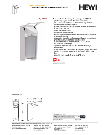 Karta produktowa Dozownik środka dezynfekującego 805.06.350 G1H3P Dozownik środka dezynfekującego 805.06.350 ⋅ półotwarty pojemnik ze stali szczotkowanej ⋅ do dozowania środków do dezynfekcji rąk na bazie alkoholu oraz mydła w płynie ⋅ przystosowany do standardowych butelek Euronorm o pojemności 500 ml ⋅ łatwa wymiana butelki ⋅ długi uchwyt dozowania ⋅ porcja dozowania ustawiana wielostopniowo, pompka dozowania ze stali ⋅ dozownik i pompkę można dezynfekować w specjalnie przystosowanych do tego urzędzeniach, autoklawowanie w temperaturze 134° C, 3 bar ⋅ do montażu ściennego ⋅ z pustym pojemnikiem 500 ml do wielokrotnego napełniania ⋅ otwór wylotowy z poliamidu w kolorach HEWI 90 (czerń głębi), 92 (szarość antracytu), 98 (biały), 99 (czysta biel) ⋅ szer. 82 mm, wys.245 mm i gł. 215 mm Wymiary w mm 215 82 245 82 Powierzchnia / Kolory XA | powierzchnia szczotkowana Stal szlachetna 98 99 92 90 Poliamid Zastrzega się możliwość wprowadzania zmian technicznych, 27.12.2016 HEWI Heinrich Wilke GmbH Postfach 1260 D-34442 Bad Arolsen Telefon: +49 5691 82-366 Telefax: +49 5691 82-99366 [email protected] www.hewi.com HEWI Heinrich Wilke GmbH Sp. z o.o. Oddział w Polsce Ul. Lelka 26 02-812 Warszawa tel. +48 22 330 00 51 fax +48 22 330 00 50 [email protected] www.hewi.com