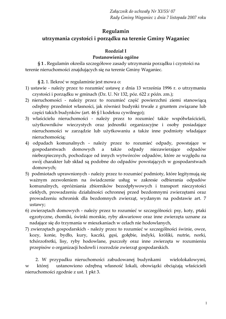 Załącznik do uchwały Nr XI/55/ 07 Rady Gminy Waganiec z dnia 7 listopada 2007 roku Regulamin utrzymania czystości i porządku na terenie Gminy Waganiec Rozdział I Postanowienia ogólne § 1 . Regulamin określa szczegółowe zasady utrzymania porządku i czystości na terenie nieruchomości znajdujących się na terenie Gminy Waganiec. § 2. 1. Ilekroć w regulaminie jest mowa o: 1) ustawie - należy przez to rozumieć ustawę z dnia 13 września 1996 r. o utrzymaniu czystości i porządku w gminach (Dz. U. Nr 132, póz. 622 z późn. zm.); 2) nieruchomości - należy przez to rozumieć część powierzchni ziemi stanowiącą odrębny przedmiot własności, jak również budynki trwale z gruntem związane lub części takich budynków (art. 46 § l kodeksu cywilnego); 3) właścicielu nieruchomości - należy przez to rozumieć także współwłaścicieli, użytkowników wieczystych oraz jednostki organizacyjne i osoby posiadające nieruchomości w zarządzie lub użytkowaniu a także inne podmioty władające nieruchomością; 4) odpadach komunalnych - należy przez to rozumieć odpady, powstające w gospodarstwach domowych a także odpady niezawierające odpadów niebezpiecznych, pochodzące od innych wytwórców odpadów, które ze względu na swój charakter lub skład są podobne do odpadów powstających w gospodarstwach domowych; 5) podmiotach uprawnionych - należy przez to rozumieć podmioty, które legitymują się ważnym zezwoleniem na świadczenie usług w zakresie odbierania odpadów komunalnych, opróżniania zbiorników bezodpływowych i transport nieczystości ciekłych, prowadzeniu działalności ochronnej przed bezdomnymi zwierzętami oraz prowadzeniu schronisk dla bezdomnych zwierząt, wydanym na podstawie art. 7 ustawy; 6) zwierzętach domowych - należy przez to rozumieć w szczególności: psy, koty, ptaki egzotyczne, chomiki, świnki morskie, ryby akwariowe oraz inne zwierzęta uznane za nadające się do trzymania w mieszkaniach w celach nie hodowlanych, 7) zwierzętach gospodarskich - należy przez to rozumieć w szczególności świnie, owce, kozy, konie, bydło, kury, kaczki, gęsi, gołębie, indyki, króliki, nutrie, norki, tchórzofretki, lisy, ryby hodowlane, pszczoły oraz inne zwierzęta w rozumieniu przepisów o organizacji hodowli i rozrodzie zwierząt gospodarskich. 2. W przypadku nieruchomości zabudowanej budynkami wielolokalowymi, w której ustanowiono odrębną własność lokali, obowiązki obciążają właścicieli nieruchomości zgodnie z ust. 1 pkt 3. 1 § 3. Na terenie Gminy Waganiec obowiązują następujące zakazy i obowiązki: 1) obiekty budowlane należy lokalizować biorąc pod uwagę § 3 ust.1 pkt. 90 rozporządzenia Rady Ministrów z dnia 9 listopada 2004 r. w sprawie określenia przedsięwzięć mogących znacząco oddziaływać na środowisko oraz szczegółowych uwarunkowań związanych z kwalifikowaniem przedsięwzięcia do sporządzenia raportu o oddziaływaniu na środowisko (Dz. U. Nr 254,poz. 2573, z późn. zm.) ; 2) urządzenia do gromadzenia odchodów zwierzęcych należy lokalizować zgodnie z § 6 ust.1, 2 3 , 4, 5 i 6 Rozporządzenia Ministra Rolnictwa i Gospodarki Żywnościowej z dnia 7 października 1997 r. (Dz. U. Nr 132, poz.877, z późn. zm.) ; 3) zakaz samowolnego spalania pozostałości roślinnej na powierzchni ziemi; 4) zakaz spalania komunalnych odpadów niebezpiecznych w miejscach i instalacjach do tego celu nie przeznaczonych oraz spalania w paleniskach domowych odpadów z tworzyw sztucznych, gumy, odzieży, zaoliwionych szmat oraz mebli; 5) zakaz zakopywania odpadów komunalnych i wylewania nieczystości ciekłych oraz wywożenia i wysypywania odpadów stałych w miejscach do tego nie przeznaczonych; 6) zakaz wykorzystywania nieczynnych studni przydomowych do gromadzenia odpadów komunalnych nieczystości ciekłych i wód deszczowych; 7) obowiązek składowania obornika i płynnych odchodów zwierzęcych na terenie gospodarstwa rolnego w miejscach do tego przeznaczonych tak jak odpowiednie płyty gnojowe i zbiorniki na płynne odchody zwierzęce; 8) obowiązek corocznej wymiany piasku w piaskownicach dla dzieci; 9) obowiązek umieszczania na targowiskach informacji o warunkach prowadzenia handlu i utrzymania czystości; 10) obowiązek umieszczania plakatów, reklam, nekrologów itp. jedynie w wyznaczonych miejscach tj. odpowiednich tablicach, czy gablotach. Rozdział II Wymagania w zakresie utrzymania porządku i czystości na terenie nieruchomości i terenach użytku publicznego § 4. 1. Właściciele nieruchomości są zobowiązani do: 1) wyposażenia nieruchomości w urządzenia służące do gromadzenia odpadów komunalnych oraz do utrzymania tych urządzeń w odpowiednim stanie sanitarnym, porządkowym i technicznym; 2) gromadzenia, odprowadzenia bądź wywozu ścieków zgodnie z obowiązującymi przepisami; 3) gromadzenia powstałych na terenie nieruchomości odpadów komunalnych w urządzeniach o których mowa w pkt l; 4) usuwania i unieszkodliwiania odpadów komunalnych wyłącznie za pośrednictwem podmiotów uprawnionych, o których mowa w § 2 ust. 2 pkt 5 niniejszego regulaminu, na podstawie umowy zawartej z takim podmiotem; 5) systematycznego wykaszania traw, chwastów, pielęgnacji drzew i krzewów rosnących na nieruchomości; 2 6) uprzątnięcia błota, śniegu, lodu i innych zanieczyszczeń z chodników położonych, wzdłuż nieruchomości lub z wydzielonej części drogi publicznej służącej do ruchu pieszego i bezpośrednio przy jej granicy, a także śniegu z dachów, sopli lodu z okapów i rynien. 2. Obowiązek oczyszczania chodnika lub z wydzielonej części drogi publicznej służącej do ruchu pieszego ze śniegu i lodu winien być zrealizowany poprzez odgarnięcie śniegu w miejsce nie powodujące zakłóceń w ruchu pieszych lub pojazdów i podjecie działań mających na celu likwidację śliskości chodnika. 3. Obiekty znajdujące się na terenie nieruchomości powinny