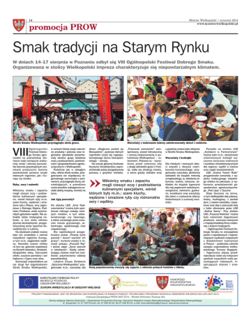 14 Monitor Wielkopolski | wrzesień 2014 www.monitorwielkopolski.pl promocja PROW Smak tradycji na Starym Rynku FOT. 3 X ARCHIWUM SR KSOW W dniach 14-17 sierpnia w Poznaniu odbył się VIII Ogólnopolski Festiwal Dobrego Smaku. Organizowana w stolicy Wielkopolski impreza charakteryzuje się niepowtarzalnym klimatem. Strefa Smaku Wielkopolski przyciągnęła wielu gości. VIII Ogólnopolski Festiwal Dobrego Smaku zgromadził na poznańskiej starówce ludzi ceniących znakomity smak i zdrową żywność. Na barwnie przystrojonych stoiskach producenci dumnie prezentowali zarówno smaki własnych regionów, jak i Europy czy świata. Ryby, sery i nalewki Miłośnicy smaku i zapachu mogli cieszyć oczy i podniebienia kulinarnymi specjałami, wśród których były m.in. szare kluchy, wędzone i smażone ryby z Mazur, sery zagrodowe z Dolnego Śląska, Podhala i Podlasia, wiele wyśmienitych gatunków wędlin. Nie zabrakło także tradycyjnej nalewki, w tym wielu odmian słynnej benedyktynki, przygotowywanej przez opactwo benedyktynów w Lubiniu. Na stoiskach znaleźć można było też smakołyki z niemal wszystkich regionów Europy, w tym m.in. węgierskie wędliny, litewskie czarne chleby (w tym np. gatunek wypiekany na liściach tataraku), kindziuki, hiszpańskie oliwy, francuskie oliwki, suszone pomidory i ser halloumi z Cypru oraz wina. Samorząd województwa po raz drugi był organizatorem Strefy Smaku Wielkopolski, w ramach której swoje naturalne produkty i potrawy oraz regionalne rękodzieło prezentowały lokalne grupy działania wraz z producentami, przetwórcami i gospodarstwami agroturystycznymi z Wielkopolski. Podobnie jak w ubiegłym roku, oferta strefy smaku, przygotowana we współpracy regionalnego samorządu z partnerami, przyciągnęła tłumy odwiedzających, a prawdziwa uczta zmysłów wzbogacona została dobrą muzyką, również na żywo. Jak żyją pszczoły? Na stoisku LGD „Unia Nadwarciańska” można było spróbować różnego rodzaju świeżych miodów, w tym wielokwiatowego czy lipowego, a także cenionego przez znawców miodu gryczanego, pikantnego, spadziowego oraz rzepakowego. Dla najmłodszych przygotowano pokaz „Poznaj życie pszczół i doceń wartość ich pracy!”, konkurs wiedzy w ramach pokazu „Pszczeli Raj” i pokaz zdjęć „Życie pszczół w obiektywie”. Każdy odwiedzający stoisko miał też możliwość przymierzenia odzieży pszczelarskiej. Lokalna Grupa Działania „Gościnna Wielkopolska” przygotowała m.in. warsztaty dla Warsztaty z malowania talerzy zainteresowały dzieci i rodziców. dzieci „Magiczna podróż po Biskupiźnie”, podczas których najmłodsi uczyli się najpopularniejszego tańca biskupiańskiego – wiwata. Na scenie głównej festiwalu Krystyna Drzażdżyńska zaprezentowała pokaz przygotowania potrawy z grzybów shiitake. „Przysmak jutrosiński” zainspirowany został klimatyczną i uroczą miejscowością w południowej Wielkopolsce – Jutrosinem. Potrawa ta – wymyślona przed czterema laty z okazji odwiedzin gości z Francji, stała się atrakcją miasta, a same grzyby shiitake wraz Miłośnicy smaku i zapachu mogli cieszyć oczy i podniebienia kulinarnymi specjałami, wśród których były m.in.: szare kluchy, wędzone i smażone ryby czy różnorodne sery i wędliny. z grzybnią można było obejrzeć w Strefie Smaku Wielkopolski. Warsztaty i koktajle Dla młodych i starszych dzieci artystki z obszaru czarnkowsko-trzcianeckiego przygotowały warsztaty zdobienia zakładek do książek metodą scrapbookingu, tj. zdobienia albumów, kartek, notesów, zakładek do książek typowymi dla niej papierami ozdobnymi, wstążkami, cekinami, guzikami, koralikami oraz warsztaty dla dzieci z malowania talerzy biskwitowych (z surowej ceramiki). Dużą popularnością cieszyły się zajęcia z robienia polnych kwiatów z bibuły. Ponadto na stoisku LGD „Solidarni w Partnerstwie” można było m.in. skosztować witaminowych koktajli warzywno-owocowo-ziołowych i wyrobów charakterystycznych dla regionu: wędlin w cieście oraz rogali kasztelańskich. LGD „Kraina Trzech Rzek” przygotowała warsztaty z wypieku tradycyjnego wiejskiego chleba na zakwasie, w wykonaniu przedstawicieli gospodarstwa agroturystycznego „Pod Lipą” z Sycyna. Oleje tłoczone na zimno, w tym wielkopolski olej rydzowy, lniany, budwigowy, z pestek dyni, z nasion wiesiołka, rzepakowy oraz olej z czarnuszki były z kolei oferowane przez LGD „Dolina Samy”. Przy stoisku LGD „Puszcza Notecka” można było natomiast degustować przetwory owocowo-warzywne z międzychodzkiej firmy rodzinnej z dużymi tradycjami. – Ogólnopolski Festiwal Dobrego Smaku to niewątpliwie jedno z największych i najważniejszych wydarzeń związanych z dziedzictwem kulinarnym w Polsce – podkreśla członek zarządu województwa wielkopolskiego Tomasz Bugajski. – Tegoroczna edycja przedsięwzięcia stała się miejscem spotkań wszystkich osób poszukujących ciekawych, inspirujących doznań i smaków. SAMORZĄD WOJEWÓDZTWA WIELKOPOLSKIEGO PROJEKT FINANSOWANY JEST ZE ŚRODKÓW UNII EUROPEJSKIEJ W RAMACH POMOCY TECHNICZNEJ PROGRAMU ROZWOJU OBSZARÓW WIEJSKICH NA LATA 2007-2013. Instytucja Zarządzająca PROW 2007-2013 – Minister Rolnictwa i Rozwoju Wsi Stronę redaguje: Bartosz Zielonacki – Departament Programów Rozwoju Obszarów Wiejskich Urzędu Marszałkowskiego Województwa Wielkopolskiego ul. Szyperska 14, 61-754 Poznań, tel. 61 626 60 00, fax 61 626 60 04, e-mail: [email protected], www.prow.umww.pl