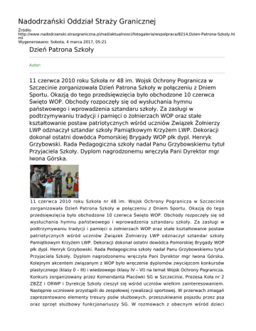 Nadodrzański Oddział Straży Granicznej Źródło: http://www.nadodrzanski.strazgraniczna.pl/nad/aktualnosci/fotogaleria/wspolpraca/8214,Dzien-Patrona-Szkoly.ht ml Wygenerowano: Sobota, 4 marca 2017, 05:21 Dzień Patrona Szkoły Autor: 11 czerwca 2010 roku Szkoła nr 48 im. Wojsk Ochrony Pogranicza w Szczecinie zorganizowała Dzień Patrona Szkoły w połączeniu z Dniem Sportu. Okazją do tego przedsięwzięcia było obchodzone 10 czerwca Święto WOP. Obchody rozpoczęły się od wysłuchania hymnu państwowego i wprowadzenia sztandaru szkoły. Za zasługi w podtrzymywaniu tradycji i pamięci o żołnierzach WOP oraz stałe kształtowanie postaw patriotycznych wśród uczniów Związek Żołnierzy LWP odznaczył sztandar szkoły Pamiątkowym Krzyżem LWP. Dekoracji dokonał ostatni dowódca Pomorskiej Brygady WOP płk dypl. Henryk Grzybowski. Rada Pedagogiczna szkoły nadał Panu Grzybowskiemu tytuł Przyjaciela Szkoły. Dyplom nagrodzonemu wręczyła Pani Dyrektor mgr Iwona Górska. 11 czerwca 2010 roku Szkoła nr 48 im. Wojsk Ochrony Pogranicza w Szczecinie zorganizowała Dzień Patrona Szkoły w połączeniu z Dniem Sportu. Okazją do tego przedsięwzięcia było obchodzone 10 czerwca Święto WOP. Obchody rozpoczęły się od wysłuchania hymnu państwowego i wprowadzenia sztandaru szkoły. Za zasługi w podtrzymywaniu tradycji i pamięci o żołnierzach WOP oraz stałe kształtowanie postaw patriotycznych wśród uczniów Związek Żołnierzy LWP odznaczył sztandar szkoły Pamiątkowym Krzyżem LWP. Dekoracji dokonał ostatni dowódca Pomorskiej Brygady WOP płk dypl. Henryk Grzybowski. Rada Pedagogiczna szkoły nadał Panu Grzybowskiemu tytuł Przyjaciela Szkoły. Dyplom nagrodzonemu wręczyła Pani Dyrektor mgr Iwona Górska. Kolejnym akcentem związanym z WOP było wręczenie dyplomów zwycięzcom konkursów plastycznego (klasy 0 – III) i wiedzowego (klasy IV – VI) na temat Wojsk Ochrony Pogranicza. Konkurs zorganizowany przez Komendanta Placówki SG w Szczecinie, Prezesa Koła nr 2 ZBŻZ i ORWP i Dyrekcję Szkoły cieszył się wśród uczniów wielkim zainteresowaniem. Następnie uczniowie przystąpili do zespołowej rywalizacji sportowej. W przerwach zmagań zaprezentowano elementy tresury psów służbowych, przeszukiwanie pojazdu przez psa oraz sprzęt służbowy funkcjonariuszy SG. W rozmowach z obecnym wśród dzieci funkcjonariuszami można było się dowiedzieć wielu ciekawych rzeczy na temat służby w straży granicznej. Ciekawe i emocjonujące konkurencje przygotował także Prezes Koła nr 2 ZBŻZ i ORWP – ppłk Andrzej Selega. Uczniowie mogli spróbować swoich sił w rzucie imitacja granatu na celność, biegu po kopercie oraz składaniu i zakładaniu maski gazowej. Wszyscy uczestnicy zostali słodko nagrodzeni. Ostatnim akcentem sportowym był mecz siatkówki drużyny funkcjonariuszek PSG w Szczecinie z nauczycielkami Szkoły nr 48. W ostatniej chwili ciało pedagogiczne wystawiło do gry swoje wychowanki – drużynę dziewcząt, które są aktualnymi wicemistrzyniami Polski szkół podstawowych. Zacięty set do końca nie był rozstrzygnięty. Szala zwycięstwa przechylała się raz na jedna raz na drugą stronę. Jednak ostatecznie zwyciężyła powaga i szacunek dla wieku (26: 24), choć najważniejsza była dobra zabawa. Udana impreza zostanie prawdopodobnie wpisana do corocznego kalendarza wydarzeń szkolnych.