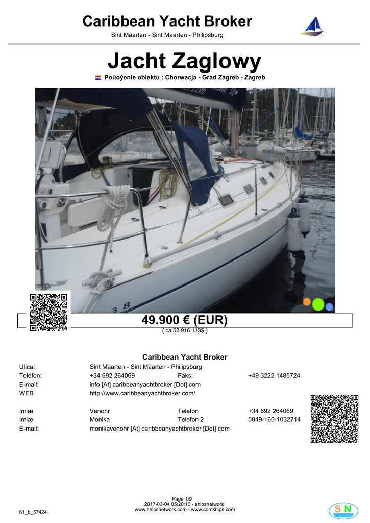 Caribbean Yacht Broker Sint Maarten - Sint Maarten - Philipsburg Jacht Zaglowy Poùoýenie obiektu : Chorwacja - Grad Zagreb - Zagreb 49.900 € (EUR) ( ca 52.916 US$ ) Caribbean Yacht Broker Ulica: Telefon: E-mail: WEB Sint Maarten - Sint Maarten - Philipsburg +34 692 264069 Faks: info [At] caribbeanyachtbroker [Dot] com http://www.caribbeanyachtbroker.com/ Imiæ Imiæ E-mail: Venohr Telefon Monika Telefon 2 monikavenohr [At] caribbeanyachtbroker [Dot] com 61_b_57424 Page 1/9 2017-03-04 05:20:10 - shipsnetwork www.shipsnetwork.com - www.comships.com +49 3222 1485724 +34 692 264069 0049-160-1032714 Caribbean Yacht Broker Sint Maarten - Sint Maarten - Philipsburg Typ ùodzi Numer kodu Typ ùodzi Producent: Model Designer Stan Materiaù Olinowanie Rok Kolor Dùugoúã LOA Dùugoúã LWL Wysokoúã pomieszczeñ Waga 61_b_57424 Jacht Zaglowy Harmony Yachts 38 Mortain / Mavrikios potrzebne CSF Slup 2008 biaùy 11,67 m ( 38,3 ft ) Numer kodu Zgùoú 7.500,0 kg ( 16.535 lbs ) Waga (Ballast) Ksztaùt kadùuba Kokpit Naprawianych roku Kontrola Szerokoúã Szkic Francja Jednokadùubowy Kokpit Aft Kolarstwo 3,82 m ( 12,5 ft ) 1,50 m ( 4,9 ft ) Dane na temat silnika - Napædy Silnik gùówny Prowadziã Wydajnoúã Rok Propeller Proste VOLVO Model Paliwo: 40,0 HP( 30 KW ) Godziny otwarcia Prædkoúã maksymalna Tankdaten Iloúã paliwa Woda Kanalizacja 61_b_57424 200 L( 53 Gal ) 500 L( 132 Gal ) Page 2/9 2017-03-04 05:20:10 - shipsnetwork www.shipsnetwork.com - www.comships.com D2 40 Caribbean Yacht Broker Sint Maarten - Sint Maarten - Philipsburg Sprzæt Okræty Instruments Zaloguj Compass GPS Anemometr Scoreboard Sonar Radar Ploter NavText Fax Pogoda VHF Radio SSB Pactor El Autopilot Wiatr Kontroli Fishfinder AIS Komputer Wyposaýenie techniczne Odtwarzacz CD Radio Telewizja Ùàcznoúã satelitarna Systemu 12 V DC Systemu 24 V DC Ùadowarka Solar Cells Wiatr Generator Wave Generator Generator 110-220 V Invertor 110-220 V Moc Shore Ogrzewanie Klimatyzacja Druckwasseranlage Systemu ciepùej wody Gazowniæ Watermaker Ster strumieniowy Divecompressor Bilgepump elektrycznie Bilgepump Maunel 61_b_57424 Urzadzenie & podzial Boat Equipment 3 6 1 1 2 Anchor Winda kotwiczna Teak Kàpieliska Ladder Prysznic rufowy Rack Equipment Trap Daivits Davit Ùódki Ùódki m. AB Bukszpryt Trim Tabs Wyposaýenie wnætrz Flybridge 2. Helm na lot Boat Trailer Kabiny Koje Toalety Zùy Wùaúciciele kabiny Spiýarnia Zatopiã Kuchenka gazowa Kuchenka elektryczna Piec Benzyna Piekarnik gazowy Piekarnik Elektryczny Lodówka Zamraýarka Kuchenka mikrofalowa Zmywarka Pralnia Bezpieczeñstwo Kamizelki ratunkowe Liferaft EPRIB Szperacze System Gaúnice Page 3/9 2017-03-04 05:20:10 - shipsnetwork www.shipsnetwork.com - www.comships.com Inne dodatki Szyber dach Hafenpersenning Latajàcy most Ganzpersenning Cieñ niedz Fly Markiza na rufie pokùad Bimini Sprayhood Caribbean Yacht Broker Sint Maarten - Sint Maarten - Philipsburg 61_b_57424 Page 4/9 2017-03-04 05:20:10 - shipsnetwork www.shipsnetwork.com - www.comships.com Caribbean Yacht Broker Sint Maarten - Sint Maarten - Philipsburg Poncin Yachts - Harmony 38 - 2008 Poncin Yachts - Harmony 38 - 2008 61_b_57424 Page 5/9 2017-03-04 05:20:10 - shipsnetwork www.shipsnetwork.com - www.comships.com Caribbean Yacht Broker Sint Maarten - Sint Maarten - Philipsburg Poncin Yachts - Harmony 38 - 2008 Poncin Yachts - Harmony 38 - 2008 61_b_57424 Page 6/9 2017-03-04 05:20:10 - shipsnetwork www.shipsnetwork.com - www.comships.com Caribbean Yacht Broker Sint Maarten - Sint Maarten - Philipsburg Poncin Yachts - Harmony 38 - 2008 Poncin Yachts - Harmony 38 - 2008 61_b_57424 Page 7/9 2017-03-04 05:20:10 - shipsnetwork www.shipsnetwork.com - www.comships.com Caribbean Yacht Broker Sint Maarten - Sint Maarten - Philipsburg Poncin Yachts - Harmony 38 - 2008 Poncin Yachts - Harmony 38 - 2008 61_b_57424 Page 8/9 2017-03-04 05:20:10 - shipsnetwork www.shipsnetwork.com - www.comships.com Caribbean Yacht Broker Sint Maarten - Sint Maarten - Philipsburg Poncin Yachts - Harmony 38 - 2008 61_b_57424 Page 9/9 2017-03-04 05:20:10 - shipsnetwork www.shipsnetwork.com - www.comships.com