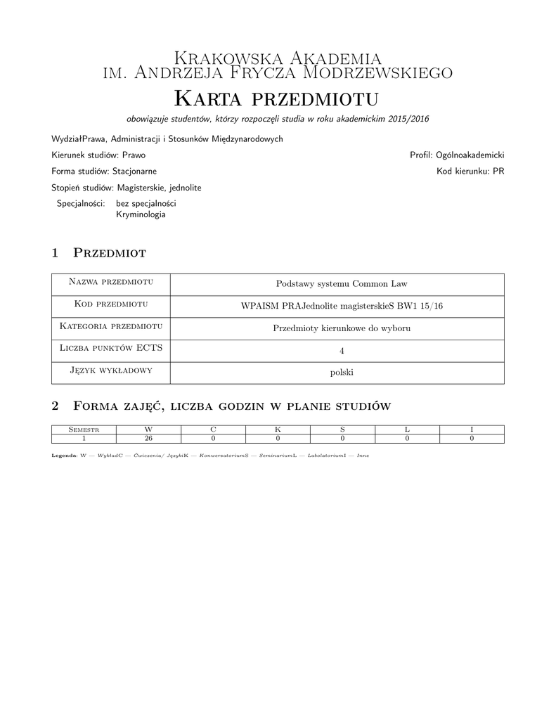 Krakowska Akademia im. Andrzeja Frycza Modrzewskiego Karta przedmiotu obowiązuje studentów, którzy rozpoczęli studia w roku akademickim 2015/2016 WydziałPrawa, Administracji i Stosunków Międzynarodowych Kierunek studiów: Prawo Profil: Ogólnoakademicki Forma studiów: Stacjonarne Kod kierunku: PR Stopień studiów: Magisterskie, jednolite Specjalności: 1 2 bez specjalności Kryminologia Przedmiot Nazwa przedmiotu Podstawy systemu Common Law Kod przedmiotu WPAISM PRAJednolite magisterskieS BW1 15/16 Kategoria przedmiotu Przedmioty kierunkowe do wyboru Liczba punktów ECTS 4 Język wykładowy polski Forma zajęć, liczba godzin w planie studiów Semestr 1 W 26 C 0 K 0 S 0 Legenda: W — WykładC — Ćwiczenia/ JęzykiK — KonwersatoriumS — SeminariumL — LabolatoriumI — Inne L 0 I 0 Krakowska Akademia im. Andrzeja Frycza Modrzewskiego 3 Cele przedmiotu Cel 1 Zapoznanie studentów z różnicami występującymi między europejskim prawem kontynentalnym (civil law), w tym prawem polskim, a prawem anglosaskim (common law). Cel 2 Zapoznanie studentów z podstawowymi elementami systemów prawnych należących do kultury prawnej common law, w szczególności z systemem sądownictwa, zawodami prawniczymi i modelem parlamentarnym w Wielkiej Brytanii i USA. 4 Wymagania wstępne 1 Elementarna wiedza z zakresu nauk humanistycznych. 5 Modułowe efekty kształcenia MW1 Student, który zaliczył przedmiot definiuje w stopniu pogłębionym różnice między kontynentalnym, a anglosaskim systemem prawa. Zna i rozumie pojęcia i instytucje zasadnicze dla common law w Anglii i USA, ze szczególnym uwzględnieniem tych, które nie posiadają odpowiedników w civil law. Potrafi scharakteryzować aktualne zmiany w angielskim systemie prawnym i wskazuje ich genezę historyczną. MU2 Student, który zaliczył przedmiot potrafi sformułować uogólnione oceny odnoszące się do instytucji prawa polskiego, na tle angielskich i amerykańskich rozwiązań systemowych. Umie wskazać sytuacje problemowe, związane z różnicami między prawem kontynentalnym, w tym polskim, a prawem angielskim. Potrafi odnieść zdobytą wiedzę do angielskiej przestrzeni prawnej. Jest przygotowany do dalszych studiów nad angielskim systemem prawa. MK3 Student, który zaliczył przedmiot rozumie praktyczne znaczenie studiów nad prawem anglosaskim. Dostrzega znaczenie wiedzy z zakresu prawa anglosaskiego dla swojej konkurencyjności na międzynarodowym rynku pracy. Rozumie potrzebę ciągłego dokształcania się w zakresie systemów prawnych innych krajów. MK4 Student, który zaliczył przedmiot rozumie rozwiązane przyjęte w anglosaskiej kulturze prawnej, odnoszące się do prawa jako regulatora stosunków społecznych. Posiada zdolność krytycznej analizy porównawczej systemów prawnych należących do common law i civil law, w szczególności prawa angielskiego i polskiego. 6 Treści programowe Lp W1 W2 W3 W4 Wykład Tematyka zajęć Opis szczegółowy bloków tematycznych 1.Pojęcia podstawowe: precedens i jego struktura: ratio decidendi , obider dicta; zasada stare decisis; pojęcia common law, equity law, statutory law. 2.Geneza i powstanie common law; common law wobec recepcji prawa rzymskiego; podstawowe różnice między systemem common law (prawem anglosaskim) i civil law (prawem kontynentalnym). Pojęcie "rule of law" (rządów prawa). 3.Najważniejsi urzędnicy i sędziowie angielscy: Lord Chancellor, Lord Chief Justice, Master of the Rolls, Attorney General. Zmiana pozycji Lorda Kanclerza w angielskim wymiarze sprawiedliwości w świetle reformy z lat 2003 - 2007 z uwzględnieniem zagadnienia trójpodziału władz. Lord Kanclerz jako angielski Minister Sprawiedliwości. Lord Chief Justice jako zwierzchnik angielskiego sądownictwa. 4.Angielskie zawody prawnicze; judge, barrister, solicitor. Wykształcenie prawnicze w Wielkiej Brytanii i w USA. Prawniczy samorząd zawodowy w Anglii (Inns of Court, Bar Council, Law Society). Call to the bar, bar vocational course, apprenticeship. Dywersyfikacja zawodu solicytora. Attorney i legal adviser w USA. Instytucja notary public w USA. Paralegal w USA i w Anglii. Strona 2/5 Liczba godzin 1 2 2 3 Krakowska Akademia im. Andrzeja Frycza Modrzewskiego Lp W5 W6 W7 W8 W9 W10 W11 W12 W13 W14 Wykład Tematyka zajęć Opis szczegółowy bloków tematycznych 5.Pozycja sędziego jako twórcy prawa w anglosaskim systemie prawa. Olivier Wendell Holmes i jego wpływ na amerykańską doktrynę sądowego stosowania prawa. Rozumowanie "bottom - up" w sądowym stosowaniu prawa. Zróżnicowanie angielskich zawodów sądowych: recorders, district judges, circuit judges. Fenomen sędziego pokoju (justice of the peace). 6.Struktura angielskiego sądownictwa. Rola ławy przysięglych w sądownictwie anglosaskim. Sądownictowo karne i cywilne: Magistrates Courts, Crown Courts, County Courts, High Court of Justice, Court of Appeal, Judicial Committee of House of Lords; struktura i właściwość Wydziałów HCJ. Queen’s Bench Division, Chancery Division’ Family Division of HCJ i ich orzecznictwo. Reforma systemu angielskiego sądownictwa w XIX i XX w. 7.Reforma konstytucyjna z 2005 roku i jej wpływ na sądownictwo angielskie. Przyjęcie the Human Rights Act. Utworzenie Ministerstwa Sprawiedliwości (Ministry of Justice) i zmiany w Ministerstwie Spraw Wewnętrznych (Home Office). 8.Powstanie prokuratury angielskiej. The Crown Prosecution Service, Director of Public Prosecution. 9.Zdecentralizowana struktura policji angielskiej i jej geneza. Rozwój i struktura the Metropolitan London Police. 10.Typologia przestępstw w Anglii (summary offences, triable either way offences, indictable offences) i w USA (infractions, misdemeanours, felonies). 11.Coroner (Wielka Brytania) i medical examiner (USA); pojęcie forensic sciences. 12.Parlamentaryzm angielski; House of Lords i House of Commons; wybory do parlamentu angielskiego; reforma Izby Lordów; odrodzenie parlamentu szkockiego. Królowa w
