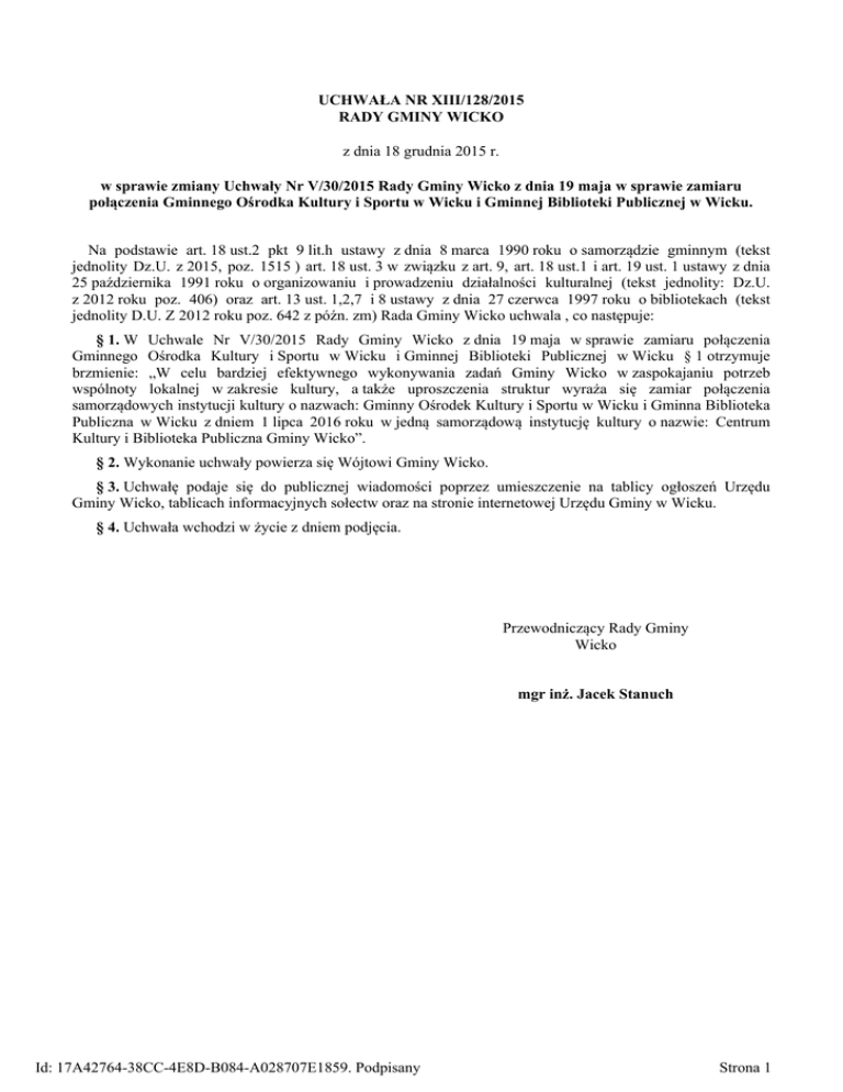 UCHWAŁA NR XIII/128/2015 RADY GMINY WICKO z dnia 18 grudnia 2015 r. w sprawie zmiany Uchwały Nr V/30/2015 Rady Gminy Wicko z dnia 19 maja w sprawie zamiaru połączenia Gminnego Ośrodka Kultury i Sportu w Wicku i Gminnej Biblioteki Publicznej w Wicku. Na podstawie art. 18 ust.2 pkt 9 lit.h ustawy z dnia 8 marca 1990 roku o samorządzie gminnym jednolity Dz.U. z 2015, poz. 1515 ) art. 18 ust. 3 w związku z art. 9, art. 18 ust.1 i art. 19 ust. 1 ustawy 25 października 1991 roku o organizowaniu i prowadzeniu działalności kulturalnej (tekst jednolity: z 2012 roku poz. 406) oraz art. 13 ust. 1,2,7 i 8 ustawy z dnia 27 czerwca 1997 roku o bibliotekach jednolity D.U. Z 2012 roku poz. 642 z późn. zm) Rada Gminy Wicko uchwala , co następuje: (tekst z dnia Dz.U. (tekst § 1. W Uchwale Nr V/30/2015 Rady Gminy Wicko z dnia 19 maja w sprawie zamiaru połączenia Gminnego Ośrodka Kultury i Sportu w Wicku i Gminnej Biblioteki Publicznej w Wicku § 1 otrzymuje brzmienie: „W celu bardziej efektywnego wykonywania zadań Gminy Wicko w zaspokajaniu potrzeb wspólnoty lokalnej w zakresie kultury, a także uproszczenia struktur wyraża się zamiar połączenia samorządowych instytucji kultury o nazwach: Gminny Ośrodek Kultury i Sportu w Wicku i Gminna Biblioteka Publiczna w Wicku z dniem 1 lipca 2016 roku w jedną samorządową instytucję kultury o nazwie: Centrum Kultury i Biblioteka Publiczna Gminy Wicko”. § 2. Wykonanie uchwały powierza się Wójtowi Gminy Wicko. § 3. Uchwałę podaje się do publicznej wiadomości poprzez umieszczenie na tablicy ogłoszeń Urzędu Gminy Wicko, tablicach informacyjnych sołectw oraz na stronie internetowej Urzędu Gminy w Wicku. § 4. Uchwała wchodzi w życie z dniem podjęcia. Przewodniczący Rady Gminy Wicko mgr inż. Jacek Stanuch Id: 17A42764-38CC-4E8D-B084-A028707E1859. Podpisany Strona 1 Uzasadnienie UZASADNIENIE ZAMIARU POŁĄCZENIA INSTYTUCJI KULTURY W GMINIE WICKO POPRZEZ WSKAZANIE CELOWOŚCI I OCENY POŁĄCZENIA GMINNEGO OŚRODKA KULTURY I SPORTU W WICKU Z GMINNĄ BIBLIOTEKĄ PUBLICZNĄ W WICKU Nowelizacją ustawy z dnia 31 sierpnia 2011 r. o zmianie ustawy o organizowaniu i prowadzeniu działalności kulturalnej oraz niektórych innych ustaw (Dz. U. Nr 207, poz. 1230) dokonano m. in. zmiany w zakresie zasad organizowania bibliotek publicznych, w tym wprowadzono możliwość łączenia tych bibliotek z innymi instytucjami kultury. Zgodnie z art. 13 ust. 2 ww. ustawy organizator jest zobowiązany na 6 miesięcy przed dniem wydania aktu o połączeniu, podziale lub likwidacji biblioteki podać do publicznej wiadomości informację o swoim zamiarze wraz z uzasadnieniem. W tym celu konieczne jest podjęcie uchwały przez Radę Gminy Wicko o zamiarze połączenia instytucji kultury. Zgodnie z art. 13 ust. 7 ww. ustawy biblioteki publiczne mogą być łączone z innymi instytucjami kultury jeżeli połączenie nie spowoduje uszczerbku w wykonywaniu dotychczasowych zadań. Połączenie funkcjonujących na terenie Gminy Wicko dwóch instytucji kultury, a mianowicie Gminnego Ośrodka Kultury i Sportu w Wicku i Gminnej Biblioteki Publicznej w Wicku umożliwi zapewnienie dokładniejszego nadzoru organu wykonawczego, tj. Wójta, zaplanowanie pracy rocznej jako jednego podmiotu, przy realizacji jednego budżetu dającego niższe koszty operacyjne i możliwość sprawniejszego nadzoru. Załogi i mienie obu instytucji zostaną połączone w jeden organizm, co pozwoli stosowanie jednej obsługi finansowo – kadrowej i organizacyjnej, obsługi, sprzętu i urządzeń. Określone w art. 19 ustawy o bibliotekach zadania biblioteki będą zapewnione na dotychczasowym poziomie, nie zostanie zmieniony sposób dogodnego dostępu do materiałów bibliotecznych i informacji. Nadto zapewniony zostanie jeszcze szerszy dostęp do księgozbiorów dzięki wprowadzeniu możliwości udostępnienia zbiorów poprzez funkcjonujące na terenie Gminy świetlice wiejskie. Obecnie Gminny Ośrodek Kultury i Sportu zarządza 13 świetlicami. Pozwoli to przede wszystkim na ułatwienie dostępu do zbiorów bibliotecznych nowym osobom często starszym i mającym trudności w poruszaniu się, ale również dzieciom i młodzieży. Gromadzenie, opracowywanie, przechowywanie i ochrona materiałów bibliotecznych służących rozwijaniu czytelnictwa, zaspokajanie potrzeb informacyjnych, edukacyjnych, samokształceniowych, udostępnianie zbiorów na miejscu, wypożyczanie na zewnątrz, prowadzenie działalności bibliograficznej, dokumentacyjnej i edukacyjnej oraz informacyjnej, zwłaszcza informowanie o zbiorach własnych, innych bibliotek, muzeów i ośrodków informacji naukowej, a także współdziałanie z archiwami w tym zakresie będzie utrzymane i zapewnione na wysokim poziomie, przy profesjonalnej obsłudze finansowo- kadrowej i organizacyjnej. Organizowanie czytelnictwa i udostępnianie materiałów bibliotecznych ludziom chorym i niepełnosprawnym będzie realizowane w szerszym zakresie i stanowiło zadania priorytetowe w działalności bibliotecznej. Jednocześnie organizowanie różnorodnych form edukacji kulturalnej, wychowanie przez sztukę, gromadzenie, dokumentowanie, tworzenie, ochrona i udostępnianie dóbr kultury, tworzenie warunków dla rozwoju amatorskiego ruchu artystycznego, folkloru, a także rękodzieła artystycznego i ludowego oraz zainteresowania wiedzą i sztuką, zapewnienie pomocy i opieki merytorycznej i organizacyjnej placówkom oraz ruchowi kulturalnemu na terenie gminy, rozwijanie aktywności kulturalno - wychowawczej, kształtowanie postaw społecznych, podnoszenie poziomu życia kulturalnego mieszkańców w zakresie kultury życia codziennego, rozbudzanie zainteresowań, promowanie zespołów, organizowanie imprez będzie nadal rozwijane i obejmie swoim zasięgiem również tereny wiejskie poprzez dotarcie do tego środowiska z programami realizowanymi w ramach istniejących świetlic wiejskich. Połączenie instytucji kultury i biblioteki publicznej m