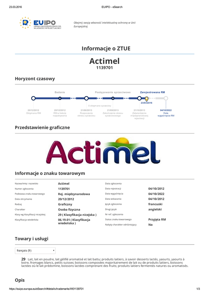 23.03.2016 EUIPO - eSearch Obejmij swoją własność intelektualną ochroną w Unii Europejskiej Informacje o ZTUE Actimel 1139701 Horyzont czasowy Badanie Postępowanie sprzeciwowe Zarejestrowana RM 23/03/2016 0 otrzymane sprzeciwy 20/12/2012 Otrzymana RM 20/12/2012 RM w trakcie rozpatrywania 21/06/2013 Rozpoczecie okresu sprzeciwu 21/09/2013 Zakończenie okresu sprzeciwowego 21/10/2013 Zatwierdzenie międzynarodowej rejestracji 04/10/2022 Data wygaśnięcia RM Przedstawienie graficzne Informacje o znaku towarowym Nazwa/imię i nazwisko Actimel Data zgłoszenia Numer zgłoszenia 1139701 Data rejestracji 04/10/2012 Podstawa znaku towarowego Rej. międzynarodowa Data wygaśnięcia 04/10/2022 Data otrzymania 20/12/2012 Data wskazania 04/10/2012 Rodzaj Graficzny Język zgłoszenia francuski Charakter Osoba fizyczna Drugi język angielski Klasy wg klasyfikacji nicejskiej 29 ( Klasyfikacja nicejska ) Nr ref. zgłoszenia Klasyfikacja wiedeńska 06.19.01 ( Klasyfikacja wiedeńska ) Status znaku towarowego Przyjęta RM Nabyty charakter odróżniający No Towary i usługi français (fr) 29 Lait, lait en poudre, lait gélifié aromatisé et lait battu; produits laitiers, à savoir desserts lactés, yaourts, yaourts à boire, fromages blancs, petits suisses; boissons composées majoritairement de lait ou de produits laitiers, boissons lactées où le lait prédomine, boissons lactées comprenant des fruits; produits laitiers fermentés natures ou aromatisés. Opis https://euipo.europa.eu/eSearch/#details/trademarks/W01139701 1/3 23.03.2016 EUIPO - eSearch Brak wpisu Właściciele COMPAGNIE GERVAIS DANONE Numer identyfikac…n/a Kraj FR - FRANCJA Adres korespondencyjny 17 boulevard Haussmann F75009 PARIS Organizacja n/a Region n/a Forma prawna SOCIETE ANONYME Miejscowość n/a Kod pocztowy n/a Adres n/a Możliwość dostępu i zmiany przez uprawnionego użytkownika za pośrednictwem User Area Możliwość dostępu i zmiany przez uprawnionego użytkownika za pośrednictwem User Area Możliwość dostępu i zmiany przez uprawnionego użytkownika za pośrednictwem User Area Pełnomocnicy Brak wpisu Korespondencja Od Procedura Numer zgłoszenia Temat RM 1139701 07/11/2013 RM 1139701 22/10/2013 RM 1139701 22/10/2013 RM 1139701 10/01/2013 RM 1139701 RM 1139701 24/12/2012 RM 1139701 24/12/2012 RM 1139701 20/12/2012 RM 1139701 20/12/2012 Search Report (Union) Data Działania 09/01/2013 Pokazywanie od 1 do 9 9 wpisów Przekształcenie RM Brak wpisu Starszeństwo Brak wpisu Pierwszeństwo z wystawienia Brak wpisu Pierwszeństwo https://euipo.europa.eu/eSearch/#details/trademarks/W01139701 2/3 23.03.2016 Pierwszeństwo EUIPO - eSearch Kraj Numer zgłoszenia Data Status FRANCJA 12 3 910 650 04/04/2012 Zaakceptowano Pokazywanie od 1 do 1 1 wpisów Publikacje Numer biuletynu Data Sekcja Opis 2012/243 21/12/2012 M.1 IR_M_1 2013/201 22/10/2013 M.3.1 IR_M_3_1 Pokazywanie od 1 do 2 2 wpisów Unieważnienie WZT Brak wpisu Wpisy Brak wpisu Sprzeciwy Brak wpisu Odwołania Brak wpisu Decyzje Brak wpisu Przedłużenia Brak wpisu Powiązania znaku towarowego Brak wpisu https://euipo.europa.eu/eSearch/#details/trademarks/W01139701 3/3