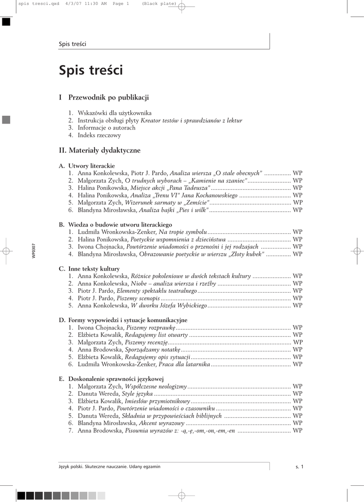 spis tresci.qxd 4/3/07 11:30 AM Page 1 (Black plate) Spis treÊci Spis treÊci I Przewodnik po publikacji 1. 2. 3. 4. Wskazówki dla u˝ytkownika Instrukcja obs∏ugi p∏yty Kreator testów i sprawdzianów z lektur Informacje o autorach Indeks rzeczowy II. Materia∏y dydaktyczne WP0307 A. Utwory literackie 1. Anna Konkolewska, Piotr J. Pardo, Analiza wiersza „O stale obecnych” ................ WP 2. Ma∏gorzata Zych, O trudnych wyborach – „Kamienie na szaniec”.......................... WP 3. Halina Ponikowska, Miejsce akcji „Pana Tadeusza”................................................ WP 4. Halina Ponikowska, Analiza „Trenu VI” Jana Kochanowskiego ............................... WP 5. Ma∏gorzata Zych, Wizerunek sarmaty w „ZemÊcie”................................................. WP 6. Blandyna Miros∏awska, Analiza bajki „Pies i wilk”................................................. WP B. Wiedza o budowie utworu literackiego 1. Ludmi∏a Wronkowska-Zenker, Na tropie symbolu .................................................. WP 2. Halina Ponikowska, Poetyckie wspomnienia z dzieciƒstwa ...................................... WP 3. Iwona Chojnacka, Powtórzenie wiadomoÊci o przenoÊni i jej rodzajach .................. WP 4. Blandyna Miros∏awska, Obrazowanie poetyckie w wierszu „Z∏oty kubek” ............... WP C. Inne teksty kultury 1. Anna Konkolewska, Ró˝nice pokoleniowe w dwóch tekstach kultury ....................... WP 2. Anna Konkolewska, Niobe – analiza wiersza i rzeêby ............................................ WP 3. Piotr J. Pardo, Elementy spektaklu teatralnego........................................................ WP 4. Piotr J. Pardo, Piszemy scenopis .............................................................................. WP 5. Anna Konkolewska, W dworku Józefa Wybickiego.................................................. WP D. Formy wypowiedzi i sytuacje komunikacyjne 1. Iwona Chojnacka, Piszemy rozprawk´..................................................................... WP 2. El˝bieta Kowalik, Redagujemy list otwarty ............................................................. WP 3. Ma∏gorzata Zych, Piszemy recenzj´.......................................................................... WP 4. Anna Brodowska, Sporzàdzamy notatk´.................................................................. WP 5. El˝bieta Kowalik, Redagujemy opis sytuacji............................................................ WP 6. Ludmi∏a Wronkowska-Zenker, Praca dla latarnika ................................................ WP E. Doskonalenie sprawnoÊci j´zykowej 1. Ma∏gorzata Zych, Wspó∏czesne neologizmy.............................................................. WP 2. Danuta Wereda, Style j´zyka .................................................................................. WP 3. El˝bieta Kowalik, Imies∏ów przymiotnikowy ............................................................ WP 4. Piotr J. Pardo, Powtórzenie wiadomoÊci o czasowniku ............................................. WP 5. Danuta Wereda, Sk∏adnia w przypowieÊciach biblijnych ........................................ WP 6. Blandyna Miros∏awska, Akcent wyrazowy ............................................................... WP 7. Anna Brodowska, Pisownia wyrazów z: -à,-´,-om,-on,-em,-en ................................ WP J´zyk polski. Skuteczne nauczanie. Udany egzamin s. 1 spis tresci.qxd 4/3/07 11:30 AM Page 2 (Black plate) Spis treÊci III. Materia∏y dodatkowee 1. Foliogramy Marcello Bacciarelli, Portret Stanis∏awa Augusta Poniatowskiego ..................... WP B.1 Jean M. Moreau, Ko∏acz królewski. Alegoria I rozbioru Rzeczpospolitej ........... WP B.1 Andrzej Mleczko, *** [Ró˝nica pokoleƒ] ........................................................ WP C.1 Jerzy Duda Gracz, Dwa pokolenia .................................................................. WP C.1 Niobe os∏aniajàca najm∏odszà córk´ ................................................................ WP C.2 Rodzaje planów filmowych .............................................................................. WP C.4 2. P∏yta CD Kreator testów i sprawdzianów z lektur .................................................................. WP WP0307 s. 2 J´zyk polski. Skuteczne nauczanie. Udany egzamin