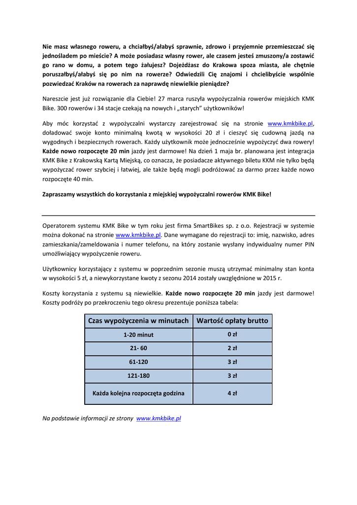 Nie masz własnego roweru, a chciałbyś/ałabyś sprawnie, zdrowo i przyjemnie przemieszczać się jednośladem po mieście? A może posiadasz własny rower, ale czasem jesteś zmuszony/a zostawić go rano w domu, a potem tego żałujesz? Dojeżdżasz do Krakowa spoza miasta, ale chętnie poruszałbyś/ałabyś się po nim na rowerze? Odwiedzili Cię znajomi i chcielibyście wspólnie pozwiedzać Kraków na rowerach za naprawdę niewielkie pieniądze? Nareszcie jest już rozwiązanie dla Ciebie! 27 marca ruszyła wypożyczalnia rowerów miejskich KMK Bike. 300 rowerów i 34 stacje czekają na nowych i „starych” użytkowników! Aby móc korzystać z wypożyczalni wystarczy zarejestrować się na stronie www.kmkbike.pl, doładować swoje konto minimalną kwotą w wysokości 20 zł i cieszyć się cudowną jazdą na wygodnych i bezpiecznych rowerach. Każdy użytkownik może jednocześnie wypożyczyć dwa rowery! Każde nowo rozpoczęte 20 min jazdy jest darmowe! Na dzień 1 maja br. planowana jest integracja KMK Bike z Krakowską Kartą Miejską, co oznacza, że posiadacze aktywnego biletu KKM nie tylko będą wypożyczać rower szybciej i łatwiej, ale także będą mogli podróżować za darmo przez każde nowo rozpoczęte 40 min. Zapraszamy wszystkich do korzystania z miejskiej wypożyczalni rowerów KMK Bike! Operatorem systemu KMK Bike w tym roku jest firma SmartBikes sp. z o.o. Rejestracji w systemie można dokonać na stronie www.kmkbike.pl. Dane wymagane do rejestracji to: imię, nazwisko, adres zamieszkania/zameldowania i numer telefonu, na który zostanie wysłany indywidualny numer PIN umożliwiający wypożyczenie roweru. Użytkownicy korzystający z systemu w poprzednim sezonie muszą utrzymać minimalny stan konta w wysokości 5 zł, a niewykorzystane kwoty z sezonu 2014 zostały uwzględnione w 2015 r. Koszty korzystania z systemu są niewielkie. Każde nowo rozpoczęte 20 min jazdy jest darmowe! Koszty podróży po przekroczeniu tego okresu prezentuje poniższa tabela: Czas wypożyczenia w minutach Wartość opłaty brutto 1-20 minut 0 zł 21- 60 2 zł 61-120 3 zł 121-180 3 zł Każda kolejna rozpoczęta godzina 4 zł Na podstawie informacji ze strony www.kmkbike.pl Na dzień 1 maja br. planowana jest integracja KMK Bike z Krakowską Kartą Miejską, co oznacza, że posiadacze aktywnego biletu KKM nie tylko będą wypożyczać rower szybciej i łatwiej, ale także będą mogli podróżować za darmo przez każde nowo rozpoczęte 40 min. Tabelę pozostałych (zredukowanych!) opłat dla użytkowników posiadających aktywny bilet KKM poniżej: Czas wypożyczenia w minutach Wartość opłaty brutto 1-40 minut 0 zł 41- 60 1 zł 61-120 2 zł 121-180 2 zł Każda kolejna rozpoczęta godzina 3 zł Na podstawie informacji ze strony www.kmkbike.pl Biuro Obsługi Klienta KMK Bike zapewnia użytkownikom całodobowy kontakt telefoniczny z operatorem KMK Bike pod numerem 12 616 75 75, a także kontakt poprzez pocztę elektroniczną na adres: [email protected] Więcej informacji na temat funkcjonowania systemu, mapka stacji oraz regulamin wypożyczalni na stronie www.kmkbike.pl. Mapka stacji: https://zikit.cartodb.com/tables/kmk_bike_istniejace/map