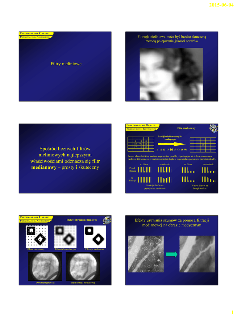2015-06-04 PRZETWARZANIE OBRAZU Filtracja nieliniowa może być bardzo skuteczną metodą polepszania jakości obrazów PRZEKSZTAŁCENIA KONTEKSTOWE Filtry nieliniowe PRZETWARZANIE OBRAZU Filtr medianowy PRZEKSZTAŁCENIA KONTEKSTOWE Spośród licznych filtrów nieliniowych najlepszymi właściwościami odznacza się filtr medianowy – prosty i skuteczny 1 12 17 13 98 16 19 17 13 Szeregowanie Wybór elementu w porządku środkowego rosnącym 16 16 17 1 12 13 13 16 17 17 17 19 19 98 98 Pewne własności filtru medianowego można przybliżyć posługując się jednowymiarowym modelem filtrowanego sygnału (wysokości słupków odpowiadają poziomowi jasności pikseli). mediana uśrednianie mediana uśrednianie Przed filtracją Po filtracji Reakcja filtrów na pojedyncze zakłócenie PRZETWARZANIE OBRAZU PRZEKSZTAŁCENIA KONTEKSTOWE Obraz zaszumiony Obraz rentgenowski Efekty filtracji medianowej Filtracja konwolucyjna Wpływ filtrów na brzegi obiektu Efekty usuwania szumów za pomocą filtracji medianowej na obrazie medycznym Filtracja medianowa Efekt filtracji medianowej 1 2015-06-04 PRZETWARZANIE OBRAZU Kości wysegmentowane metodą progową z danych niefiltrowanych (a) i po działaniu filtrem medianowym (c) oraz różnica pomiędzy a i c (b). PRZETWARZANIE OBRAZU Obraz oryginalny 3x3 5x5 7x7 9x9 Obraz oryginalny 3x3 5x5 7x7 9x9 a b c d e f b e d i 1 12 17 f 13 98 16 19 17 13 Okno pięciopunktowe MED (b, d, e, f, h) = MAX [ MIN (b, d, e), MIN (b, e, f), MIN (d, e, f), MIN (e, d, h) MIN (b, d, f), MIN (b, e, h), MIN (d, e, h), MIN (b, d, h), MIN (b, f, h), MIN (d, f, h), 12 13 13 16 17 17 19 98 1 12 17 13 98 16 19 17 13 Szeregowanie w porządku Wybór elementu rosnącym maksymalnego 98 98 1 12 13 13 16 17 17 19 98 ] Filtry kombinowane wykrywające krawędzie Idea filtrów kombinowanych polega na kolejnym zastosowaniu dwóch gradientów w prostopadłych do siebie kierunkach, a następnie na dokonaniu nieliniowej kombinacji wyników tych gradientów. Dzięki nieliniowej kombinacji rezultatów liniowych transformacji obrazu tworzy się w ten sposób obraz wynikowy o wyjątkowo dobrze podkreślonych konturach niezależnie od kierunku ich przebiegu. Do połączenia (kombinowania) obrazów można użyć formuły Euklidesowej: L ' m, n 1 11 • Filtr maksymalny. 2) Wyznaczanie wartości mediany bez sortowania elementów. PRZEKSZTAŁCENIA KONTEKSTOWE Wybór elementu Szeregowanie w porządku minimalnego rosnącym h Okno dziewięciopunktowe PRZETWARZANIE OBRAZU Filtr minimalny i maksymalny PRZEKSZTAŁCENIA KONTEKSTOWE • Filtr minimalny. 1) Zmniejszanie ilości punktów w oknie. h Jakość filtracji medianowej silnie zależy od wielkości używanego okna: PRZETWARZANIE OBRAZU Modyfikacje mediany PRZEKSZTAŁCENIA KONTEKSTOWE g Wady filtracji medianowej PRZEKSZTAŁCENIA KONTEKSTOWE PRZETWARZANIE OBRAZU PRZEKSZTAŁCENIA KONTEKSTOWE Działanie filtru kombinowanego Używane są tu gradienty Sobela Obraz z wydobytymi konturami poziomymi L1 m, n 2 L2 m, n 2 Obraz wejściowy Obraz wynikowy L’(m,n) - punkt obrazu wynikowego L1(m,n), L2(m,n) - punkty na obrazach powstałych po zastosowaniu gradientów Obraz z wydobytymi konturami pionowymi 2 2015-06-04 PRZETWARZANIE OBRAZU PRZEKSZTAŁCENIA KONTEKSTOWE PRZETWARZANIE OBRAZU Filtry kombinowane - uproszczenie obliczeń W celu uproszczenia obliczeń do łączenia obrazów stosuje się uproszczoną formułę modułową pozwalającą na uzyskiwanie praktycznie równie dobrych wyników. L ' m, n L1 m, n L2 m, n PRZEKSZTAŁCENIA KONTEKSTOWE Filtry adaptacyjne Filtry adaptacyjne zmieniają charakterystykę działania w zależności od cech analizowanego obszaru. Filtry te działają dwuetapowo: W pierwszym etapie wyznaczany jest parametr klasyfikujący dany punkt do krawędzi. Jako kryterium można przyjąć wariancję stopni szarości w jego otoczeniu. W drugim etapie dokonuje się filtracji filtrem uśredniającym, ale tylko tych punktów, które nie zostały zakwalifikowane do krawędzi. Punkty należące do krawędzi pozostają bez zmian. Obraz wynikowy przy zastosowaniu formuły modułowej Obraz wynikowy przy zastosowaniu formuły Euklidesowej Przykładowy wynik filtracji obrazu filtrem adaptacyjnym Obraz wejściowy Obraz wynikowy Detekcja krawędzi Obraz konturowy, który powstaje w następstwie automatycznej detekcji krawędzi, niesie często wystarczająco dużo informacji, żeby w pełni scharakteryzować istotne cechy obrazu (na przykład kształt obiektów), przy czym obraz konturowy zawiera znacznie mniej informacji, co ułatwia jego przechowywanie, przesyłanie, porównywanie ze wzorcami itp. Obraz konturowy jest też dogodnym punktem wyjścia do procesu wektoryzacji obrazu rastrowego. Najskuteczniejszy (chyba) jest algorytm Canny Gradienty wyznacza się za pomocą typowej maski poziomej i pionowej Kolejne operacje będą omówione na następnych slajdach Omówienia nie wymaga konwolucja – jest to typowa filtracja dolnoprzepustowa, dobrze już znana 3 2015-06-04 Mając dla każdego piksela wartość gradientu poziomego dx i gradientu pionowego dy można obliczyć moduł i fazę (kąt) gradientu wypadkowego. W praktyce wykorzystuje się uproszczony wzór na moduł i metodę wyznaczania fazy na podstawie tabelki nazywanej kołem gradientowym. Dokładne wzory podane są obok. Piksele leżące na krawędzi obiektu spełniają warunki: W trakcie tego samego etapu dokonywany jest proces wyostrzania krawędzi (ang. thinning). Zakłada się, że teoretyczna krawędź przebiega tak, jak zaznaczono to na rysunku gdzie Przykłady działania algorytmów detekcji krawędzi algorytm Canny z parametrami s: 0.60 l: 0.30 h: 0.90 Przykłady działania algorytmów detekcji krawędzi algorytm Canny z parametrami s: 1.20 l: 0.40 h: 0.90 4 2015-06-04 Przykłady działania algorytmów detekcji krawędzi Przykłady działania algorytmów detekcji krawędzi algorytm Nalwa z parametrami b: 0.60 l: 0.10 h: 0.60 Przykłady działania algorytmów detekcji krawędzi algorytm Nalw