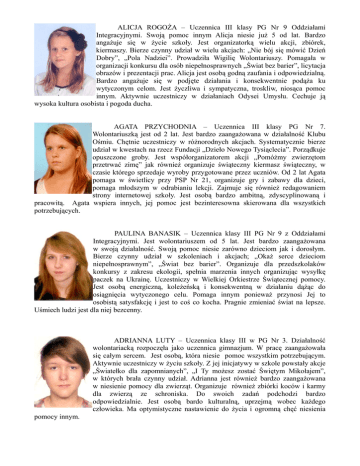 ALICJA ROGOŻA – Uczennica III klasy PG Nr 9 Oddziałami Integracyjnymi. Swoją pomoc innym Alicja niesie już 5 od lat. Bardzo angażuje się w życie szkoły. Jest organizatorką wielu akcji, zbiórek, kiermaszy. Bierze czynny udział w wielu akcjach: „Nie bój się mówić Dzień Dobry”, „Pola Nadziei”. Prowadziła Wigilię Wolontariuszy. Pomagała w organizacji konkursu dla osób niepełnosprawnych „Świat bez barier”, licytacja obrazów i prezentacji prac. Alicja jest osobą godną zaufania i odpowiedzialną. Bardzo angażuje się w podjęte działania i konsekwentnie podąża ku wytyczonym celom. Jest życzliwa i sympatyczna, troskliw, niosąca pomoc innym. Aktywnie uczestniczy w działaniach Odysei Umysłu. Cechuje ją wysoka kultura osobista i pogoda ducha. AGATA PRZYCHODNIA – Uczennica III klasy PG Nr 7. Wolontariuszką jest od 2 lat. Jest bardzo zaangażowana w działalność Klubu Ośmiu. Chętnie uczestniczy w różnorodnych akcjach. Systematycznie bierze udział w kwestach na rzecz Fundacji „Dzieło Nowego Tysiąclecia”. Porządkuje opuszczone groby. Jest współorganizatorem akcji „Pomóżmy zwierzętom przetrwać zimę” jak również organizuje świąteczny kiermasz świąteczny, w czasie którego sprzedaje wyroby przygotowane przez uczniów. Od 2 lat Agata pomaga w świetlicy przy PSP Nr 21, organizuje gry i zabawy dla dzieci, pomaga młodszym w odrabianiu lekcji. Zajmuje się również redagowaniem strony internetowej szkoły. Jest osobą bardzo ambitną, zdyscyplinowaną i pracowitą. Agata wspiera innych, jej pomoc jest bezinteresowna skierowana dla wszystkich potrzebujących. PAULINA BANASIK – Uczennica klasy III PG Nr 9 z Oddziałami Integracyjnymi. Jest wolontariuszem od 5 lat. Jest bardzo zaangażowana w swoją działalność. Swoją pomoc niesie zarówno dzieciom jak i dorosłym. Bierze czynny udział w szkoleniach i akcjach; „Okaż serce dzieciom niepełnosprawnym”, „Świat bez barier”. Organizuje dla przedszkolaków konkursy z zakresu ekologii, spełnia marzenia innych organizując wysyłkę paczek na Ukrainę. Uczestniczy w Wielkiej Orkiestrze Świątecznej pomocy. Jest osobą energiczną, koleżeńską i konsekwentną w działaniu dążąc do osiągnięcia wytyczonego celu. Pomaga innym ponieważ przynosi Jej to osobistą satysfakcję i jest to coś co kocha. Pragnie zmieniać świat na lepsze. Uśmiech ludzi jest dla niej bezcenny. ADRIANNA LUTY – Uczennica klasy III w PG Nr 3. Działalność wolontariacką rozpoczęła jako uczennica gimnazjum. W pracę zaangażowała się całym sercem. Jest osobą, która niesie pomoc wszystkim potrzebującym. Aktywnie uczestniczy w życiu szkoły. Z jej inicjatywy w szkole powstały akcje „Światełko dla zapomnianych”, „I Ty możesz zostać Świętym Mikołajem”, w których brała czynny udział. Adrianna jest również bardzo zaangażowana w niesienie pomocy dla zwierząt. Organizuje również zbiórki koców i karmy dla zwierzą ze schroniska. Do swoich zadań podchodzi bardzo odpowiedzialnie. Jest osobą bardo kulturalną, uprzejmą wobec każdego człowieka. Ma optymistyczne nastawienie do życia i ogromną chęć niesienia pomocy innym. MARTA ZARZECZNA – Uczennica klasy II w III LO. Swoją przygodę z wolontariatem rozpoczęła w 2006 roku i trwa ona do dziś. Jest osobą skromną ale pełną radości z życia. Swoją pomoc kieruje głównie do dzieci. Pomaga im w odrabianiu lekcji, opiekuje się nimi, jeździ z nimi na wizyty lekarskie, po prostu dba o dzieci, które obdarza swoją opieką. Chętnie angażuje się w pomoc w przedszkolu „Sobięcinek”, cyklicznie odwiedza Dom Małego Dziecka w Wałbrzychu. Jest wolontariuszką Stowarzyszenia Pomocy Dzieciom „Smyki”. Aktywnie udziela się również w Gminnej Bibliotece Publicznej w Starych Bogaczowicach. Dostarcza książki do domów osób starszych i chorych. Marta jest osobą bardzo aktywną i z dużym entuzjazmem niesie pomoc innym. Praca w wolontariacie to jej świadomy wybór, którego nigdy nie żałowała. Jest to jej pasja, sposób na życie. RADOSŁAW TALARCZYK – Uczeń klasy III PG Nr 9 z Oddziałami Integracyjnymi. Jest wolontariuszem od 3 lat. Jest typem chłopca, który ponad mówienie przedkłada działanie. Radek jest skromny, zrównoważony i dobrze zorganizowany. Bierze aktywny udział we wszelkich działaniach, które mają na celu niesienie pomocy innym. Uczestniczy w zbiórkach pieniędzy – kwesta na rzecz Fundacji „Okaż Serce Dzieciom i Osobom Niepełnosprawnym”, „Wielka Orkiestra Świątecznej Pomocy”. Brał udział w wyjeździe do Francji w celu wymiany doświadczeń między wolontariuszami oraz był na wymianie polskoczeskiej wolontariuszy. Przystąpił do wolontariatu, ponieważ z pomocy innym czerpie radość i satysfakcję. Poza wolontariatem jest jeszcze ministrantem w Parafii Podwyższenia Krzyża oraz pomocnym młodym człowiekiem. ANNA CZERWIŃSKA - Uczennica Zespołu Szkół TechnicznoBudowlanych. Jest osobą odpowiedzialną, zdyscyplinowaną o wysokiej kulturze osobistej. Mocno angażuje się w działania woluntarystyczne mając na celu niesienie pomocy innym. Ania nigdy nie odmawia pomocy, jest bardzo zaangażowana w to co robi. Uczestniczy w wielu akcjach zarówno jako organizator jak i uczestnik. Brała udział w „Kiermaszu Różności” z którego zebrane sumy przeznaczono dla wałbrzyskiego hospicjum. Uczestniczyła w akcji „Syta zima”- obiady dla najuboższych dzieci. Uczestniczy w spotkaniach z ludźmi starszymi i niepełnosprawnymi w Domu Pomocy Społecznej w Szczawnie Zdroju. Opiekuje się panią, która potrzebuje wsparcia w codziennym życiu. Ania odwiedza również Dom Małego Dziecka, w którym pomaga w opiece nad dziećmi. Jest osobą bardzo wrażliwą na ludzką krzywdę i chorobę, z ogromną chęcią i uśmiechem na twarzy pomaga innym. Została wyróżniona w Konkursie Dolnośląski Wolontariusz Roku 2012. KAMILA ROLLA – Uczennica III klasy PG