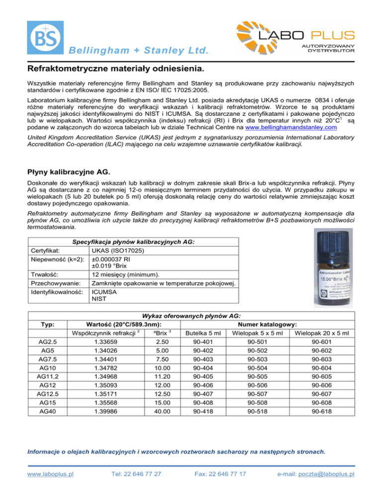 Bellingham + Stanley Ltd. Refraktometryczne materiały odniesienia. Wszystkie materiały referencyjne firmy Bellingham and Stanley są produkowane przy zachowaniu najwyższych standardów i certyfikowane zgodnie z EN ISO/ IEC 17025:2005. Laboratorium kalibracyjne firmy Bellingham and Stanley Ltd. posiada akredytację UKAS o numerze 0834 i oferuje różne materiały referencyjne do weryfikacji wskazań i kalibracji refraktometrów. Wzorce te są produktami najwyższej jakości identyfikowalnymi do NIST i ICUMSA. Są dostarczane z certyfikatami i pakowane pojedynczo 1 lub w wielopakach. Wartości współczynnika (indeksu) refrakcji (RI) i Brix dla temperatur innych niż 20°C są podane w załączonych do wzorca tabelach lub w dziale Technical Centre na www.bellinghamandstanley.com United Kingdom Accreditation Service (UKAS) jest jednym z sygnatariuszy porozumienia International Laboratory Accreditation Co-operation (ILAC) mającego na celu wzajemne uznawanie certyfikatów kalibracji. Płyny kalibracyjne AG. Doskonałe do weryfikacji wskazań lub kalibracji w dolnym zakresie skali Brix-a lub współczynnika refrakcji. Płyny AG są dostarczane z co najmniej 12-o miesięcznym terminem przydatności do użycia. W przypadku zakupu w wielopakach (5 lub 20 butelek po 5 ml) oferują doskonałą relację ceny do wartości relatywnie zmniejszając koszt dostawy pojedynczego opakowania. Refraktometry automatyczne firmy Bellingham and Stanley są wyposażone w automatyczną kompensacje dla płynów AG, co umożliwia ich użycie także do precyzyjnej kalibracji refraktometrów B+S pozbawionych możliwości termostatowania. Specyfikacja płynów kalibracyjnych AG: Certyfikat: UKAS (ISO17025) Niepewność (k=2): ±0.000037 RI ±0.019 °Brix Trwałość: 12 miesięcy (minimum). Przechowywanie: Zamknięte opakowanie w temperaturze pokojowej. Identyfikowalność: ICUMSA NIST Typ: AG2.5 AG5 AG7.5 AG10 AG11.2 AG12 AG12.5 AG15 AG40 Wykaz oferowanych płynów AG: Wartość (20°C/589.3nm): Numer katalogowy: 2 3 Współczynnik refrakcji ºBrix Butelka 5 ml Wielopak 5 x 5 ml Wielopak 20 x 5 ml 1.33659 2.50 90-401 90-501 90-601 1.34026 5.00 90-402 90-502 90-602 1.34401 7.50 90-403 90-503 90-603 1.34782 10.00 90-404 90-504 90-604 1.34968 11.20 90-405 90-505 90-605 1.35093 12.00 90-406 90-506 90-606 1.35171 12.50 90-407 90-507 90-607 1.35568 15.00 90-408 90-508 90-608 1.39986 40.00 90-418 90-518 90-618 Informacje o olejach kalibracyjnych i wzorcowych roztworach sacharozy na następnych stronach. www.laboplus.pl Tel: 22 646 77 27 Fax: 22 646 77 17 e-mail: [email protected] Bellingham + Stanley Ltd. Oleje kalibracyjne. Przeznaczone przede wszystkim do sprawdzania refraktometrów używanych w szerokim zakresie współczynnika refrakcji i do specyficznych zastosowań takich, jak np. pomiary olei spożywczych. Cechują się silną zależnością wartości wzorca od temperatury. W celu uzyskania wysokiej precyzji wymagają termostatowania urządzenia w 1 trakcie weryfikacji / kalibracji lub alternatywnie skorzystania z tabel albo kalkulatora RI/°C . Specyfikacja olejów kalibracyjnych: Certyfikat: UKAS (ISO17025) Niepewność (k=2): ±0.000074RI ±0.030 °Brix (BSDD) (±0.000103RI) Trwałość: 12 miesięcy (minimum). Przechowywanie: Zamknięte opakowanie w temperaturze pokojowej. Identyfikowalność: ICUMSA NIST Typ: BSLP BSDC BSDD Wykaz oferowanych olejów kalibracyjnych: Wartość (20°C/589.3nm): Numer katalogowy: Współczynnik refrakcji 1.46990 1.52256 1.56138 2/4 3/4 ºBrix 71.81 91.75 --.-- Wielopak 5 x 5 ml 90-525 90-530 90-535 Wzorcowe roztwory sacharozy (wzorce „cukrowe”). Roztwory sacharozy są medium szczególnie wygodnym i łatwym w użyciu w przypadku refraktometrów mierzących w skali Brix-a i wyposażonych w automatyczną kompensacje temperatury. Są zwykle dostarczane w 15 mililitrowych butelkach z zakraplaczem, do których dołączony jest certyfikat kalibracji. Na życzenie dostępne są także większe opakowania przeznaczone m.in. użytkowników gęstościomierzy mierzących w skali Brix-a. Certyfikat kalibracji podaje % wagowy zawartości sacharozy, °Brix oraz współczynnika refrakcji, jak również informacje o niepewności i identyfikowalności. Specyfikacja wzorcowych roztworów sacharozy: Certyfikat: Producent. Niepewność (k=2): ±0.011 °Brix Trwałość: 6 tygodni Przechowywanie: Zamknięte opakowanie w lodówce (ok. 5°C). Nie zamrażać. Identyfikowalność: ICUMSA NIST Kontrakty na regularne dostawy roztworów sacharozy. Jako, że dla roztworów sacharozy termin przydatności do użycia wynosi jedynie 6 tygodni od daty produkcji to muszą być one kupowane na bieżąco. W warunkach wymagających częstej kalibracji powoduje to wysokie koszty administracyjne związane z obsługą powtarzających się zamówień. Dla takich klientów B+S oferuje możliwość zminimalizowania kosztów dodatkowych poprzez „roczne” kontrakty na dostawy wzorców z określoną częstotliwością. Dalszy ciąg informacji o wzorcowych roztworach sacharozy na następnej stronie. www.laboplus.pl Tel: 22 646 77 27 Fax: 22 646 77 17 e-mail: [email protected] Bellingham + Stanley Ltd. Wykaz oferowanych wzorcowych roztworów sacharozy: Wartość (20°C/589.3nm): Numer katalogowy: °Brix 0 5 7.5 10 11.2 11.5 12 12.5 15 20 25 30 35 40 45 50 55 60 Współczynnik refrakcji 1.33299 1.34026 1.34401 1.34782 1.34968 1.35015 1.35093 1.35171 1.35568 1.36384 1.37233 1.38115 1.39032 1.39986 1.40978 1.42009 1.43080 1.44193 Butelka 15 ml SS00 SS05 SS075 SS10 SS112 SS115 SS12 SS125 SS15 SS20 SS25 SS30 SS35 SS40 SS45 SS50 SS55 SS60 Odpowiedniki RI dla wodnych roztworów mocznika. Refraktometry wykorzystywanych do pomiaru dodatków AdBlue (DEF) do paliwa wymagają specyficznych materiałów kalibracyjnych. Muszą one zapewniać ekstremalnie wysoką dokładność tak, aby spełnić wymogi normy ISO 22241, a jednocześnie oferować wydłużoną trwałość konieczną do pomiarów „polowych”. Firma Bellingham and Stanley 