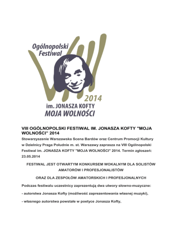 VIII OGÓLNOPOLSKI FESTIWAL IM. JONASZA KOFTY "MOJA WOLNOŚCI” 2014 Stowarzyszenie Warszawska Scena Bardów oraz Centrum Promocji Kultury w Dzielnicy Praga Południe m. st. Warszawy zaprasza na VIII Ogólnopolski Festiwal im. JONASZA KOFTY "MOJA WOLNOŚCI" 2014. Termin zgłoszeń: 23.05.2014 FESTIWAL JEST OTWARTYM KONKURSEM WOKALNYM DLA SOLISTÓW AMATORÓW I PROFESJONALISTÓW ORAZ DLA ZESPOŁÓW AMATORSKICH I PROFESJONALNYCH Podczas festiwalu uczestnicy zaprezentują dwa utwory słowno-muzyczne: - autorstwa Jonasza Kofty (możliwość zaprezentowania własnej muzyki), - własnego autorstwa powstałe w poetyce Jonasza Kofty, - innych autorów piszących o tematyce szeroko pojętej wolności (wolności słowa, jednostki, narodów). Punkty mogą przenikać się. Szczegółowy regulamin na stronach www.bardowie.art.pl i www.cpk.art.pl Uczestnicy zgłaszają swój udział w festiwalu nadsyłając karty zgłoszeń (wg załączonego wzoru w regulaminie) oraz materiał dźwiękowy z zarejestrowanymi piosenkami zgłoszonymi na festiwal w formacie CD- audio do dnia 23 maja 2014r. na adres: Centrum Promocji Kultury w Dzielnicy Praga Południe m. st. Warszawy ul. Podskarbińska 2 , 03-833 Warszawa Koncert Konkursowy - 07 czerwca 2014r. o godz. 17.00 uczestników festiwalu oceniać będzie Jury w składzie: Jadwiga Kofta, Paweł Sztompke, Andrzej Zakrzewski, Jerzy Mamcarz, Krzysztof Heering, Stanisław Klawe, Jacek Bukowski i Roman Ziemlański. Koncert Finałowy - 08 czerwca 2014r. o godz. 18.00 w którym wystąpią Laureaci oraz artyści Warszawskiej Sceny Bardów w składzie: Mirosław Czyżykiewicz, Andrzej Brzeski, Krzysztof Daukszewicz, Jerzy Mamcarz, Stanisław Klawe, Wojciech Gęsicki, Monika Szymczyk /Złoty Klucz 2013/ oraz Robert Janowski. Organizatorzy: Stowarzyszenie Warszawska Scena Bardów 22 837-33-24 , 726 55 60 12 [email protected] www.bardowie.art.pl Centrum Promocji Kultury w Dzielnicy Praga Południe m. st. Warszawy 22 517-65-75 [email protected] Celem Festiwalu jest zachowanie w pamięci, młodych pokoleń, twórczości znakomitego poety piosenki jakim był Jonasz Kofta oraz prezentacja nowych autorskich utworów powstałych w poetyce Patrona Festiwalu. Finał Festiwalu ma miejsce, zawsze, w najbliższy weekend po 4 czerwca. W ubiegłym roku jury I etapu zakwalifikowało 22 wykonawców (głównie uczestników szkół wokalnych) do Koncertu Konkursowego, którzy prezentowali znakomity poziom artystyczny. Laureatami wyróżnień zostali: Agata Struzik, Tomasz Wachnowski, Inga Habiba, Iwona Manista - Kutryś, Aleksandra Wylężek, Jakub Pawlak i zespół John Kentucky Band z Kędzierzyna - Koźla. Laureatami (nagrody pieniężne oraz Klucze – do wolności artystycznej) głównych nagród zostali: Jarosław Tomaszewski z zespołem „Latający Dywan” z Podkowy Leśnej (Brązowy Klucz 2013), Justyna Kuśmierczyk z Warszawy (Srebrny Klucz 2013), Monika Szymczyk ze Stargardu Szczecińskiego (Złoty Klucz 2013). Ponadto przyznano Nagrodę ZASP, za najlepszą interpretację utworu Jonasza Kofty, którą otrzymała Agata Zakrzewska. Przyznawane są nagrody Główne (pieniężne, ufundowane przez Stowarzyszenie Autorów ZAiKS oraz Związek Artystów Wykonawców STOART): Złoty, Srebrny i Brązowy Klucz do tzw. wolności artystycznej oraz wyróżnienia, którymi są zaproszenia do udziału w Koncercie Finałowym. W Koncercie Finałowym występują Laureaci, przemiennie, z artystami Warszawskiej Sceny Bardów. W bieżącym roku wystąpią: Mirosław Czyżykiewicz, Krzysztof Daukszewicz, Jerzy Mamcarz, Stanisław Klawe, Andrzej Brzeski, Wojciech Gęsicki oraz Robert Janowski. Koncert Finałowy rozpoczyna laureat, w tym przypadku laureatka, głównej nagrodyMonika Szymczyk /Złoty Klucz 2013/.W Koncertach Finałowych ponadto wystąpili: Bogusław Mec, Zbigniew Zamachowski, Stanisław Soyka, Artur Andrus, Jerzy Filar, Tomasz Szwed, Kuba Sienkiewicz i inni. Festiwal im. Jonasza Kofty ”Moja Wolności” , zdaniem dziennikarzy muzycznych i środowisk opiniotwórczych, należy do najważniejszych festiwali piosenki artystycznej w Polsce. Nagrania z minionych edycji oraz recenzje na www.bardowie.art.pl zapraszamy na: VIII OGÓLNOPOLSKI FESTIWAL IM. JONASZA KOFTY "MOJA WOLNOŚCI" 2014