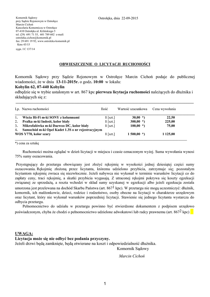 1 Komornik Sądowy przy Sądzie Rejonowym w Ostrołęce Marcin