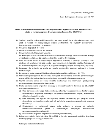 Załącznik nr 2 do decyzji nr 2 Rady ds. Programu Erasmus+ przy IBL PAN Nabór studentów studiów doktoranckich przy IBL PAN na wyjazdy do uczelni partnerskich na studia w ramach programu Erasmus w roku akademickim 2014/2015 1) Studenci studiów doktoranckich przy IBL PAN mogą starać się w roku akademickim 20142015 o wyjazd do następujących uczelni partnerskich na wydziały slawistyczne i literaturoznawcze zgodnie z umowami z: a) Universita degli Studi di Torino; b) Universität Potsdam, Institut für Slavistik; c) Universitat Zurich, filologia słowiańska. IBL PAN dysponuje w roku akademickim funduszami umożliwiającymi zrealizowanie jednego wyjazdu stypendialnego do uczelni partnerskiej na okres 4-6 miesięcy. 2) Czas ten może zostać w wyjątkowych wypadkach skrócony z przyczyn podanych przez studenta lub wydłużony na jego prośbę – pod warunkiem dostępności środków finansowych na przedłużenie pobytu (na przykład w przypadku rezygnacji innych osób z (części) wyjazdu). 3) Kandydaci do wyjazdu na studia do uczelni partnerskiej zostaną wyłonieni w trybie konkursowym. 4) Do konkursu może przystąpić każdy słuchacz studiów doktoranckich przy IBL PAN. 5) Warunkiem przystąpienia do konkursu na wyjazd do konkretnej jednostki partnerskiej jest znajomość języka kraju wyjazdu na poziomie co najmniej średniozaawansowanym 6) Wyniki konkursu zależą od oceny dorobku naukowego oraz motywacji i predyspozycji osobowościowych kandydatów do wyjazdu. 7) Osoby zainteresowane wyjazdem składają w nieprzekraczalnym terminie do 31.10.2014 następujące dokumenty: a) Opis dorobku naukowego (lista publikacji, referatów wygłoszonych na konferencjach, realizowanych projektów naukowych, otrzymanych stypendiów i nagród, prowadzonej działalności dydaktycznej); b) Opis motywacji do wyjazdu do wybranej uczelni partnerskiej (jaki program badań stypendysta zamierza tam realizować, jak wpłynie to na postęp w pracach nad rozprawą doktorską); c) Oświadczenie o znajomości języka kraju wyjazdu w stopniu co najmniej średniozaawansowanym (wraz z ewentualnymi oficjalnymi dokumentami poświadczającymi tę znajomość); d) Oświadczenie o zgodzie na przetwarzanie danych osobowych; 8) Dokumenty należy złożyć do dnia 31.10.2014 w formie papierowej osobiście lub drogą mailową (podpisane skany) pod adresem: Katarzyna Nadana-Sokołowska Koordynator programu Erasmus IBL PAN ul. Nowy Świat 72 00-330 Warszawa pokój nr 142. [email protected] 9) Zgłoszenia zostaną rozpatrzone przez Komisję Rekrutacyjną powołaną przez Komisję Erasmusa przy IBL PAN. Komisja rozpatrzy zgłoszenia zgodnie z regulaminem określającym punktację i wagę poszczególnych kategorii oceny dołączonym do protokołu egzaminacyjnego. Regulamin będzie udostępniony osobom biorącym udział w konkursie. 10) Komisja ogłosi wyniki naboru w postaci listy kandydatów do wyjazdu do poszczególnych ośrodków oraz listy rezerwowej kandydatów do wyjazdu do poszczególnych ośrodków w nieprzekraczalnym terminie do 07.11.2014. 11) Od decyzji Komisji można złożyć odwołanie w terminie do 14.11.2014. W odwołaniu należy wskazać istniejące zdaniem odwołującego się rozbieżności pomiędzy wagą jego osiągnięć a ich oceną w protokole egzaminacyjnym. 12) Odwołania zostaną rozpatrzone w terminie do 21.11.14. 13) Kandydaci do wyjazdu staną się stypendystami Erasmusa dopiero w momencie pisemnego potwierdzenia ze strony uczelni partnerskiej gotowości do przyjęcia na studia. 14) Warunkiem wyjazdu na studia jest podpisanie przez studenta porozumienia o programie zajęć, umowy z IBL PAN określającej warunki finansowe wyjazdu, a także zasady sprawdzenia i doskonalenia znajomości języka kraju wyjazdu (test wstępny online, kurs online, test końcowy) i zasady sprawozdawczości. 15) W ramach studiów w uczelni partnerskiej studentom Erasmusa zostanie zaliczony odpowiedni semestr zajęć na studiach doktoranckich w IBL PAN po spełnieniu warunków zawartych w umowie ze studentem i porozumieniu o programie zajęć. 16) W czasie studiów za granicą student IBL PAN ma prawo pobierać nadal stypendium doktoranckie w IBL PAN, jeśli mu takie przysługiwało. 17) Średnia wysokość stypendium na jeden miesiąc pobytu w ośrodku partnerskim wynosi 400 EURO. Dokładna wysokość stypendium zostanie podana do wiadomości kandydatów na wyjazd po zatwierdzeniu zasad rozdziału funduszy programu Erasmus w IBL PAN na rok 2014/2015, zgodnie z wytycznymi Programu Erasmus+. 18) Informacje o programie Erasmus i zasadach wyjazdów zainteresowani studenci mogą znaleźć na stronie: www.erasmusplus.org.pl