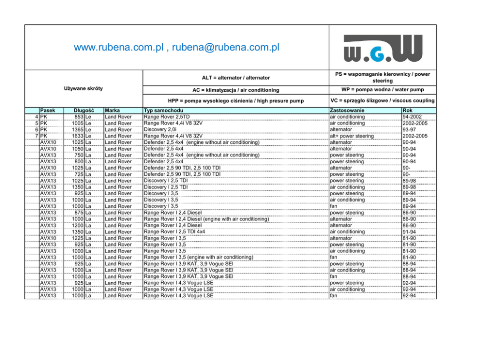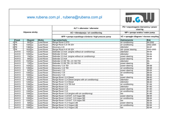 www.rubena.com.pl , [email protected] Używane skróty 4 5 6 7 Pasek PK PK PK PK AVX10 AVX10 AVX13 AVX13 AVX10 AVX13 AVX13 AVX13 AVX13 AVX13 AVX13 AVX13 AVX13 AVX13 AVX13 AVX10 AVX13 AVX13 AVX13 AVX13 AVX13 AVX13 AVX13 AVX13 AVX13 Długość 853 Le 1005 Le 1365 Le 1633 Le 1025 La 1050 La 750 La 800 La 1025 La 725 La 1025 La 1350 La 925 La 1000 La 1000 La 875 La 1000 La 1200 La 1350 La 1225 La 925 La 1000 La 1000 La 925 La 1000 La 1000 La 925 La 1000 La 1000 La Marka Land Rover Land Rover Land Rover Land Rover Land Rover Land Rover Land Rover Land Rover Land Rover Land Rover Land Rover Land Rover Land Rover Land Rover Land Rover Land Rover Land Rover Land Rover Land Rover Land Rover Land Rover Land Rover Land Rover Land Rover Land Rover Land Rover Land Rover Land Rover Land Rover ALT = alternator / alternator PS = wspomaganie kierownicy / power steering AC = klimatyzacja / air conditioning WP = pompa wodna / water pump HPP = pompa wysokiego ciśnienia / high presure pump VC = sprzęgło ślizgowe / viscous coupling Typ samochodu Range Rover 2,5TD Range Rover 4,4i V8 32V Discovery 2,0i Range Rover 4,4i V8 32V Defender 2,5 4x4 (engine without air conditioning) Defender 2,5 4x4 Defender 2,5 4x4 (engine without air conditioning) Defender 2,5 4x4 Defender 2,5 90 TDI, 2,5 100 TDI Defender 2,5 90 TDI, 2,5 100 TDI Discovery I 2,5 TDI Discovery I 2,5 TDI Discovery I 3,5 Discovery I 3,5 Discovery I 3,5 Range Rover I 2,4 Diesel Range Rover I 2,4 Diesel (engine with air conditioning) Range Rover I 2,4 Diesel Range Rover I 2,5 TDI 4x4 Range Rover I 3,5 Range Rover I 3,5 Range Rover I 3,5 Range Rover I 3,5 (engine with air conditioning) Range Rover I 3,9 KAT, 3,9 Vogue SEI Range Rover I 3,9 KAT, 3,9 Vogue SEI Range Rover I 3,9 KAT, 3,9 Vogue SEI Range Rover I 4,3 Vogue LSE Range Rover I 4,3 Vogue LSE Range Rover I 4,3 Vogue LSE Zastosowanie air conditioning air conditioning alternator alt+ power steering alternator alternator power steering power steering alternator power steering power steering air conditioning power steering air conditioning fan power steering alternator alternator air conditioning alternator power steering air conditioning fan power steering air conditioning fan power steering air conditioning fan Rok 94-2002 2002-2005 93-97 2002-2005 90-94 90-94 90-94 90-94 909089-98 89-98 89-94 89-94 89-94 86-90 86-90 86-90 91-94 81-90 81-90 81-90 81-90 88-94 88-94 88-94 92-94 92-94 92-94