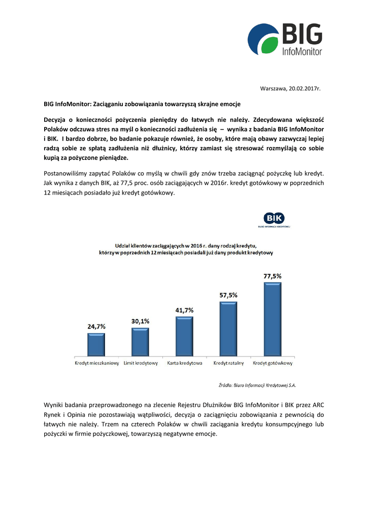 Warszawa, 20.02.2017r. BIG InfoMonitor: Zaciąganiu zobowiązania towarzyszą skrajne emocje Decyzja o konieczności pożyczenia pieniędzy do łatwych nie należy. Zdecydowana większość Polaków odczuwa stres na myśl o konieczności zadłużenia się – wynika z badania BIG InfoMonitor i BIK. I bardzo dobrze, bo badanie pokazuje również, że osoby, które mają obawy zazwyczaj lepiej radzą sobie ze spłatą zadłużenia niż dłużnicy, którzy zamiast się stresować rozmyślają co sobie kupią za pożyczone pieniądze. Postanowiliśmy zapytać Polaków co myślą w chwili gdy znów trzeba zaciągnąć pożyczkę lub kredyt. Jak wynika z danych BIK, aż 77,5 proc. osób zaciągających w 2016r. kredyt gotówkowy w poprzednich 12 miesiącach posiadało już kredyt gotówkowy. Wyniki badania przeprowadzonego na zlecenie Rejestru Dłużników BIG InfoMonitor i BIK przez ARC Rynek i Opinia nie pozostawiają wątpliwości, decyzja o zaciągnięciu zobowiązania z pewnością do łatwych nie należy. Trzem na czterech Polaków w chwili zaciągania kredytu konsumpcyjnego lub pożyczki w firmie pożyczkowej, towarzyszą negatywne emocje. Obawy cztery razy większe niż radość 60 proc. przy tej okazji odczuwa wyłącznie stres i obawy, a kolejne 14 proc. badanych ma mieszane odczucia, z jednej strony martwią się zobowiązaniem, z drugiej cieszą możliwością zrealizowania swoich planów czy zamierzeń. Wyłącznie pozytywne odczucia ma jedynie 17 proc. respondentów, czyli co szósty ankietowany. Co dziesiątej ankietowanej osobie trudno jest określić emocje. W badaniu wzięły udział wyłącznie osoby, które są w trakcie spłaty pożyczki zaciągniętej w firmie pożyczkowej lub kredytu konsumpcyjnego w banku. Stracę pracę Biorący kredyty i pożyczki martwią się najbardziej o to, że będą musieli spłacić pożyczone pieniądze (42 proc.), zastanawiają się również jak wpasować ratę w domowy budżet (39 proc.) oraz jak sobie poradzić w momencie utraty pracy (38 proc.). Dopiero na kolejnych pozycjach znalazło się poczucie ulgi związane z przypływem gotówki (28 proc.) oraz refleksja nad planowanymi zakupami za pożyczone pieniądze. 2 Kto rokuje lepszą spłatę zobowiązania? Badanie potwierdza, znacznie większe szanse na zwrot pieniędzy dają pesymiści zamartwiający się czy uda im się podołać spłacie niż pełni wiary w siebie optymiści, którzy od razu oddają się rozmyślaniom o wydawaniu gotówki często na niepotrzebne przyjemności. Radośnie podchodzący do kredytów i pożyczek wyróżniają się w opóźnieniami w spłacie. Niemal połowie z nich zdarzyło się opóźniać ratę co najmniej kilka razy lub wielokrotnie. Dystansują tym samym pozostałych pożyczko i kredytobiorców. 3 W grupie zastanawiających się jak dodać ratę do domowego budżetu, problemy ze spłatą ma co trzecia osoba. – Co może świadczyć, że dla znaczącej grupy zadłużających się na konsumpcję obsługa zadłużenia jest wyzwaniem, z którym często już na wstępie jest problem – zwraca uwagę Mariusz Hildebrand. Niewiele mniejszy odsetek ma kłopoty w grupie osób, którym w trakcie pożyczania towarzyszy poczucie ulgi, ponieważ będą mogli zaspokoić potrzeby i rozwiązać problemy wynikające z braku pieniędzy. Najrzadziej problemy ze spłatą towarzyszą stresującym się zadłużaniem – pod czym kryje się najwyraźniej rozpatrywanie różnych niekorzystnych scenariuszy na wypadek utraty zdolności do terminowej spłaty zaciągniętych zobowiązań. Lepiej niż reszcie spłata zadłużenia idzie też osobom znacząco wybiegającym w przyszłość, nie tylko martwiącym się jak dołożyć ratę do bieżących wydatków, ale co zrobić w momencie utraty pracy czy też innych wypadków losowych. – Może akurat w tym przypadku warto brać przykład z pesymistów – pointuje Mariusz Hildebrand. 4 W Rejestrze Dłużników BIG InfoMonitor jest 450 tys. osób, które mają problem z obsługą pożyczek. Ich zaległości sięgają 1,5 mld zł. W Biurze Informacji Kredytowej liczba osób, które z co najmniej 60 dniowym opóźnieniem obsługują raty kredytów konsumpcyjnych wynosi 783 tys. Mają oni do spłaty w bankach 18,8 mld zł. Biuro Informacji Gospodarczej InfoMonitor (BIG InfoMonitor) prowadzi Rejestr Dłużników BIG. Działając w oparciu o Ustawę o udostępnianiu informacji gospodarczych i wymianie danych gospodarczych przyjmuje, przechowuje i udostępnia informacje gospodarcze o przeterminowanym zadłużeniu osób i firm. BIG InfoMonitor umożliwia dostęp do baz: Biura Informacji Kredytowej i Związku Banków Polskich, dzięki czemu stanowi platformę wymiany informacji pomiędzy sektorem bankowym i pozostałymi sektorami gospodarki. Oferuje również sektorowi bankowemu i przedsiębiorcom narzędzia do weryfikowania wiarygodności płatniczej klientów i kontrahentów oraz wspiera ich w odzyskiwaniu zaległych należności. BIG InfoMonitor jest spółką zależną sektora bankowego - poprzez Biuro Informacji Kredytowej – swojego głównego akcjonariusza. Kontakt dla prasy: Halina Kochalska Rzecznik Prasowy tel.: +48 22 486 56 16 kom.: + 48 602 601 010 [email protected] Diana Borowiecka Biuro PR i Komunikacji tel.: +48 22 486 56 46 kom.: + 48 607 146 583 [email protected] 5