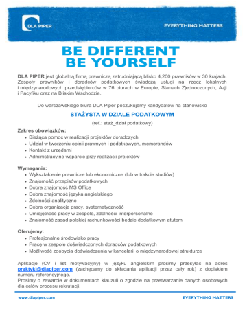 DLA PIPER jest globalną firmą prawniczą zatrudniającą blisko 4,200 prawników w 30 krajach. Zespoły prawników i doradców podatkowych świadczą usługi na rzecz lokalnych i międzynarodowych przedsiębiorców w 76 biurach w Europie, Stanach Zjednoczonych, Azji i Pacyfiku oraz na Bliskim Wschodzie. Do warszawskiego biura DLA Piper poszukujemy kandydatów na stanowisko STAśYSTA W DZIALE PODATKOWYM (ref.: staŜ_dział podatkowy) Zakres obowiązków: • BieŜąca pomoc w realizacji projektów doradczych • Udział w tworzeniu opinii prawnych i podatkowych, memorandów • Kontakt z urzędami • Administracyjne wsparcie przy realizacji projektów Wymagania: • Wykształcenie prawnicze lub ekonomiczne (lub w trakcie studiów) • Znajomość przepisów podatkowych • Dobra znajomość MS Office • Dobra znajomość języka angielskiego • Zdolności analityczne • Dobra organizacja pracy, systematyczność • Umiejętność pracy w zespole, zdolności interpersonalne • Znajomość zasad polskiej rachunkowości będzie dodatkowym atutem Oferujemy: • Profesjonalne środowisko pracy • Pracę w zespole doświadczonych doradców podatkowych • MoŜliwość zdobycia doświadczenia w kancelarii o międzynarodowej strukturze Aplikacje (CV i list motywacyjny) w języku angielskim prosimy przesyłać na adres [email protected] (zachęcamy do składania aplikacji przez cały rok) z dopiskiem numeru referencyjnego. Prosimy o zawarcie w dokumentach klauzuli o zgodzie na przetwarzanie danych osobowych dla celów procesu rekrutacji. www.dlapiper.com EVERYTHING MATTERS