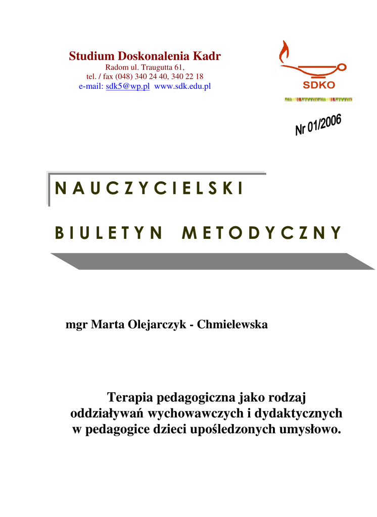 Studium Doskonalenia Kadr Radom ul. Traugutta 61, tel. / fax (048) 340 24 40, 340 22 18 e-mail: [email protected] www.sdk.edu.pl NAUCZYCIELSKI BIULETYN METODYCZNY mgr Marta Olejarczyk - Chmielewska Terapia pedagogiczna jako rodzaj oddziaływań wychowawczych i dydaktycznych w pedagogice dzieci upośledzonych umysłowo. W pedagogice specjalnej terapia pedagogiczna bywa traktowana jako jedna z form walki z upośledzeniem. Polega ona na wykorzystywaniu specjalnych metod i organizacji postępowania pedagogicznego, a także specjalnie stworzonych warunków do przygotowania dzieci i młodzieży upośledzonej umysłowo do użytecznej pracy i życia w społeczeństwie. Jednym z rodzajów w pedagogice specjalnej jest terapia pedagogiczna czyli oddziaływanie za pomocą środków pedagogicznych (wychowawczych i dydaktycznych) na osobę niepełnosprawną umysłowo. Terapia pedagogiczna stanowi interwencję wychowawczą, mającą na celu spowodowanie pozytywnych zmian w zakresie sfery poznawczej i emocjonalno - motywacyjnej. Terapia pedagogiczna bliska jest pojęciu – rewalidacja, która odnosi się do kształcenia i wychowywania dzieci i młodzieży z odchyleniami od normy. W ramach rewalidacji stosuje się obok innych form oddziaływania właśnie terapię pedagogiczną. Zdaniem Kirejczyka ,, …terapia pedagogiczna, specjalne wychowanie i nauczanie upośledzonych, zajmuje się tym jednostkami, u których mimo różnorodnych form zapobiegania wystąpiło upośledzenie i których nie udało się w drodze leczenia przywrócić do grona ludzi normalnych” (Kirejczyk 1977). Podmiotem terapii pedagogicznej jest nauczyciel terapeuta, wyposażony w wiedzę, umiejętności i predyspozycje potrzebne w tego rodzaju pracy, a także osoba upośledzona umysłowo ponieważ jej aktywność i zaangażowanie w przezwyciężenia trudności rozwojowych jest niezbędnym warunkiem efektywności podejmowanych działań. Terapia pedagogiczna w pedagogice specjalnej, a dokładniej oligofrenopedagogice jest jednym z działów pedagogiki specjalnej zajmującym się nauczaniem i wychowaniem jednostek upośledzonych umysłowo. Upośledzenie umysłowe zwane także niedorozwojem umysłowym lub oligofrenią jest pojęciem bardzo szerokim i różnie definiowanym. Ogólnie przyjmuje się, że jest to stan obniżonej sprawności umysłowej w stosunku do stanu normalnego, charakteryzujący się niedorozwojem lub zaburzeniami procesów percepcyjnych, uwagi, pamięci i myślenia w wyniku procesów patologicznych. (J. Sowa 1998). Niektóre definicje upośledzenia umysłowego dołączają do tego także zaburzenia w przystosowaniu społecznym. J. Kostrzewski określa upośledzenie umysłowe jako ,,istotnie niższy od przeciętnego ogólny poziom funkcjonowania intelektualnego, występujący łącznie z upośledzeniem w zakresie przystosowania się, wiążący się ze zmianami w ośrodkowym układzie nerwowym” (Kostrzewski 1978). Przy czym istotnie niższy poziom od przeciętnego oznacza niższy o dwa odchylenia standardowe. Podsumowując jest to jednostka, która bez pomocy specjalnej nie może osiągnąć celów kształcenia i należytego stopnia samodzielności społecznej w konsekwencji oddziaływań, metod i środków stosowanych w odniesieniu do jednostek normalnych. (J. Sowa 1998). Upośledzenie umysłowe spowodowane jest pewnymi ograniczeniami i funkcjonalnymi zmianami w mózgu, zwłaszcza w korze mózgowej. Ogólnie przyczyny jego dzielimy na pierwotne (do których należą przyczyny genetyczne) i wtórne (należą czynniki, które mają wpływ na korę mózgową przed narodzeniem dziecka, w czasie urodzenia dziecka i po urodzeniu dziecka). Upośledzeni umysłowe ma totalny charakter (dotyczy całej jednostki), jest zaburzeniem trwającym przez całe życie, ma postać bardzo złożoną, jest kategorią dynamiczną (rozwój 2 jednostki może ulec pozytywnym zmianom, zwłaszcza pod wpływem odpowiednich działań stymulujących rozwój). W obrębie tej problematyki istnieje wiele terminów bliskoznacznych, takich jak: niedorozwój umysłowy, obniżona sprawność umysłowa, oligofrenia, zwolnione tempo rozwoju, otępienie, trudności w uczeniu się, niepełnosprawni, sprawni inaczej lub dziecko o obniżonej sprawności edukacyjnej. Nie wszystkie te terminy mogą być używane zamiennie. Zgodnie z decyzją Komitetu Ekspertów Światowej Organizacji Zdrowia z 1967 r., zamiennie można używać następujących określeń: upośledzenie umysłowe, niedorozwój umysłowy (oligofrenia) oraz niższa (obniżona) sprawność umysłowa (Borzyszkowa 1985, za; Kott 1999). Upośledzenie lub niedorozwój umysłowy może mieć różne stopnie. W 1968 r. Światowa Organizacja Zdrowia przyjęła czterostopniową klasyfikację upośledzenia umysłowego opartą na ilorazie inteligencji (I.I). Jej podstawę stanowi skala o średniej 100 i odchyleniu standardowym 16. Stopnie te są następujące: • Lekki niedorozwój umysłowy i ilorazie inteligencji od 52 – 67; • Umiarkowany niedorozwój umysłowy o ilorazie inteligencji 0d 36 – 51; • Znaczny niedorozwój umysłowy o ilorazie inteligencji od 20 – 35; • Głęboki niedorozwój umysłowy o ilorazie inteligencji od 0-19; (Sękowska 1982, za: Sowa 1998) U dzieci upośledzonych umysłowo znacznie częściej występują różne wady wzroku i słuchu, upośledzenie narządu ruchu, zaburzenia mowy oraz niektóre choroby, np. padaczka. Charakterystyka dziecka upośledzonego w stopniu lekkim jest bardzo trudna gdyż defekty intelektualne nie są tak widoczne jak u upośledzonych w stopniu umiarkowanym i znacznym. Niemniej mimo tych trudności można ustalić pewne cechy typowe dla upośledzenia umysłowego w stopniu lekkim. Odnosi się ona zarówno do indywidualnego przypadku, jak taż do często dokonywanej oceny ogólnej (dotyczącej typowych cech związanych z upośledzeniem umysłowym). Osoby niepełnosprawne umysłowo w stopniu lekkim osiągają poziom rozwoju intelektualny 12 letniego
