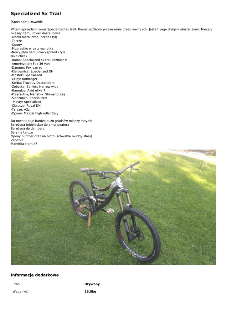 Specialized Sx Trail [Sprzedam] Downhill Witam sprzedam rower Specialized sx trail. Rower jeżdżony przeze mnie przez równy rok. Jestem jego drugim właścicielem. Niecały miesiąc temu rower dostał nowe: -Klocki metaliczne (przód i tył) -Tarcze -Opony -Przerzutke wraz z manetką -Nowy płyn hamulcowy (przód i tył) Bike check -Rama: Specialized sx trail rozmiar M -Amortyzator: Fox 36 van -Damper: Fox van rc -Kierownica: Specialized DH -Mostek: Specialized -Gripy: Bontrager -Korba: Truvativ Descendant -Zębatka: Banless Narrow wide -Hamulce: Avid elixir 7 -Przerzutka, Manetka: Shimano Zee -Siedzonko: Specialized - Piasty: Specialized -Obręcze: Roval DH -Tarcze: A2z -Opony: Maxxis high roller 2ply Do roweru daje bardzo dużo gratisów między innymi: Sprężyna (niebieska) do amortyzatora Sprężyna do dampera Seryjne tarcze Opony butcher oraz na błoto (schwable muddy Mary) Zębatka Manetka sram x7 Informacje dodatkowe Stan Używany Waga (kg) 15.5kg Adres ogłoszenia http://rowerowybazar.com.pl/specialized-sx-trail-,o4277 Kontakt Mail: [email protected] Telefon: 533909350 Lokalizacja , Bochnia Małopolskie (Polska) Ogłoszenie dodano: 2016-08-22 11:27:58 Ogłoszenie wygasa: 2017-05-20 11:27:58 Powered by TCPDF (www.tcpdf.org)