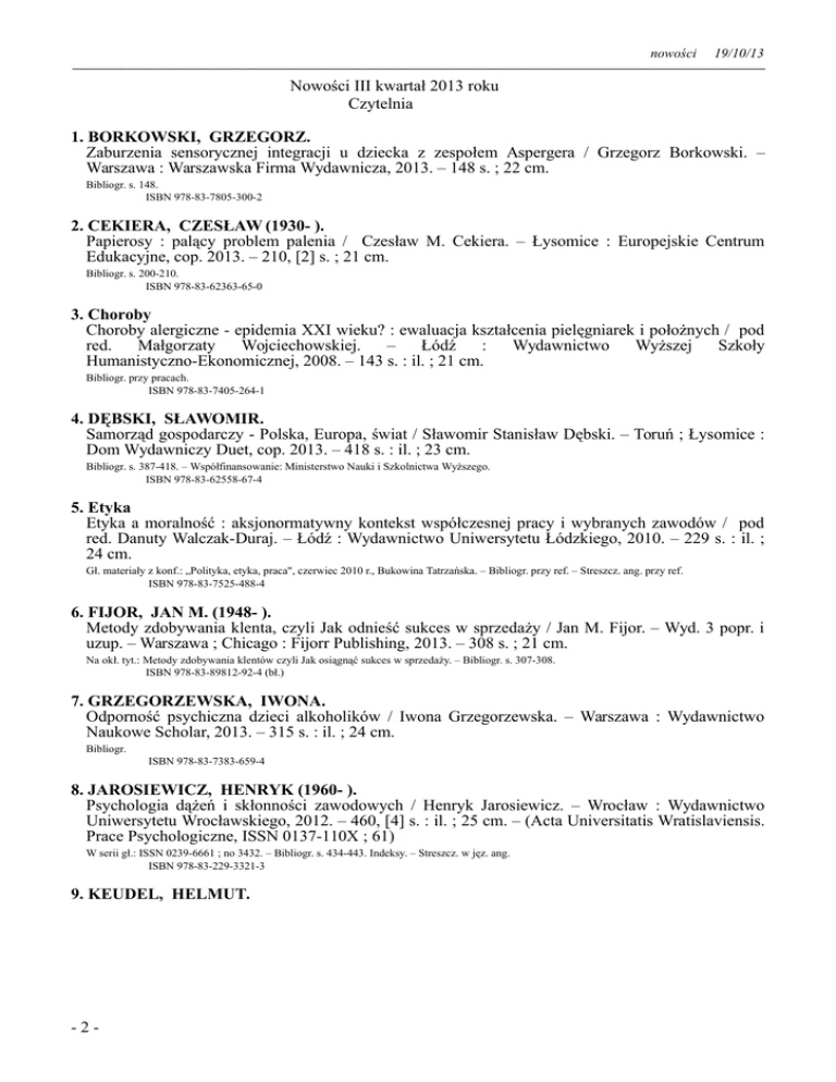 nowości 19/10/13 ‗‗‗‗‗‗‗‗‗‗‗‗‗‗‗‗‗‗‗‗‗‗‗‗‗‗‗‗‗‗‗‗‗‗‗‗‗‗‗‗‗‗‗‗‗‗‗‗‗‗‗‗‗‗‗‗‗‗‗‗‗‗‗‗‗‗‗‗‗‗‗‗‗‗‗‗‗‗‗‗‗‗‗‗‗‗‗‗‗‗‗‗‗‗‗‗‗‗‗‗‗‗‗‗‗‗‗‗‗‗‗‗‗‗‗‗‗‗‗‗‗‗‗‗‗‗‗‗‗‗‗‗‗‗‗‗‗‗‗‗‗ Nowości III kwartał 2013 roku Czytelnia 1. BORKOWSKI, GRZEGORZ. Zaburzenia sensorycznej integracji u dziecka z zespołem Aspergera / Grzegorz Borkowski. – Warszawa : Warszawska Firma Wydawnicza, 2013. – 148 s. ; 22 cm. Bibliogr. s. 148. ISBN 978-83-7805-300-2 2. CEKIERA, CZESŁAW (1930- ). Papierosy : palący problem palenia / Czesław M. Cekiera. – Łysomice : Europejskie Centrum Edukacyjne, cop. 2013. – 210, [2] s. ; 21 cm. Bibliogr. s. 200-210. ISBN 978-83-62363-65-0 3. Choroby Choroby alergiczne - epidemia XXI wieku? : ewaluacja kształcenia pielęgniarek i położnych / pod red. Małgorzaty Wojciechowskiej. – Łódź : Wydawnictwo Wyższej Szkoły Humanistyczno-Ekonomicznej, 2008. – 143 s. : il. ; 21 cm. Bibliogr. przy pracach. ISBN 978-83-7405-264-1 4. DĘBSKI, SŁAWOMIR. Samorząd gospodarczy - Polska, Europa, świat / Sławomir Stanisław Dębski. – Toruń ; Łysomice : Dom Wydawniczy Duet, cop. 2013. – 418 s. : il. ; 23 cm. Bibliogr. s. 387-418. – Współfinansowanie: Ministerstwo Nauki i Szkolnictwa Wyższego. ISBN 978-83-62558-67-4 5. Etyka Etyka a moralność : aksjonormatywny kontekst współczesnej pracy i wybranych zawodów / pod red. Danuty Walczak-Duraj. – Łódź : Wydawnictwo Uniwersytetu Łódzkiego, 2010. – 229 s. : il. ; 24 cm. Gł. materiały z konf.: „Polityka, etyka, praca", czerwiec 2010 r., Bukowina Tatrzańska. – Bibliogr. przy ref. – Streszcz. ang. przy ref. ISBN 978-83-7525-488-4 6. FIJOR, JAN M. (1948- ). Metody zdobywania klenta, czyli Jak odnieść sukces w sprzedaży / Jan M. Fijor. – Wyd. 3 popr. i uzup. – Warszawa ; Chicago : Fijorr Publishing, 2013. – 308 s. ; 21 cm. Na okł. tyt.: Metody zdobywania klentów czyli Jak osiągnąć sukces w sprzedaży. – Bibliogr. s. 307-308. ISBN 978-83-89812-92-4 (bł.) 7. GRZEGORZEWSKA, IWONA. Odporność psychiczna dzieci alkoholików / Iwona Grzegorzewska. – Warszawa : Wydawnictwo Naukowe Scholar, 2013. – 315 s. : il. ; 24 cm. Bibliogr. ISBN 978-83-7383-659-4 8. JAROSIEWICZ, HENRYK (1960- ). Psychologia dążeń i skłonności zawodowych / Henryk Jarosiewicz. – Wrocław : Wydawnictwo Uniwersytetu Wrocławskiego, 2012. – 460, [4] s. : il. ; 25 cm. – (Acta Universitatis Wratislaviensis. Prace Psychologiczne, ISSN 0137-110X ; 61) W serii gł.: ISSN 0239-6661 ; no 3432. – Bibliogr. s. 434-443. Indeksy. – Streszcz. w jęz. ang. ISBN 978-83-229-3321-3 9. KEUDEL, HELMUT. -2- nowości ‗‗‗‗‗‗‗‗‗‗‗‗‗‗‗‗‗‗‗‗‗‗‗‗‗‗‗‗‗‗‗‗‗‗‗‗‗‗‗‗‗‗‗‗‗‗‗‗‗‗‗‗‗‗‗‗‗‗‗‗‗‗‗‗‗‗‗‗‗‗‗‗‗‗‗‗‗‗‗‗‗‗‗‗‗‗‗‗‗‗‗‗‗‗‗‗‗‗‗‗‗‗‗‗‗‗‗‗‗‗‗‗‗‗‗‗‗‗‗‗‗‗‗‗‗‗ ‗‗‗‗‗‗‗‗‗‗‗‗‗‗‗nowości 19/10/13 19/10/13 ‗‗‗‗‗‗‗‗‗‗‗‗‗‗‗‗‗‗‗‗‗‗‗‗‗‗‗‗‗‗‗‗‗‗‗‗‗‗‗‗‗‗‗‗‗‗‗‗‗‗‗‗‗‗‗‗‗‗‗‗‗‗‗‗‗‗‗‗‗‗‗‗‗‗‗‗‗‗‗‗‗‗‗‗‗‗‗‗‗‗‗‗‗‗‗‗‗‗‗‗‗‗‗‗‗‗‗‗‗‗‗‗‗‗‗‗‗‗‗‗‗‗‗‗‗‗‗‗‗‗‗‗‗‗‗‗‗‗‗‗‗ Choroby wieku dziecięcego / Helmut Keudel, Barbara Capelle ; konsultacja wyd. pol. Paweł Adamus ; [tł. Paweł Jarząbek]. – Ożarów Mazowiecki : Wydawnictwo Olesiejuk, cop. 2011. – 302, [2] s. : il. kolor. ; 24 cm. U góry okł.: Poradnik. – Bibliogr. s. 295. Indeks. ISBN 978-83-7626-924-5 10. KĘPA, LESZEK. Dane osobowe w firmie : praktyczny poradnik przedsiębiorcy / Leszek Kępa. – Warszawa : Difin, 2012. – 234, [1] s. : il. ; 23 cm. ISBN 978-83-7641-534-5 : 11. KUŁAKOWSKA, ZOFIA. Terapia psychomotoryczna dzieci metodą Procus i Block / Zofia Kułakowska, Maria Borkowska, Bożena Zychowicz. – Warszawa : Wydawnictwo Lekarskie PZWL, cop. 2012. – 100 s. : il. ; 21 cm. Bibliogr. s. 99-100. ISBN 978-83-200-4402-7 12. LAMER-ZARAWSKA, ELIZA (1935- ). Rośliny w kosmetyce i kosmetologii przeciwstarzeniowej / Eliza Lamer-Zarawska, Cezary Chwała, Antoni Gwardys. – Warszawa : Wydawnictwo Lekarskie PZWL, cop. 2012. – 368 s. : il. ; 24 cm. Bibliogr. przy rozdz. Indeks. – Dla studentów kosmetologii, farmacji, medycyny, biotechnologii, biologii, a także dla lekarzy specjalizujących się w dermatologii. ISBN 978-83-200-4337-2 13. Pedagogika Pedagogika resocjalizacyjna wobec współczesnych zagrożeń / pod red. Zdzisława Bartkowicza i Andrzeja Węglińskiego. – Lublin : Wydawnictwo Uniwersytetu Marii Curie-Skłodowskiej, cop. 2013. – 330 s. : il. kolor. ; 24 cm. Na s. tyt. rok wyd.: 2012. – Bibliogr. przy pracach. ISBN 978-83-7784-299-7 14. Problemy Problemy etniczne współczesnej Europy / pod red. Ewy Nowickiej i Michała Kowalskiego. – Kraków : Zakład Wydawniczy Nomos, 2012. – 244 s. ; 21 cm. Bibliogr. s. 225-240. – Streszcz. w jęz. ang. ISBN 978-83-7688-099-0 15. SADOWSKI, BOGDAN (1932- ). Biologiczne mechanizmy zachowania się ludzi i zwierząt / Bogdan Sadowski. – Wyd. 3, 4 dodr. – Warszawa : Wydawnictwo Naukowe PWN, 2012. – 584, [1] s. : il. ; 24 cm. Bibliogr. – Dla studentów psychologii i kierunków przyrodniczych. ISBN 978-83-01-15358-8 16. SAWICKA, EWA B. Pierwsze kroki w zawodzie : jak zrobić wrażenie na szefie? jak porozumiewać się w zespole? jak komunikować się z klientem? / Ewa Sawicka. – Warszawa : Nowa Era, cop. 2013. – 144 s. : il. ;