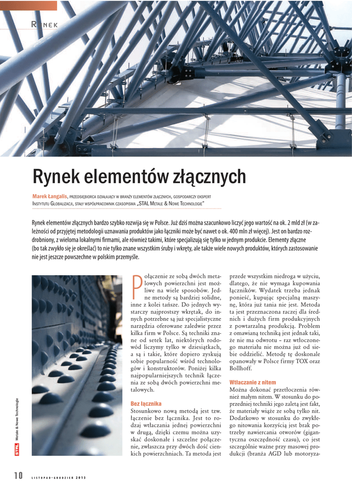RYNEK Rynek elementów złącznych Marek Łangalis, PRZEDSIĘBIORCA DZIAŁAJĄCY W BRANŻY ELEMENTÓW ZŁĄCZNYCH, GOSPODARCZY EKSPERT INSTYTUTU GLOBALIZACJI, STAŁY WSPÓŁPRACOWNIK CZASOPISMA „STAL METALE & NOWE TECHNOLOGIE” Rynek elementów złącznych bardzo szybko rozwija się w Polsce. Już dziś można szacunkowo liczyć jego wartość na ok. 2 mld zł (w zależności od przyjętej metodologii uznawania produktów jako łączniki może być nawet o ok. 400 mln zł więcej). Jest on bardzo rozdrobniony, z wieloma lokalnymi firmami, ale również takimi, które specjalizują się tylko w jednym produkcie. Elementy złączne (bo tak zwykło się je określać) to nie tylko znane wszystkim śruby i wkręty, ale także wiele nowych produktów, których zastosowanie nie jest jeszcze powszechne w polskim przemyśle. ołączenie ze sobą dwóch metalowych powierzchni jest możliwe na wiele sposobów. Jedne metody są bardziej solidne, inne z kolei tańsze. Do jednych wystarczy najprostszy wkrętak, do innych potrzebne są już specjalistyczne narzędzia oferowane zaledwie przez kilka firm w Polsce. Są techniki znane od setek lat, niektórych rodowód liczymy tylko w dziesiątkach, a są i takie, które dopiero zyskują sobie popularność wśród technologów i konstruktorów. Poniżej kilka najpopularniejszych technik łączenia ze sobą dwóch powierzchni metalowych. Metale & Nowe Technologie P 10 Bez łącznika Stosunkowo nową metodą jest tzw. łączenie bez łącznika. Jest to rodzaj wtłaczania jednej powierzchni w drugą, dzięki czemu można uzyskać doskonałe i szczelne połączenie, zwłaszcza przy dwóch dość cienkich powierzchniach. Ta metoda jest L I S T O P A D - G R U D Z I E Ń 2013 przede wszystkim niedroga w użyciu, dlatego, że nie wymaga kupowania łączników. Wydatek trzeba jednak ponieść, kupując specjalną maszynę, która już tania nie jest. Metoda ta jest przeznaczona raczej dla średnich i dużych firm produkcyjnych z powtarzalną produkcją. Problem z omawianą techniką jest jednak taki, że nie ma odwrotu – raz wtłoczonego materiału nie można już od siebie oddzielić. Metodę tę doskonale opanowały w Polsce firmy TOX oraz Bollhoff. Wtłaczanie z nitem Można dokonać przetłoczenia również małym nitem. W stosunku do poprzedniej techniki jego zaletą jest fakt, że materiały wiąże ze sobą tylko nit. Dodatkowo w stosunku do zwykłego nitowania korzyścią jest brak potrzeby nawiercania otworów (gigantyczna oszczędność czasu), co jest szczególnie ważne przy masowej produkcji (branża AGD lub motoryza- fot. Thinkstock RYNEK cyjna). Omawiana technika wymaga również specjalistycznego sprzętu. Zalecany jest dla firm z seryjną produkcją liczoną przynajmniej w dziesiątkach tysięcy, w których możliwość zautomatyzowania łączenia daje dużą oszczędność. W Polsce w sprzedaży elementów i technologii (zarówno ręcznej, jak i automatycznej) do wtłaczania nitów specjalizuje się niemiecka firma Bollhoff. Nitowanie Nity pełne Skoro już nitowanie zostało wywołane do tablicy, trzeba wspomnieć o klasycznym jego aspekcie. Tradycyjne nity pełne są często wykorzystywane w połączeniach zarówno o lekkim, jak i średnim natężeniu pracy. Mogą one znaleźć zastosowanie w masowej produkcji, dzięki czemu montaż jest dosyć szybki przy wykorzystaniu specjalnej prasy. Nity pełne są stosunkowo powszechnym łącznikiem od ponad stu lat. Znajdują zastosowanie zarówno w motoryzacji, budownictwie, jak i w lekkich konstrukcjach (np. wózkach dziecięcych) czy też segregatorach do papieru. W Polsce występuje duża liczba producentów tego rodzaju nitów, szczególnie zlokalizowanych w okolicach Częstochowy, która jest zagłębiem właśnie produkcji wózków dziecięcych. reklama Jako miĊdzynarodowy producent elementów záącznych i usáugodawca, jesteĞmy jednym z wiodących dostawców technologii áączenia i systemów montaĪu w Europie i Ameryce. Nasze spektrum produktów to ponad 100 000 artykuáów, od czĊĞci standardowych do w peáni zautomatyzowanych systemów. Oferując szeroką gamĊ elementów záącznych najwyĪszej jakoĞci, zdobyliĞmy pozycjĊ kompetentnego partnera innowacyjnego przemysáu oraz dostawcy innowacyjnych technologii i usáug. Specjalizujemy siĊ w: Ŷ technologii gwintowej Ŷ zabezpieczaniu poáączeĔ Ŷ nitowaniu dla perfekcyjnych poáączeĔ Ŷ elementach rysunkowych i specjalnych Bollhoff Technika àączenia Sp. z o.o. 71 387 85 31 wewn. 40, [email protected] L I S T O P A D - G R U D Z I E Ń 2013 Metale & Nowe Technologie www.bollhoff.pl Niezawodny partner innowacyjnego przemysáu 11 RYNEK Metale & Nowe Technologie Nity zrywalne Oprócz nitowania z wykorzystaniem nitów pełnych powszechne stały się nity zrywalne. Są elementami bardzo tanimi w zakupie i prostymi w obsłudze. Znane są od 1916 roku, gdy zostały opatentowane przez rezerwistę brytyjskiej armii (pod nazwą POP rivets, która dziś należy do Emhart Teknologies, firmy obecnej również w Polsce). Metoda wymaga albo taniego narzędzia ręcznego (ceny od ok. 50 zł), albo – w przypadku średniej wielkości produkcji – pneumatycznej nitownicy (ceny od kilkuset do kilku tys. zł), albo – przy dużej produkcji – automatycznych elementów nitujących (ceny od 100 tys. zł wzwyż). Minusem jest fakt, że trzeba nawiercać otwory, i to dość dokładnie. Dodatkowo jedynym sposobem pozbycia się już raz użytego nitu jest wywiercenie otworu. Technika znajduje zastosowanie zarówno przy bardzo małej produkcji, wręcz jednostkowej, ale również w seryjnej. Znaleźć ją można praktycznie wszędzie: AGD, budownictwo, motoryzacja, elektronika. Nit zrywalny jest chyba najczęściej, obok śrub sześciokątnych, używanym łącznikiem. W Polsce znani są producenci nitów aluminiowostalowych, pozostałe pochodzą głównie z importu azjatyckiego. Oprócz tradycyjnych nitów zrywalnych mogą wystąpić również nit