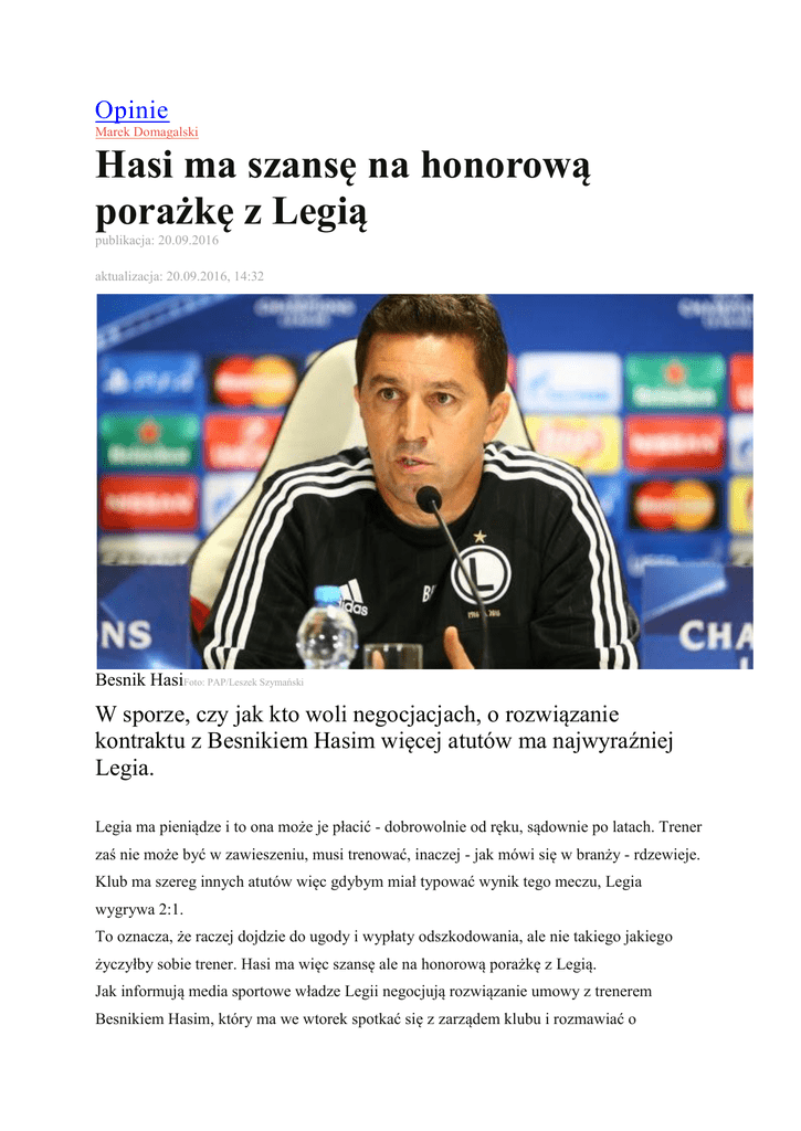 Opinie Marek Domagalski Hasi ma szansę na honorową porażkę z Legią publikacja: 20.09.2016 aktualizacja: 20.09.2016, 14:32 Besnik HasiFoto: PAP/Leszek Szymański W sporze, czy jak kto woli negocjacjach, o rozwiązanie kontraktu z Besnikiem Hasim więcej atutów ma najwyraźniej Legia. Legia ma pieniądze i to ona może je płacić - dobrowolnie od ręku, sądownie po latach. Trener zaś nie może być w zawieszeniu, musi trenować, inaczej - jak mówi się w branży - rdzewieje. Klub ma szereg innych atutów więc gdybym miał typować wynik tego meczu, Legia wygrywa 2:1. To oznacza, że raczej dojdzie do ugody i wypłaty odszkodowania, ale nie takiego jakiego życzyłby sobie trener. Hasi ma więc szansę ale na honorową porażkę z Legią. Jak informują media sportowe władze Legii negocjują rozwiązanie umowy z trenerem Besnikiem Hasim, który ma we wtorek spotkać się z zarządem klubu i rozmawiać o rozwiązaniu kontraktu. Trener ma żądać 1,5 mln euro odszkodowania tj. ponad 6 mln zł. Nie znamy szczegółów kontraktu trenerskiego, wiadomo, że przewiduje odszkodowania w razie przedterminowego zwolnienia, a umowa opiewa do końca sezonu 2017/18. Atutem Hasima może być ta umowa, pod warunkiem, że jest dla niego korzystna, ale wiemy, że Legia ma doświadczenie w ich zawieraniu. Oprócz umowy strony sporu wiążą bezwzględne regulacje Polskiego Związku Piłki Nożnej, w szczególności uchwała zarządu PZPN nr XII/189 z 12 grudnia 2014 roku dotycząca zasad regulujących stosunki pomiędzy klubem sportowym a trenerem piłki nożnej. I tak kontrakt trenerski może być rozwiązany w każdym czasie za porozumieniem, ale ta najprostsza formuła ma jedną poważną wadę wymaga zgody obu stron. W razie nie przyjęcia przez trenera takiej propozycji, klub może zwolnić go z obowiązku świadczenia usług trenerskich z zachowaniem prawa do wynagrodzenia - do czasu wygaśnięcia kontraktu. Bardzo możliwe, że owe 1,5 mln.euro to właśnie suma tego wynagrodzenie, nie wiadomo jednak czy tylko dla trenera czy też jego asystentów, a to by je zmniejszało. Co ważniejsze w tym przejściowym okresie trener nie może świadczyć usług trenerskich w innym klubie. I tu zaczynają się schody. - Wynagrodzenie jest ważne, ale trener nie może wypaść z branży na dłużej, musi trenować, gdyż status pobierającego tylko pieniądze jest kłopotliwy dla jego dalszej kariery - wskazuje mec. Kazimierz Romaniec, specjalista od prawa sportowego. - Nie przypuszczam też, aby chciał pójść do sądów, bo to wymaga czasu i wydatków, ale będzie szukał jakiejś formy mediacji. Niezależnie jaką ścieżkę wybierze musi brać jednak pod uwagę, że jego praca w Legii jest powszechnie oceniana negatywnie i stanowi swoistą kontynuację niepowodzeń z Anderlechtu Bruksela – dodaje. Krytycznych ocen nie brakuje i nie są tylko natury ściśle sportowej, jak ta o wypowiedzi trenera sprzed meczu z Borussią Dortmund: - Kiedy z Anderlechtem grałem przeciwko Borussii, przez pierwsze pół godziny nie potrafiliśmy wyjść z własnej połowy; w środę przy Łazienkowskiej może być podobnie ... Czy to była zachęta do walki?