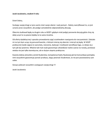 Jacek Jacukowicz, student II roku Dzień Dobry, Szukając swojej drogi w życiu warto mieć swoje zdanie i swój pomysł… Należy zweryfikować to, co jest uznane przez wszystkich, ale podjąć samodzielnie odpowiedzialną decyzję. Obecnie studiował będę na drugim roku w WSZP i gdybym miał podjąć ponownie decyzję gdzie chcę się dalej uczyć to na pewno byłaby to ta sama Uczelnia. Od oferty dydaktycznej i sposobu prowadzenia zajęć oczekiwałem nawiązania do rzeczywistości. Zależało mi na tym bym ucząc się poruszał kwestie, z którymi mierzę się obecnie i mierzył się będę. W WSZP praktycznie każde zajęcia to warsztaty, ćwiczenia, dyskusje i możliwość weryfikacji tego, co dzieje się z tym jak być powinno. Właśnie taki tryb nauki gwarantuje człowiekowi realne szanse na rozwój, ponieważ wiedza nie jest tylko teoretyczna, ale w dużym stopniu praktyczna. Kwestia dobrej atmosfery wśród Studentów, kompetencji Kadry Naukowej jak też komunikacji pomiędzy nimi wszystkimi gwarantuje jasność przekazu, dając pewność Studentowi, że nie jest pozostawiony sam sobie. Gorąco polecam wszystkim szukającym swojej drogi !!! Jacek Jacukowicz