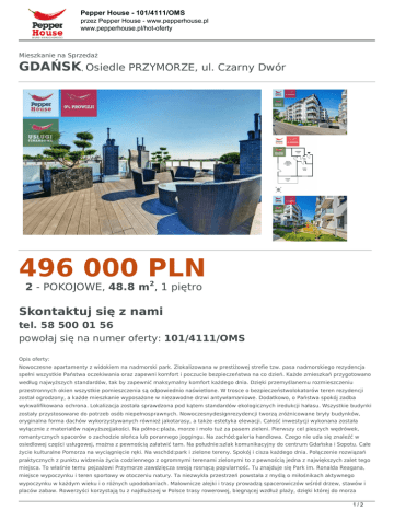 Pepper House - 101/4111/OMS przez Pepper House - www.pepperhouse.pl www.pepperhouse.pl/hot-oferty Mieszkanie na Sprzedaż GDAŃSK, Osiedle PRZYMORZE, ul. Czarny Dwór 496 000 PLN 2 - POKOJOWE, 48.8 m2, 1 piętro Skontaktuj się z nami tel. 58 500 01 56 powołaj się na numer oferty: 101/4111/OMS Opis oferty: Nowoczesne apartamenty z widokiem na nadmorski park. Zlokalizowana w prestiżowej strefie tzw. pasa nadmorskiego rezydencja spełni wszystkie Państwa oczekiwania oraz zapewni komfort i poczucie bezpieczeństwa na co dzień. Każde zmieszkań przygotowano według najwyższych standardów, tak by zapewnić maksymalny komfort każdego dnia. Dzięki przemyślanemu rozmieszczeniu przestronnych okien wszystkie pomieszczenia są odpowiednio naświetlone. W trosce o bezpieczeństwolokatorów teren rezydencji został ogrodzony, a każde mieszkanie wyposażone w niezawodne drzwi antywłamaniowe. Dodatkowo, o Państwa spokój zadba wykwalifikowana ochrona. Lokalizacja została sprawdzona pod kątem standardów ekologicznych iredukcji hałasu. Wszystkie budynki zostały przystosowane do potrzeb osób niepełnosprawnych. Nowoczesnydesignrezydencji tworzą zróżnicowane bryły budynków, oryginalna forma dachów wykorzystywanych również jakotarasy, a także estetyka elewacji. Całość inwestycji wykonana została wyłącznie z materiałów najwyższejjakości. Na północ:plaża, morze i molo tuż za pasem zieleni. Pierwszy cel pieszych wędrówek, romantycznych spacerów o zachodzie słońca lub porannego joggingu. Na zachód:galeria handlowa. Czego nie uda się znaleźć w osiedlowej części usługowej, można z pewnością załatwić tam. Na południe:szlak komunikacyjny do centrum Gdańska i Sopotu. Całe życie kulturalne Pomorza na wyciągnięcie ręki. Na wschód:park i zielone tereny. Spokój i cisza każdego dnia. Połączenie rozwiązań praktycznych z punktu widzenia życia codziennego z ogromnymi terenami zielonymi to z pewnością jedna z największych zalet tego miejsca. To właśnie temu pejzażowi Przymorze zawdzięcza swoją rosnącą popularność. Tu znajduje się Park im. Ronalda Reagana, miejsce wypoczynku i teren sportowy w otoczeniu natury. Ta niezwykła przestrzeń powstała z myślą o miłośnikach aktywnego wypoczynku w każdym wieku i o różnych upodobaniach. Malownicze alejki i trasy prowadzą spacerowiczów wśród drzew, stawów i placów zabaw. Rowerzyści korzystają tu z najdłuższej w Polsce trasy rowerowej, biegnącej wzdłuż plaży, dzięki której do morza 1/2 Pepper House - 101/4111/OMS przez Pepper House - www.pepperhouse.pl www.pepperhouse.pl/hot-oferty można dotrzeć w 5 minut, a do sopockiego molo - w jedyne 20 minut! Pepper House - tel. (58) 500 00 30 Więcej podobnych ofert na www.pepperhouse.pl Tylko u nas GWARANCJA najniższej ceny dzięki: - 0% prowizji od Kupującego - aktualnej cenie nieruchomości usługom finansowym Pepper House - preferencyjnej stawce u Notariusza Tylko u nas GWARANCJA bezpieczeństwa dzięki: - obsłudze prawnej Kancelarii Koprowski Gąsior Gierzyńska Ludwichowska - nadzorowi licencjonowanego Pośrednika (nr licencji 6884) - polisie OC w PZU SA - ubezpieczeniu kupowanej nieruchomości (szczegóły na naszej stronie). 2/2 Powered by TCPDF (www.tcpdf.org)