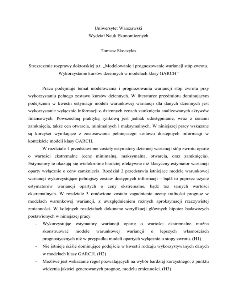 Uniwersytet Warszawski Wydział Nauk Ekonomicznych Tomasz Skoczylas Streszczenie rozprawy doktorskiej p.t. „Modelowanie i prognozowanie wariancji stóp zwrotu. Wykorzystanie kursów dziennych w modelach klasy GARCH” Praca podejmuje temat modelowania i prognozowania wariancji stóp zwrotu przy wykorzystaniu pełnego zestawu kursów dziennych. W literaturze przedmiotu dominującym podejściem w kwestii estymacji modeli warunkowej wariancji dla danych dziennych jest wykorzystanie wyłącznie informacji o dziennych cenach zamknięcia analizowanych aktywów finansowych. Powszechną praktyką rynkową jest jednak udostępnianie, wraz z cenami zamknięcia, także cen otwarcia, minimalnych i maksymalnych. W niniejszej pracy wskazane są korzyści wynikające z zastosowania pełniejszego zestawu dostępnych informacji w kontekście modeli klasy GARCH. W rozdziale 1 przedstawione zostały estymatory dziennej wariancji stóp zwrotu oparte o wartości ekstremalne (cenę minimalną, maksymalną, otwarcia, oraz zamknięcia). Estymatory te okazują się wielokrotnie bardziej efektywne niż klasyczny estymator wariancji oparty wyłącznie o ceny zamknięcia. Rozdział 2 przedstawia istniejące modele warunkowej wariancji wykorzystujące pełniejszy zestaw dostępnych informacji – bądź to poprzez użycie estymatorów wariancji opartych o ceny ekstremalne, bądź też samych wartości ekstremalnych. W rozdziale 3 omówione zostało zagadnienie oceny trafności prognoz w modelach warunkowej wariancji, z uwzględnieniem różnych aproksymacji rzeczywistej zmienności. W kolejnych rozdziałach dokonano weryfikacji głównych hipotez badawczych postawionych w niniejszej pracy: - Wykorzystując estymatory wariancji oparte o wartości ekstremalne można skonstruować modele warunkowej wariancji o lepszych własnościach prognostycznych niż w przypadku modeli opartych wyłącznie o stopy zwrotu. (H1) - Nie istnieje ściśle dominujące podejście w kwestii rodzaju wykorzystywanych danych w modelach klasy GARCH. (H2) - Możliwe jest wskazanie reguł pozwalających na wybór bardziej korzystnego, z punktu widzenia jakości generowanych prognoz, modelu zmienności. (H3) - Skuteczność reguły wyboru prognozy warunkowej wariancji zależy od rodzaju analizowanego aktywa. (H4) Rozdziały 4 i 6 pozytywnie weryfikują hipotezę H1. W rozdziale 4 pokazane zostało, iż zastosowanie modeli klasy GARCH wykorzystujących estymatory oparte o wartości ekstremalne często prowadzi do poprawy jakości prognoz warunkowej wariancji w stosunku do klasycznych modeli GARCH (opartych wyłącznie o stopy zwrotu). W rozdziale 6 zaproponowano autorską modyfikację modeli GARCH wykorzystującą estymator GarmanaKlassa i możliwą do zastosowania dla wszystkich modeli klasy GARCH zakładających normalny rozkład stóp zwrotu. Modele zaproponowane w rozdziale 6 lepiej radzą sobie z prognozowaniem zmienności w ogonach rozkładów empirycznych stóp zwrotu niż modele wyjściowe. W rozdziale 4 pozytywnie zweryfikowana została także hipoteza H2 – nie ma podstaw do uznania za prawdziwe stwierdzenia o dominacji któregokolwiek z dwóch analizowanych podejść. W rozdziale 5 zaproponowano autorski algorytm wyboru prognoz warunkowej wariancji. Algorytm ten, w oparciu o egzogeniczne zmienne, pozwala przewidywać relatywną trafność prognoz uzyskiwanych przy pomocy modeli GARCH wykorzystujących estymatory oparte o wartości ekstremalne i modeli GARCH opartych wyłącznie o stopy zwrotu. Istotna poprawa trafności prognoz uzyskiwanych przy pomocy algorytmu (w odniesieniu do modeli wyjściowych) pozwala uznać hipotezę H3 za prawdziwą. Okazuje się jednak, że skala korzyści odnoszonych z zastosowania algorytmu jest zależna od rodzaju analizowanego aktywa – co z kolei skłania do uznania hipotezy H4 za prawdziwą. Nadrzędnym celem niniejszej pracy było wykazanie, iż sensowne jest stosowanie zarówno modeli GARCH opartych wyłącznie o stopy zwrotu jak i modeli GARCH wykorzystujących estymatory oparte o wartości ekstremalne. Żadne z tych dwóch podejść nie powinno być z góry pomijane. Zdaniem autora istotnym wkładem niniejszej pracy w rozwój metod modelowania i prognozowania wariancji jest zaproponowanie nowej modyfikacji modeli GARCH, jak również zaprezentowanie autorskiego algorytmu wyboru prognoz warunkowej wariancji.
