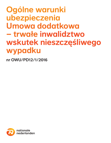 Ogólne warunki ubezpieczenia Umowa dodatkowa – trwałe inwalidztwo wskutek nieszczęśliwego wypadku nr OWU/PD12/1/2016 Spis treści Ogólne warunki ubezpieczenia Umowa dodatkowa – trwałe inwalidztwo wskutek nieszczęśliwego wypadku nr OWU/PD12/1/2016.............................................................................4 Art. 1 Co oznaczają używane pojęcia?.......................................4 Art. 2 Kogo ubezpiecza Nationale‑Nederlanden w ramach Umowy dodatkowej? Co obejmuje ubezpieczenie?...............................................4 Art. 3 Jak długo trwa Umowa dodatkowa?................................4 Art. 4 Czy można kontynuować ubezpieczenie?.....................5 Art. 5 Komu i jaką kwotę wypłaci Nationale‑Nederlanden?.......................................................5 Art. 6 Jakie są obowiązki ubezpieczonego?..............................6 Art. 7 Jak jest ustalana wysokość składki? Jak długo będzie opłacana?................................................6 Art. 8 Jak podwyższyć lub obniżyć Sumę ubezpieczenia?............................................................ 7 Art. 9 Co należy zrobić, aby Nationale‑Nederlanden wypłaciło pieniądze?.............................................................. 7 Art. 10 W jakich sytuacjach Nationale‑Nederlanden nie udziela ochrony ubezpieczeniowej i nie wypłaci pieniędzy?................................................................................... 7 Art. 11 Zastosowanie Warunków..................................................... 7 Art. 12 Wejście w życie Warunków Umowy dodatkowej........ 7 2| Informacje dotyczące: Ogólne warunki ubezpieczenia Umowa dodatkowa – trwałe inwalidztwo wskutek nieszczęśliwego wypadku nr OWU/PD12/1/2016 (OWU) Informacje zawarte w OWU Nr artykułu OWU 1. Przesłanki wypłaty odszkodowania i innych świadczeń lub wartości wykupu Ubezpieczenia Art. 1, Art. 2, Art. 3, Art. 5 OWU 2. Ograniczenia oraz wyłączenia odpowiedzialności zakładu ubezpieczeń uprawniające do odmowy wypłaty odszkodowania i innych świadczeń lub ich obniżenia Art. 3, Art. 10 OWU 3. Koszty oraz inne obciążenia potrącane ze składek ubezpieczeniowych, z aktywów ubezpieczeniowych funduszy kapitałowych lub poprzez umorzenie jednostek uczestnictwa ubezpieczeniowych funduszy kapitałowych. Nie dotyczy 4. Wartość wykupu ubezpieczenia w poszczególnych okresach trwania ochrony ubezpieczeniowej oraz okres, w którym roszczenie o wypłatę wartości wykupu nie przysługuje. Nie dotyczy |3 Ogólne warunki ubezpieczenia Umowa dodatkowa – trwałe inwalidztwo wskutek nieszczęśliwego wypadku nr OWU/PD12/1/2016 Umowa dodatkowa, oznaczona w polisie i innych dokumentach wystawionych przez Nationale‑Nederlanden kodem PD12, jest zawierana na podstawie Warunków oraz Ogólnych warunków ubezpieczenia Umowy dodatkowej – Trwałe inwalidztwo wskutek nieszczęśliwego wypadku nr OWU/PD12/1/2016 (dalej: Warunki Umowy dodatkowej). Art. 1 Co oznaczają używane pojęcia? 1.„Dziecko” – Ubezpieczony, który w chwili objęcia ochroną ubezpieczeniową ukończył 1 rok życia a nie ukończył 18. roku życia. 2. „Trwałe inwalidztwo całkowite” – uszkodzenie ciała doznane przez Ubezpieczonego wskutek Nieszczęśliwego wypadku, które spowodowało całkowitą, bezterminową i nieodwracalną niezdolność do wykonywania jakiejkolwiek pracy zarobkowej. Trwałe inwalidztwo całkowite Dziecka wiąże się z koniecznością zapewnienia całkowitej opieki lub pomocy w zaspokajaniu podstawowych potrzeb życiowych w sposób przewyższający zakres opieki nad zdrowym dzieckiem w danym wieku. 3. „Trwałe inwalidztwo częściowe” – fizyczna utrata części ciała albo całkowita i nieodwracalna utrata władzy w części ciała albo uszkodzenie ciała doznane przez Ubezpieczonego wskutek Nieszczęśliwego wypadku, określone w Tabeli inwalidztwa częściowego. 4. „Trwałe inwalidztwo” – Trwałe inwalidztwo całkowite lub Trwałe inwalidztwo częściowe. 5. „Nieszczęśliwy wypadek” – nagłe, wywołane przyczyną zewnętrzną, niezależne od woli Ubezpieczonego zdarzenie, które nastąpiło w czasie, w którym Nationale‑Nederlanden udzielało ochrony ubezpieczeniowej, i które stało się bezpośrednią i wyłączną przyczyną Trwałego inwalidztwa. W rozumieniu Warunków Umowy dodatkowej za przyczynę zewnętrzną, która wywołała Nieszczęśliwy wypadek, nie uważa się Choroby ani Choroby psychicznej. 6. „Suma ubezpieczenia” – kwota, która stanowi podstawę do obliczenia Świadczenia wypłacanego w przypadku zajścia Trwałego inwalidztwa. 7. „Postępowanie terapeutyczne” – postępowanie mające na celu przywrócenie zaburzonych na skutek Nieszczęśliwego wypadku funkcji poszczególnych organów. 8. „Choroba” – zdiagnozowana przez Lekarza reakcja organizmu na działanie czynnika chorobotwórczego, wewnętrznego lub zewnętrznego, prowadząca do zaburzeń czynnościowych, zmian organicznych w tkankach, narządach, układach lub całym ustroju. 9. „Choroba psychiczna” – choroba zakwalifikowana w Międzynarodowej Statystycznej Kwalifikacji Chorób i Problemów Zdrowotnych jako zaburzenie psychiczne lub zaburzenie zachowania (ICD-10). Art. 2 Kogo ubezpiecza Nationale‑Nederlanden w ramach Umowy dodatkowej? Co obejmuje ubezpieczenie? 1. Ochroną ubezpieczeniową może zostać objęta osoba, która ukończyła 1. rok życia i nie ukończyła 71. roku życia. 2. Nationale‑Nederlanden ubezpiecza zdrowie Ubezpieczonego. 3. Ubezpieczenie obejmuje Trwałe inwalidztwo Ubezpieczonego, które nastąpiło nie później niż przed upływem 180 dni, licząc od dnia zajścia Nieszczęśliwego wypadku. Art. 3 Jak długo trwa Umowa dodatkowa? 1. Umowa dodatkowa zawierana jest: a) na 5 lat albo b) do najbliższej 5. rocznicy trwania Umowy od dokupienia Umowy dodatkowej, jednak na okres nie krótszy niż 4 lata i 1 Miesiąc polisowy. 2. Umowa 