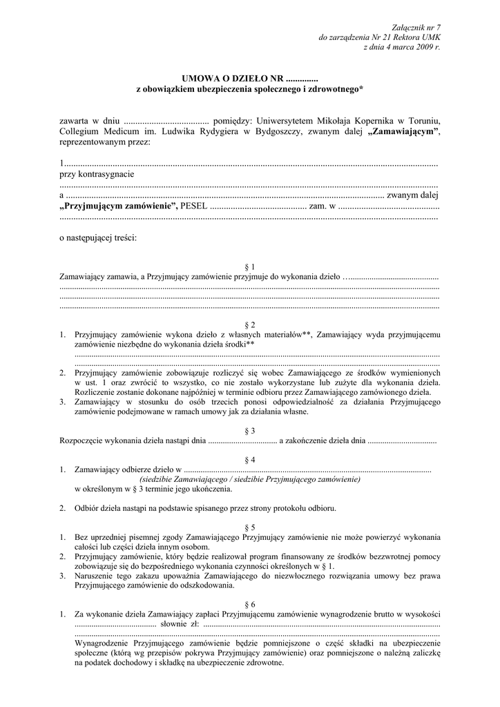 Załącznik nr 7 do zarządzenia Nr 21 Rektora UMK z dnia 4 marca 2009 r. UMOWA O DZIEŁO NR .............. z obowiązkiem ubezpieczenia społecznego i zdrowotnego* zawarta w dniu ..................................... pomiędzy: Uniwersytetem Mikołaja Kopernika w Toruniu, Collegium Medicum im. Ludwika Rydygiera w Bydgoszczy, zwanym dalej „Zamawiającym”, reprezentowanym przez: 1.................................................................................................................................................................. przy kontrasygnacie .................................................................................................................................................................... a .......................................................................................................................................... zwanym dalej „Przyjmującym zamówienie”, PESEL .......................................... zam. w ............................................ .................................................................................................................................................................... o następującej treści: §1 Zamawiający zamawia, a Przyjmujący zamówienie przyjmuje do wykonania dzieło ….......................................... ..................................................................................................................................................................................... ..................................................................................................................................................................................... ..................................................................................................................................................................................... 1. 2. 3. §2 Przyjmujący zamówienie wykona dzieło z własnych materiałów**, Zamawiający wyda przyjmującemu zamówienie niezbędne do wykonania dzieła środki** .............................................................................................................................................................................. .............................................................................................................................................................................. Przyjmujący zamówienie zobowiązuje rozliczyć się wobec Zamawiającego ze środków wymienionych w ust. 1 oraz zwrócić to wszystko, co nie zostało wykorzystane lub zużyte dla wykonania dzieła. Rozliczenie zostanie dokonane najpóźniej w terminie odbioru przez Zamawiającego zamówionego dzieła. Zamawiający w stosunku do osób trzecich ponosi odpowiedzialność za działania Przyjmującego zamówienie podejmowane w ramach umowy jak za działania własne. §3 Rozpoczęcie wykonania dzieła nastąpi dnia ................................. a zakończenie dzieła dnia ................................. 1. 2. 1. 2. 3. 1. §4 Zamawiający odbierze dzieło w ...................................................................................................................... (siedzibie Zamawiającego / siedzibie Przyjmującego zamówienie) w określonym w § 3 terminie jego ukończenia. Odbiór dzieła nastąpi na podstawie spisanego przez strony protokołu odbioru. §5 Bez uprzedniej pisemnej zgody Zamawiającego Przyjmujący zamówienie nie może powierzyć wykonania całości lub części dzieła innym osobom. Przyjmujący zamówienie, który będzie realizował program finansowany ze środków bezzwrotnej pomocy zobowiązuje się do bezpośredniego wykonania czynności określonych w § 1. Naruszenie tego zakazu upoważnia Zamawiającego do niezwłocznego rozwiązania umowy bez prawa Przyjmującego zamówienie do odszkodowania. §6 Za wykonanie dzieła Zamawiający zapłaci Przyjmującemu zamówienie wynagrodzenie brutto w wysokości ....................................... słownie zł: ................................................................................................................. .............................................................................................................................................................................. Wynagrodzenie Przyjmującego zamówienie będzie pomniejszone o część składki na ubezpieczenie społeczne (którą wg przepisów pokrywa Przyjmujący zamówienie) oraz pomniejszone o należną zaliczkę na podatek dochodowy i składkę na ubezpieczenie zdrowotne. 2. Wynagrodzenie płatne będzie przelewem na bankowy rachunek oszczędnościowo-rozliczeniowy w terminie wypłaty wynagrodzeń na podstawie przedłożonego rachunku, z limitu ..................................................... .............................................................................................................................................................................. (nazwa środków płatniczych – źródło finansowania) §7 Do przyjęcia wykonanego dzieła Zamawiający upoważnia p. .................................................................................. (który/a potwierdzi to na rachunku Przyjmującego zamówienie). 1. 2. §8 W razie zwłoki w wykonaniu dzieła: 1) Przyjmujący zamówienie zobowiązany jest do zapłaty kary umownej w wysokości ............................. % wynagrodzenia umownego określonego w § 6 ust. 1 za każdy dzień zwłoki; 2) Zamawiający może odstąpić od umowy, gdy zwłoka przekroczy okres .................................................... oraz żądać kary umownej określonej w pkt. 1. Zamawiającemu przysługuje prawo dochodzenia odszkodowania przewyższającego karę umowną. §9 Przyjmujący zamówienie oświadcza, że: 1) jest pracownikiem Uniwersytetu Mikołaja Kopernika zatrudnionym na podstawie umowy o pracę lub mianowania, 2) umowa nie będzie wykonywana w ramach pozarolniczej działalności gospoda