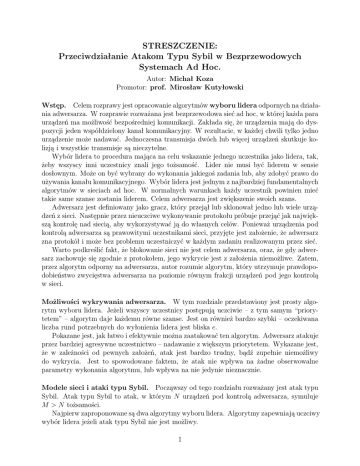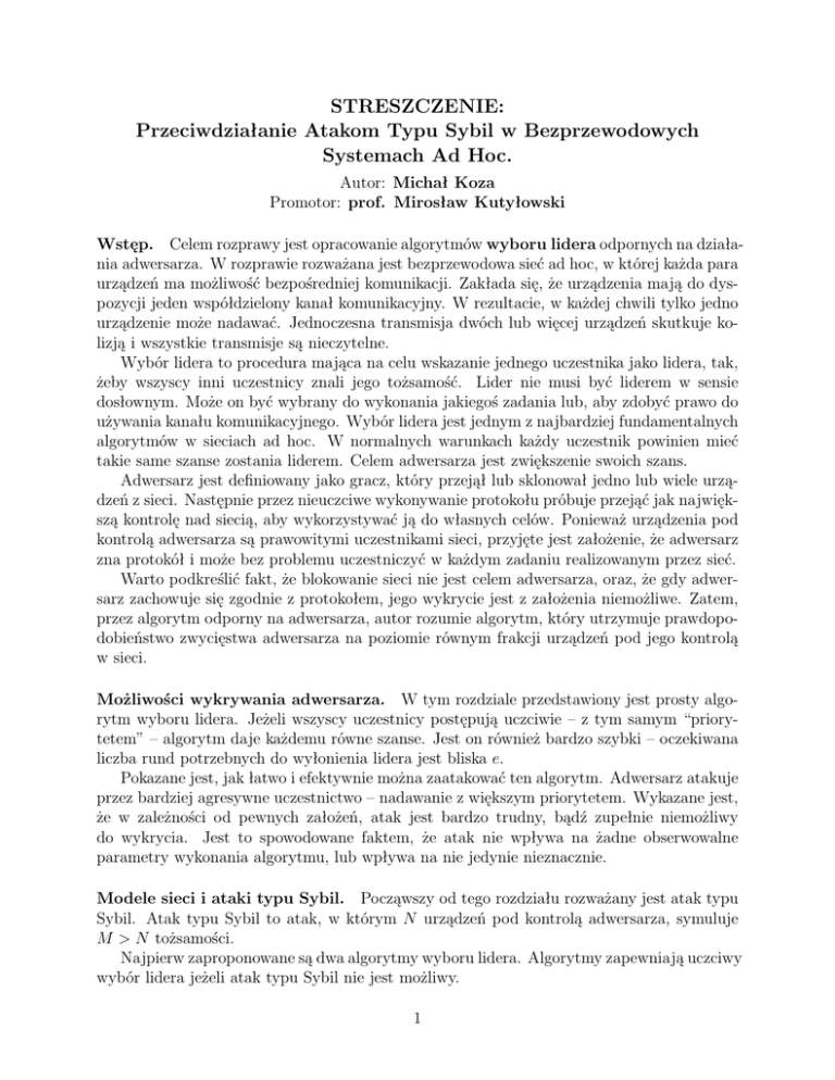 STRESZCZENIE: Przeciwdziałanie Atakom Typu Sybil w Bezprzewodowych Systemach Ad Hoc. Autor: Michał Koza Promotor: prof. Mirosław Kutyłowski Wstęp. Celem rozprawy jest opracowanie algorytmów wyboru lidera odpornych na działania adwersarza. W rozprawie rozważana jest bezprzewodowa sieć ad hoc, w której każda para urządzeń ma możliwość bezpośredniej komunikacji. Zakłada się, że urządzenia mają do dyspozycji jeden współdzielony kanał komunikacyjny. W rezultacie, w każdej chwili tylko jedno urządzenie może nadawać. Jednoczesna transmisja dwóch lub więcej urządzeń skutkuje kolizją i wszystkie transmisje są nieczytelne. Wybór lidera to procedura mająca na celu wskazanie jednego uczestnika jako lidera, tak, żeby wszyscy inni uczestnicy znali jego tożsamość. Lider nie musi być liderem w sensie dosłownym. Może on być wybrany do wykonania jakiegoś zadania lub, aby zdobyć prawo do używania kanału komunikacyjnego. Wybór lidera jest jednym z najbardziej fundamentalnych algorytmów w sieciach ad hoc. W normalnych warunkach każdy uczestnik powinien mieć takie same szanse zostania liderem. Celem adwersarza jest zwiększenie swoich szans. Adwersarz jest definiowany jako gracz, który przejął lub sklonował jedno lub wiele urządzeń z sieci. Następnie przez nieuczciwe wykonywanie protokołu próbuje przejąć jak największą kontrolę nad siecią, aby wykorzystywać ją do własnych celów. Ponieważ urządzenia pod kontrolą adwersarza są prawowitymi uczestnikami sieci, przyjęte jest założenie, że adwersarz zna protokół i może bez problemu uczestniczyć w każdym zadaniu realizowanym przez sieć. Warto podkreślić fakt, że blokowanie sieci nie jest celem adwersarza, oraz, że gdy adwersarz zachowuje się zgodnie z protokołem, jego wykrycie jest z założenia niemożliwe. Zatem, przez algorytm odporny na adwersarza, autor rozumie algorytm, który utrzymuje prawdopodobieństwo zwycięstwa adwersarza na poziomie równym frakcji urządzeń pod jego kontrolą w sieci. Możliwości wykrywania adwersarza. W tym rozdziale przedstawiony jest prosty algorytm wyboru lidera. Jeżeli wszyscy uczestnicy postępują uczciwie – z tym samym “priorytetem” – algorytm daje każdemu równe szanse. Jest on również bardzo szybki – oczekiwana liczba rund potrzebnych do wyłonienia lidera jest bliska e. Pokazane jest, jak łatwo i efektywnie można zaatakować ten algorytm. Adwersarz atakuje przez bardziej agresywne uczestnictwo – nadawanie z większym priorytetem. Wykazane jest, że w zależności od pewnych założeń, atak jest bardzo trudny, bądź zupełnie niemożliwy do wykrycia. Jest to spowodowane faktem, że atak nie wpływa na żadne obserwowalne parametry wykonania algorytmu, lub wpływa na nie jedynie nieznacznie. Modele sieci i ataki typu Sybil. Począwszy od tego rozdziału rozważany jest atak typu Sybil. Atak typu Sybil to atak, w którym N urządzeń pod kontrolą adwersarza, symuluje M > N tożsamości. Najpierw zaproponowane są dwa algorytmy wyboru lidera. Algorytmy zapewniają uczciwy wybór lidera jeżeli atak typu Sybil nie jest możliwy. 1 Następnie, wykazane jest, że atak typu Sybil stanowi poważne zagrożenie dla protokołu wyboru lidera, oraz, że atak taki trudno jest wykryć. W końcu, zaproponowany jest zarys algorytmu wyboru lidera, który jest odporny na atak typu Sybil przeprowadzany przez pojedyncze urządzenie adwersarza. Algorytm może być stosowany w sieciach, w których urządzenia nie mogą nadawać i słuchać w tym samym czasie. Wykorzystuje on fakt, że gdy urządzenie adwersarza nadaje jako jedna z symulowanych tożsamości, wówczas wszystkie tożsamości tracą informację o stanie kanału. Nie wiedzą czy transmisja została zagłuszona, czy nie. Algorytm wymaga stworzenia listy wszystkich tożsamości kandydujących o miano lidera. Najpierw wyłaniany jest kandydat na lidera. Następnie wszystkie pozostałe tożsamości są weryfikowane – czy nie są kontrolowane przez to samo urządzenie, co kandydat na lidera. Wykazane jest, że wszystkie inne tożsamości kandydata kontrolowanego przez adwersarza zostają wykryte z dużym prawdopodobieństwem. Problemem jest fakt, że sam kandydat nie jest zweryfikowany. Nie może on zostać usunięty, nawet gdy wydaje się podejrzany. Jest tak dlatego, że adwersarz może łatwo rzucić nieprawdziwe podejrzenie na uczciwego kandydata na lidera. Jednak modyfikacja protokołu, pozwalająca na tymczasowe zawieszenie podejrzanego kandydata na lidera rozwiązuje ten problem. W jej rezultacie adwersarz, decydując się na atak typu Sybil, ponosi ryzyko większe niż potencjalne zyski. Ostatecznie z punktu widzenia adwersarza optymalnie jest postępować zgodnie z protokołem. Algorytm listowania. W tym rozdziale zaproponowany jest algorytm listowania odporny na ataki typu Sybil. Algorytm bazuje na algorytmie z poprzedniego rozdziału. Jest efektywny nawet przeciwko kilku współpracującym urządzeniom adwersarza. Algorytm ten dokonuje weryfikacji wszystkich tożsamości. Zatem, oprócz wyboru lidera umożliwia również uczciwy listing. W przypadku agresywnego ataku, złożoność algorytmu może bardzo rosnąć. Jednak znów, dzięki konstrukcji algorytmu, optymalnym zachowaniem dla adwersarza jest postępowanie zgodnie z protokołem, co zniechęca go do ataku i pozwala oczekiwać niskiej złożoności protokołu. Podejście Proof of Work do ataków typu Sybil. W ostatnim rozdziale zaproponowane są dwa algorytmy wyboru lidera. Algorytmy bazują na koncepcji Proof of Work, czyli dowodu wykonanej pracy. Ideą algorytmów jest to, że każde urządzenie musi spędzić dużo czasu (poświęcić znaczną ilość pewnego zasobu), aby autoryzować swoją tożsamość. W rezultacie, każde urządzenie jest zdolne do autoryzowania tylko jednej tożsamości. Algorytmy różnią się głównie złożonością. Pierwszy – bardziej czasochłonny jest również minimalnie b