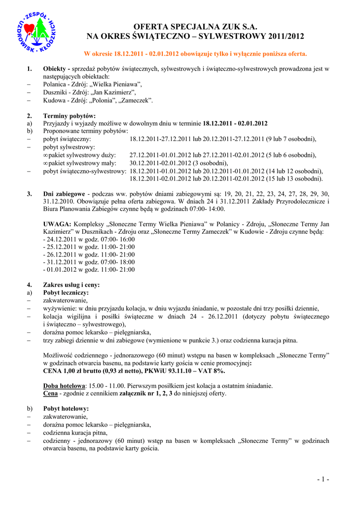 OFERTA SPECJALNA ZUK S.A. NA OKRES ŚWIĄTECZNO – SYLWESTROWY 2011/2012 W okresie 18.12.2011 - 02.01.2012 obowiązuje tylko i wyłącznie poniższa oferta. 1. − − − 2. a) b) − − − 3. Obiekty - sprzedaż pobytów świątecznych, sylwestrowych i świąteczno-sylwestrowych prowadzona jest w następujących obiektach: Polanica - Zdrój: „Wielka Pieniawa”, Duszniki - Zdrój: „Jan Kazimierz”, Kudowa - Zdrój: „Polonia”, „Zameczek”. Terminy pobytów: Przyjazdy i wyjazdy możliwe w dowolnym dniu w terminie 18.12.2011 - 02.01.2012 Proponowane terminy pobytów: pobyt świąteczny: 18.12.2011-27.12.2011 lub 20.12.2011-27.12.2011 (9 lub 7 osobodni), pobyt sylwestrowy: • pakiet sylwestrowy duży: 27.12.2011-01.01.2012 lub 27.12.2011-02.01.2012 (5 lub 6 osobodni), • pakiet sylwestrowy mały: 30.12.2011-02.01.2012 (3 osobodni), pobyt świąteczno-sylwestrowy: 18.12.2011-01.01.2012 lub 20.12.2011-01.01.2012 (14 lub 12 osobodni), 18.12.2011-02.01.2012 lub 20.12.2011-02.01.2012 (15 lub 13 osobodni). Dni zabiegowe - podczas ww. pobytów dniami zabiegowymi są: 19, 20, 21, 22, 23, 24, 27, 28, 29, 30, 31.12.2010. Obowiązuje pełna oferta zabiegowa. W dniach 24 i 31.12.2011 Zakłady Przyrodolecznicze i Biura Planowania Zabiegów czynne będą w godzinach 07:00- 14:00. UWAGA: Kompleksy „Słoneczne Termy Wielka Pieniawa” w Polanicy - Zdroju, „Słoneczne Termy Jan Kazimierz” w Dusznikach - Zdroju oraz „Słoneczne Termy Zameczek” w Kudowie - Zdroju czynne będą: - 24.12.2011 w godz. 07:00- 16:00 - 25.12.2011 w godz. 11:00- 21:00 - 26.12.2011 w godz. 11:00- 21:00 - 31.12.2011 w godz. 07:00- 18:00 - 01.01.2012 w godz. 11:00- 21:00 4. a) − − − − − Zakres usług i ceny: Pobyt leczniczy: zakwaterowanie, wyżywienie: w dniu przyjazdu kolacja, w dniu wyjazdu śniadanie, w pozostałe dni trzy posiłki dziennie, kolacja wigilijna i posiłki świąteczne w dniach 24 - 26.12.2011 (dotyczy pobytu świątecznego i świąteczno – sylwestrowego), doraźna pomoc lekarsko – pielęgniarska, trzy zabiegi dziennie w dni zabiegowe (wymienione w punkcie 3.) oraz codzienna kuracja pitna. Możliwość codziennego - jednorazowego (60 minut) wstępu na basen w kompleksach „Słoneczne Termy” w godzinach otwarcia basenu, na podstawie karty gościa w cenie promocyjnej: CENA 1,00 zł brutto (0,93 zł netto), PKWiU 93.11.10 – VAT 8%. Doba hotelowa: 15.00 - 11.00. Pierwszym posiłkiem jest kolacja a ostatnim śniadanie. Cena - zgodnie z cennikiem załącznik nr 1, 2, 3 do niniejszej oferty. b) − − − − Pobyt hotelowy: zakwaterowanie, doraźna pomoc lekarsko – pielęgniarska, codzienna kuracja pitna, codzienny - jednorazowy (60 minut) wstęp na basen w kompleksach „Słoneczne Termy” w godzinach otwarcia basenu, na podstawie karty gościa. -1- Istnieje możliwość wykupienia posiłków: VP I - całodzienne wyżywienie - 43,00 zł śniadanie – 11,00 zł obiad - 19,00 zł kolacja - 13,00 zł Doba hotelowa: 15.00 - 11.00. Pierwszym posiłkiem jest kolacja a ostatnim śniadanie. 5. Wyżywienie świąteczne: w dniu Wigilii oraz w I i II dzień Świąt Bożego Narodzenia obowiązują poniższe ceny wyżywienia. Ceny wyżywienia w WIGILIĘ 24.12.2011 WYŻYWIENIE VP Cena: 68,00 zł Śniadanie cena: 10,00 zł Obiad cena; 14,00 zł Kolacja cena: 44,00 zł Ceny wyżywienia w ŚWIĘTA BOŻEGO NARODZENIA – 25. i 26.12.2011 WYŻYWIENIE VP Cena: 68,00 zł Śniadanie cena: 17,00 zł Obiad cena; 31,00 zł Kolacja cena: 20,00 zł DOPŁATA DO WYŻYWIENIA ŚWIĄTECZNEGO 24 - 26.12.2011*: 25,00 zł brutto dziennie za osobę UWAGA: w dzień Sylwestra kolacja będzie podawana w godzinach wcześniejszych. 6. a) c) Usługi wliczone w cenę pobytu: Uroczysta kolacja wigilijna (24.12.2011) z tradycyjnymi, polskimi daniami wigilijnymi oraz koncertem kolęd. W dniach 25 i 26.12.2011 serwowane będą posiłki wg świątecznego menu (tradycyjne polskie dania świąteczne). Spotkanie informacyjne połączone ze spacerem po kurorcie we wszystkich trzech oddziałach. 7. Usługi dodatkowe – bale sylwestrowe: a) − Oddział Polanica Zdrój: Sanatorium „Wielka Pieniawa”: Sylwester w stylu „VIVA LAS VEGAS”, w programie sylwestrowe menu, zespół muzyczny na żywo, konkursy z nagrodami. UWAGA: w dzień Sylwestra kolacja zostanie podana o godzinie 16.30 – 17.00. Cena balu: 320,00 zł/os. b) − Oddział Kudowa Zdrój: Sanatorium „Polonia”: Sylwester w HAWAJSKICH RYTMACH, w programie sylwestrowe menu, zespół muzyczny na żywo, konkursy z nagrodami. UWAGA: w dzień Sylwestra kolacja zostanie podana o godzinie 16.30 – 17.00. Cena balu: 280,00 zł/os. 8. Możliwość skorzystania z dodatkowych usług organizowanych przez firmy zewnętrzne za dodatkową opłatą: b) -2- a) − − b) − − − c) − − Oddział Polanica Zdrój: wycieczki po okolicy – informacji udziela IT tel.074 8682444, [email protected] imprezy kulturalne – informacji udziela Miejskie Centrum Kultury, tel 074 8690643 Duszniki Zdrój: wycieczki po okolicy – informacji udziela IT tel. 074 8669413, [email protected] imprezy kulturalne – Dworek im. F. Chopina, tel. 074 8669426 sport i rekreacja – stacja sportów zimowych „Zieleniec” – IT tel. 0748669413 Kudowa Zdrój: wycieczki po okolicy – informacji udziela IT tel. 074 8661387, [email protected] imprezy kulturalne – Kudowski Ośrodek Kultury, Sportu i Rekreacji, tel. 074 8664056 -3-